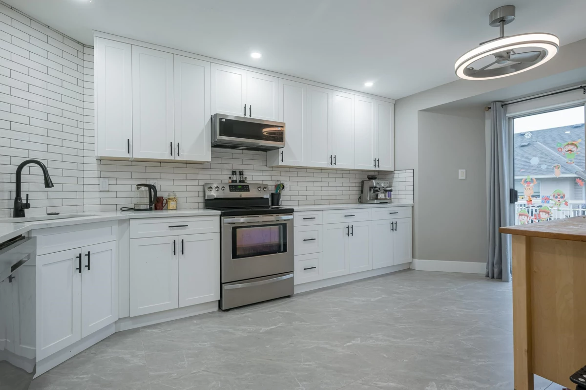 FULLY RENOVATED 5 bed, 3 bath end unit with dbl garage well located close to High Street Shopping Centre. Thousands spent on high end renovations inc. white shaker kitchen with quartz counters, ss appl and tile floor. Large Primary bdrm with walk-in closet, luxurious 5 pce ensuite inc. custom shower with heated bench and floors, double sink vanity. Nicely updated main bath with tile feature wall and custom cabinets. Downstairs inc a 2nd Primary Bdrm with elec. f/p feature wall, walk in closet with make up table and access to rear patio. 2 more good size bdrms. Rec room with elec. f/p stone feature wall and large screen tv. Fabulous 5 pce bath with custom walk in shower soaker tub combo. Custom mouldings, new carpets and lighting throughout. All Poly-b has been upgraded to PEX!