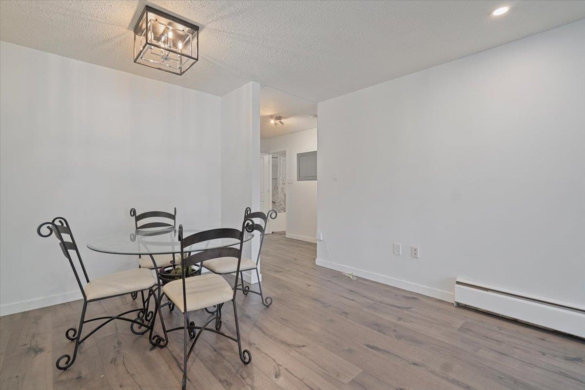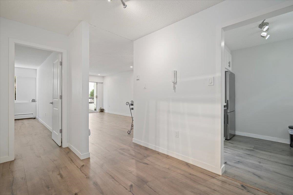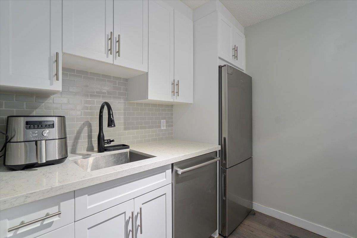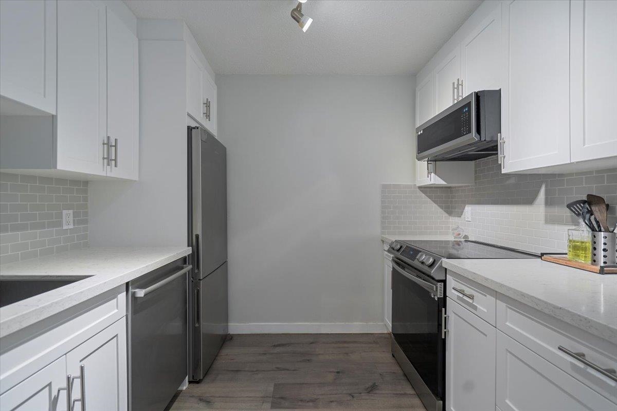 Welcome to this tastefully updated 1-bedroom, 1-bathroom home in a prime location! This bright and modern space offers a newly renovated kitchen with stainless steel appliances, quartz countertops, and custom cabinetry. The open-concept layout features updated flooring, a stylish bathroom with marble countertops, and a spacious bedroom with generous closet space. Updated lighting to brighten up your living space. Step outside to your private patio—perfect for morning coffee or evening unwinding. Located in a well-maintained complex close to transit, shopping, and parks, this is an ideal opportunity for first-time buyers or investors. Why do any work when it is done for you. A must-see!