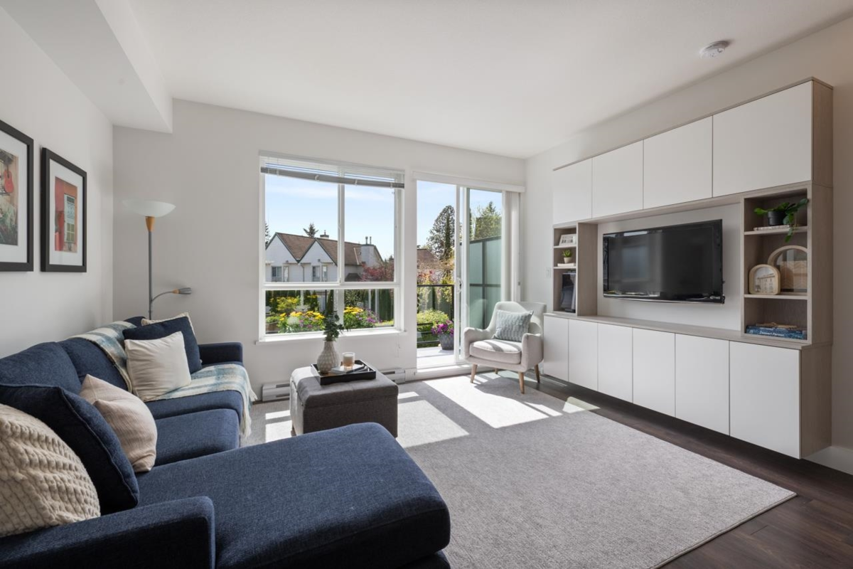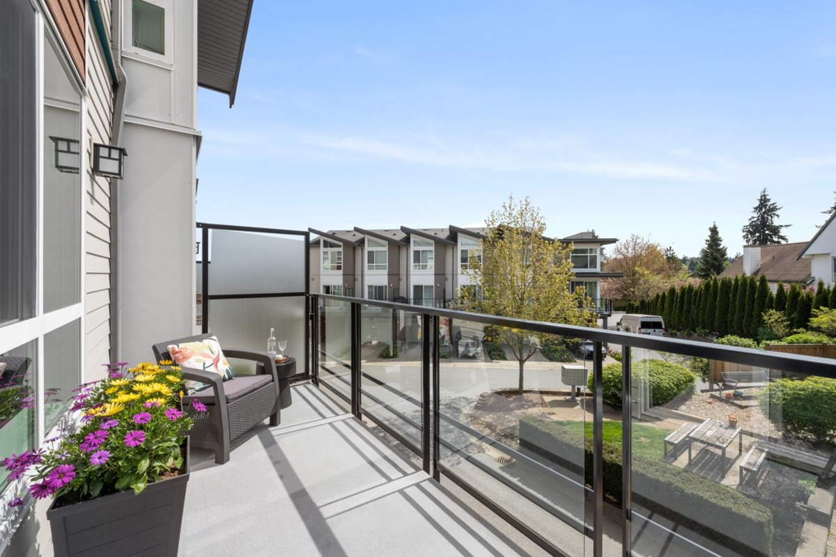 'Clarke' – a collection of 21 contemporary townhomes ideally situated minutes away from schools, shopping, parks, Ocean & Evergreen Line. Step into the comfort & efficiency. This 3-bdrm home is featuring an open-plan kitchen, 3 baths & seamless indoor outdoor living with patio and nearly 14’ south facing balcony off main level. When in POMO storage is a requirement! Say hello to your double tandem garage w/11ft ceilings & extra storage space. 9’ ceilings, laminate floors, kitchen island w/ built-in seating & powder room. Retreat to the upper level where a king-sized primary suite awaits w/generous walk-in closet & 3 piece ensuite, vaulted ceilings & mountain views. Laundry room on the top floor. This is your invitation to come & appreciated it for yourself.