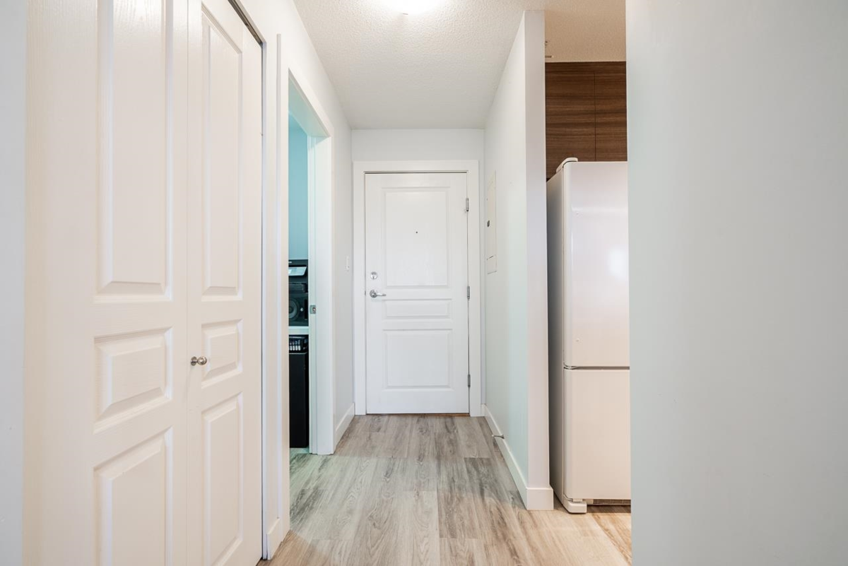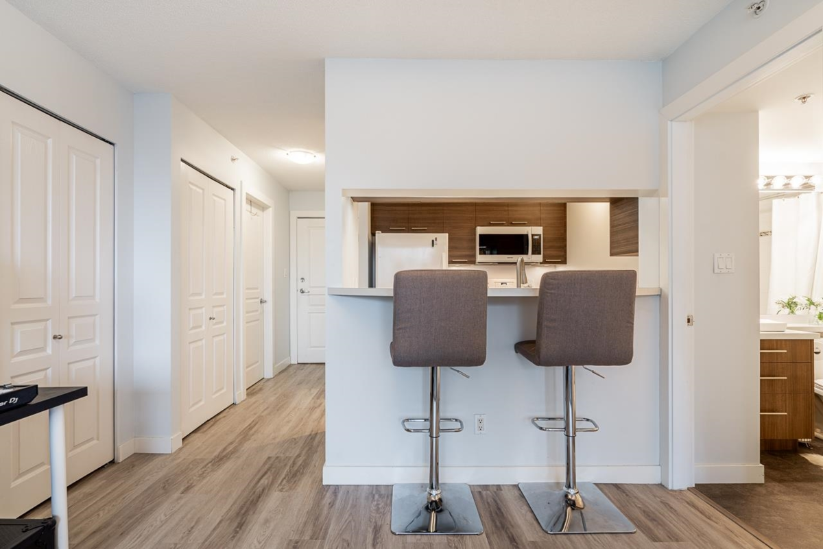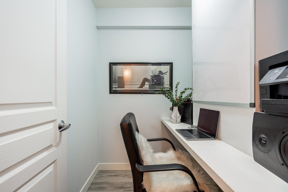 Welcome to Emerald Park Place. This bright and modern 1 bedroom plus den home offers an open-concept layout with updated kitchen cabinetry, newer stove, dishwasher, and microwave, along with upgraded vinyl flooring featuring enhanced soundproofing. The unit is exceptionally quiet and well insulated. The den includes a built-in desk, ideal for working from home, and the living space is complemented by heat-resistant blinds and a built-in A/C mount for year-round comfort. Enjoy stunning, unobstructed 180° city and mountain views that flood the home with natural light. Additional features include in-suite laundry, 1 parking stall, and access to a fully equipped gym. The building has a newer elevator and is located just steps from Joyce SkyTrain, restaurants, parks, and nearby sports courts.
