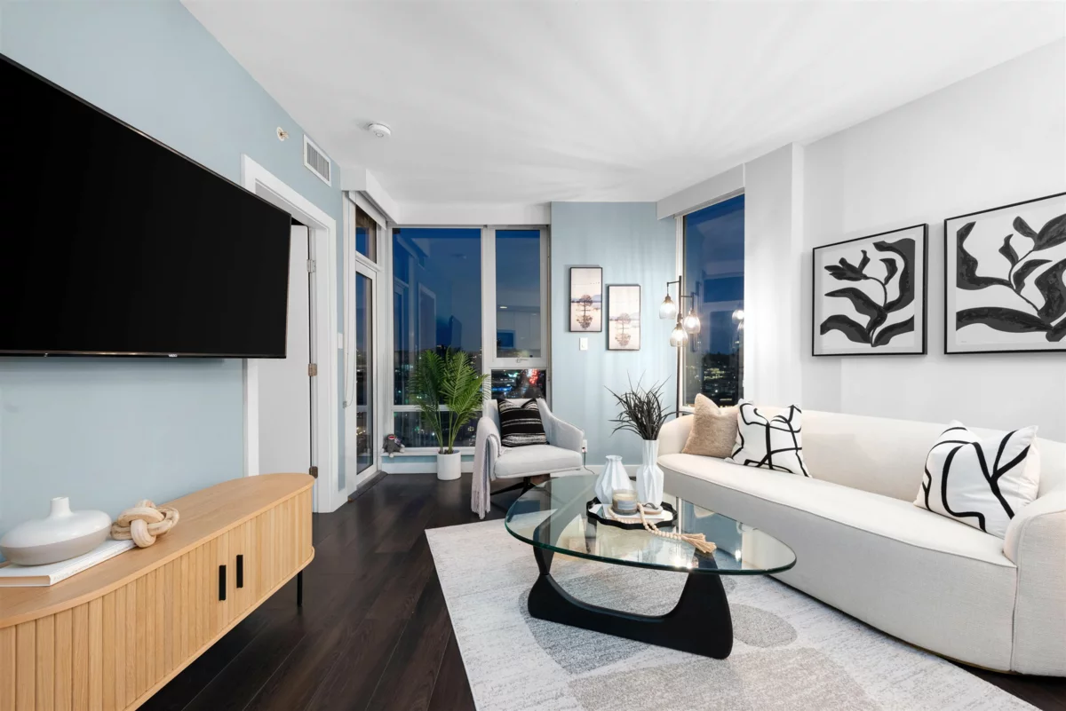 Welcome to Central by Onni! This spacious well maintained 644 Sq ft 1-bedroom & den is located in the highly sought-after Olympic Village. You will enjoy sunny, and private, south-facing views, high ceiling and an open-concept living area. The home features engineered hardwood flooring & is equipped w/ A/C. The building provides fantastic amenities: 24-hour concierge, a communal rooftop terrace/garden, theatre & other impressive recreational facilities. Don't miss your chance to own this fabulous home! Just steps away from local shops, restaurants, the famous Sea Wall, Science World, Canada Line, and Mount Pleasant. With direct access to downtown and the SkyTrain, convenience and connectivity are at your doorstep!