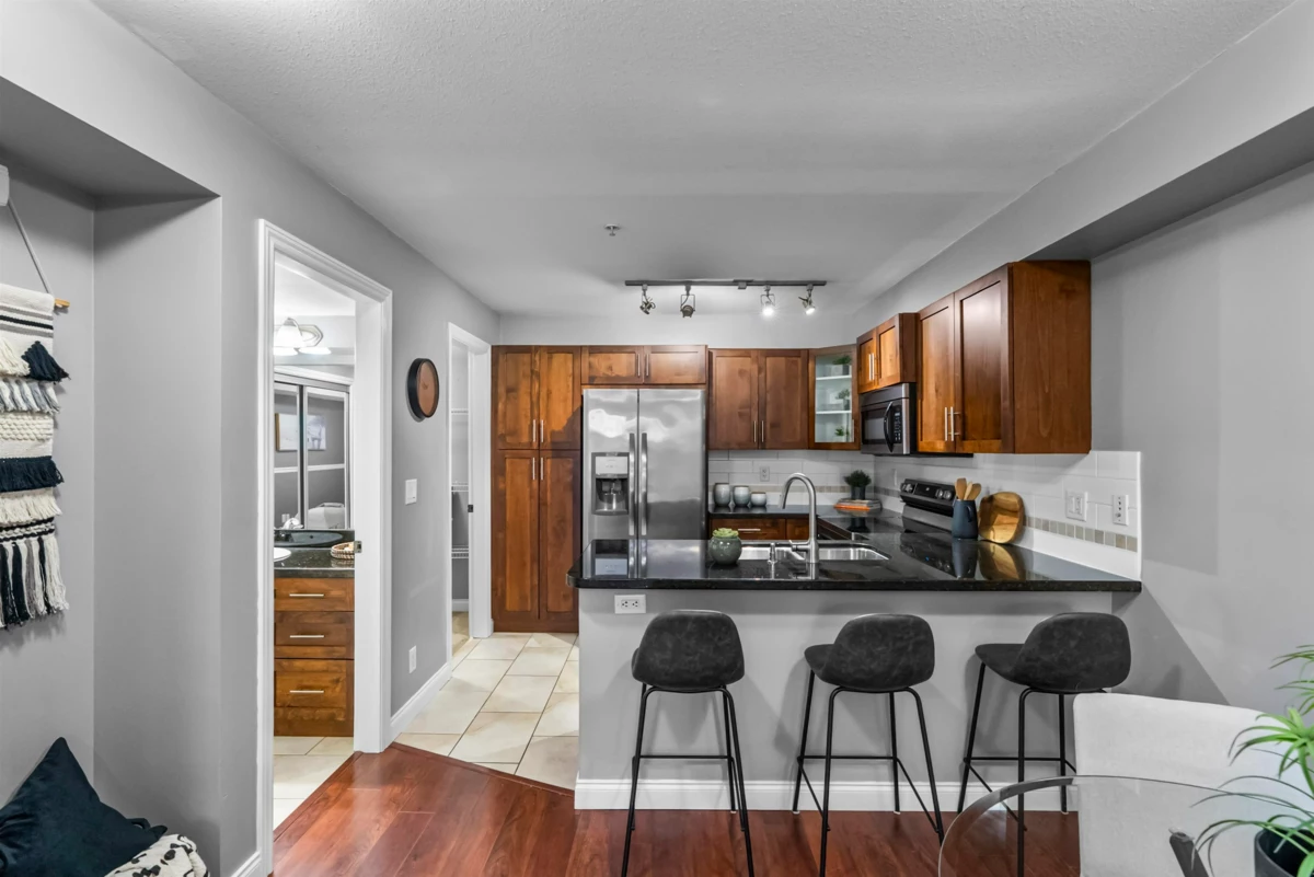 Immaculate one-bedroom ground floor condo is a must see. Bright, open layout features granite countertops, stainless steel appliances, and a semi-ensuite bathroom. New carpet in bedroom and den/storage space, fresh paint throughout, and updated light fixtures create a modern, welcoming space. Perfectly positioned ground-floor unit in a well-maintained building with stunning courtyard. Prime location just 100m from transit, steps to shopping, dining, recreation, casino, and town center. Flexible for investors and pet lovers - rentals permitted, pets allowed with restrictions. This spotless home is ready for even the most discerning buyer. Book your showing today!
