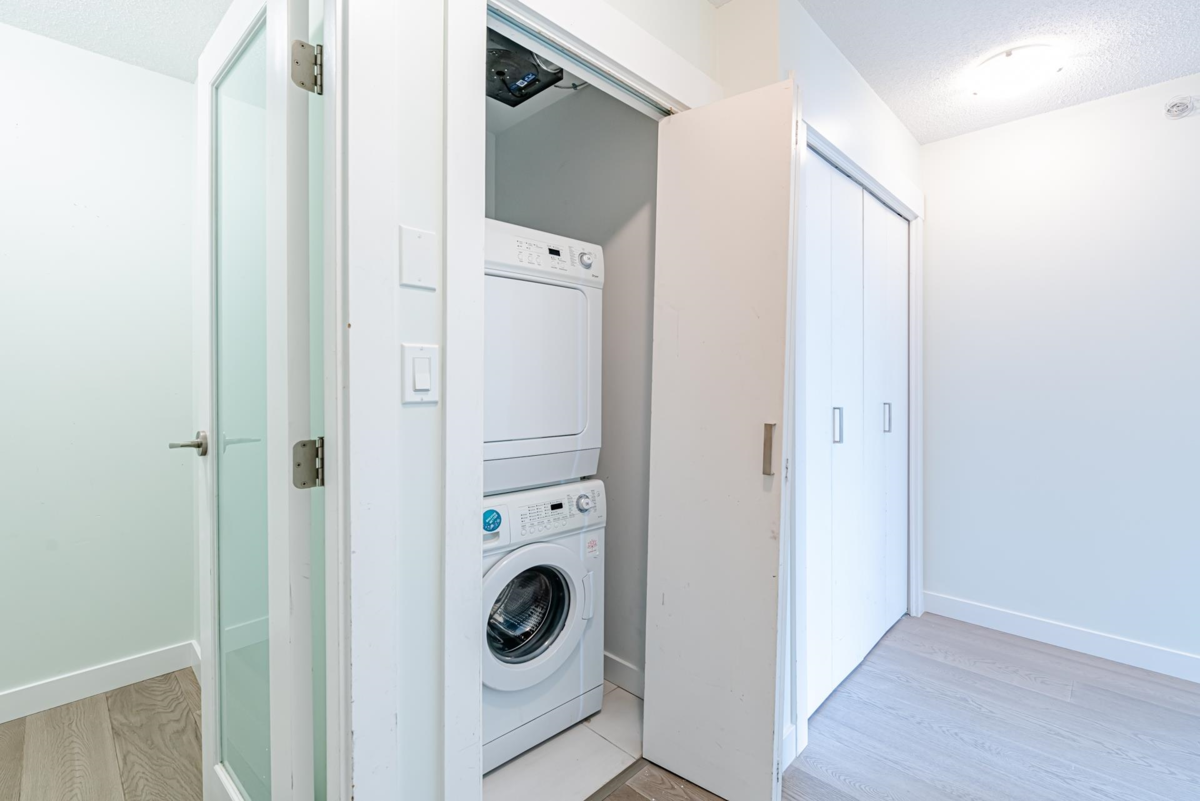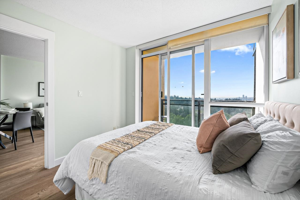 New flooring and Painting! This is beautiful ONE BEDROOM plus a DEN unit on 18th floor has exceptional view of Fraser River and downtown of New Westminster. Laminate Flooring, stainless steel kitchen appliances, in-suite laundry and Granite Countertops, Open Floor plan. Less than a min walk to Gateway SkyTrain, 15 mins to Metrotown and 30 mins to downtown Vancouver. Walking distance to Shopping, Surrey City Centre Public Library, T&T, SFU, Restaurants, Coffee Shops.
