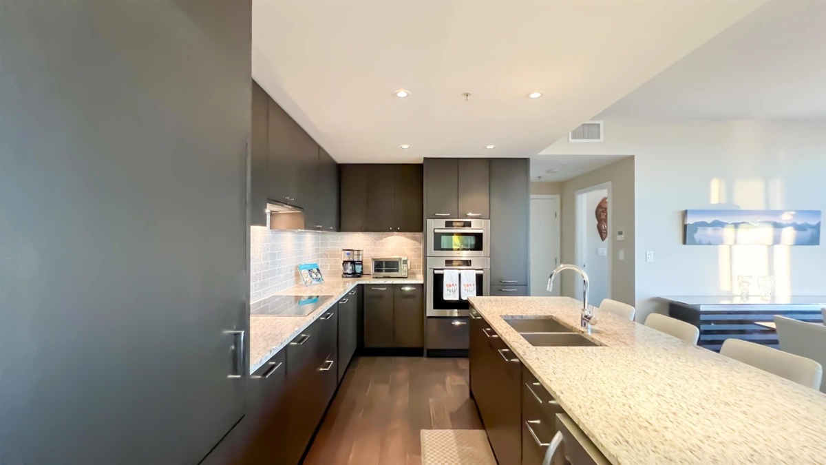 Welcome to this luxurious 3 bed, 3 bath, 1,395sqft, private 2 car garage, sub-penthouse at 15 West. Unobstructed views of Burrard Inlet, Downtown, Lions Gate Bridge & the NS Mountains. High-end finishes throughout: air conditioning, granite countertops/backsplash, Miele appliance package & wine fridge. The open plan layout is perfect for entertaining, with stunning floor to ceiling windows, over height ceilings, deluxe wide plank engineered hardwood flooring & SW facing balcony. The primary bedroom boasts westerly views, a walk-in wardrobe and spa like ensuite, with double sinks & stone tile. The 2nd bedroom has a murphy bed and access to a private S facing balcony. The 3rd bedroom is SW facing and is perfect for an office to enjoy the views all day long.