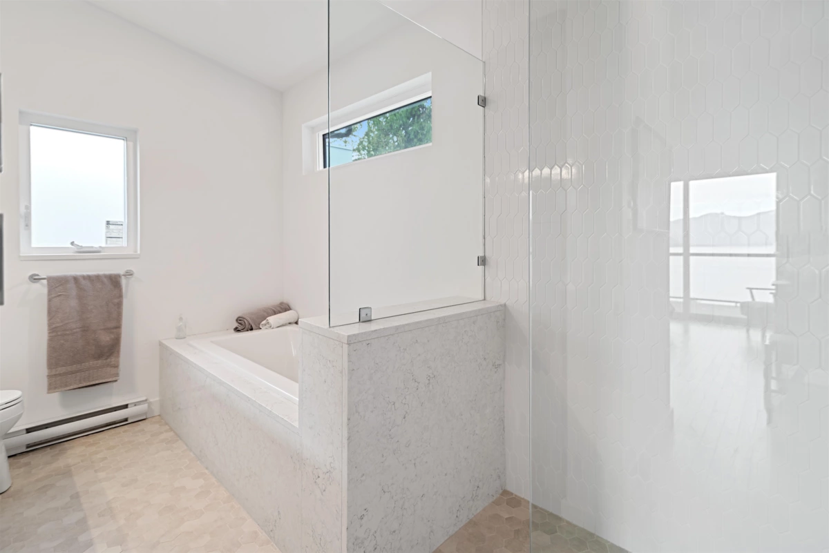 Panoramic View Home - modern luxury design - open concept with a well planned kitchen with Quartz waterfall counter/bar, gas range - high ceilings and loads of windows to soak in the sunshine. The large 16'4 X 11' Flex Room could be a bedroom, office, fitness or hobby room. Both floors have high ceilings 9' on lower level and approximately 12' on main. This is a home for a professional with many upscale features, huge deck for entertaining, 3/4 inch solid maple floors. Home is designed for low maintenance with metal roof and concrete board siding. and has 8 more years under warranty. Property is fenced. Bonus: R1 permits an auxilliary dwelling on the property. Walkscore: Walk to Ferry - Walk to Beach