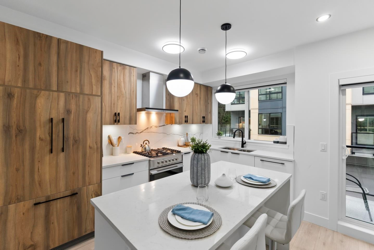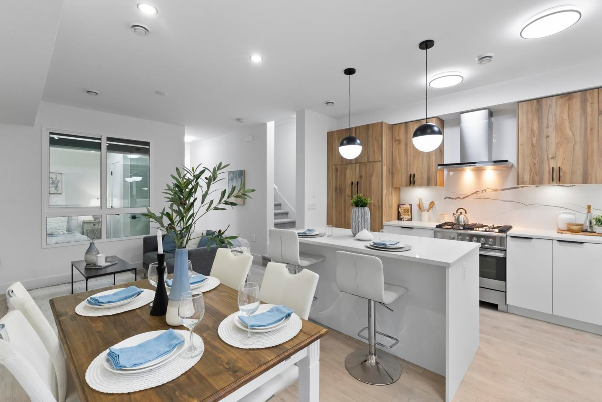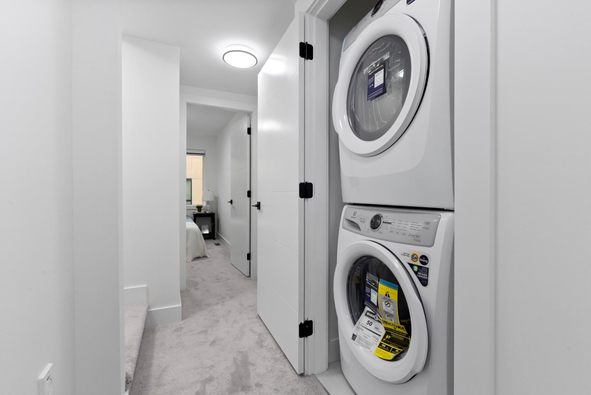 Brand-new, ultra-modern 3BR+Flex, 2-bath townhome surrounded by a protected greenspace with a private playground & amenity building perfect for your private events. The bright, airy main level features 9' ceilings, Fisher & Paykel appliances, motorized blinds, and a kitchen made for cooking enthusiasts with a gas cooktop, quartz countertops, and ample storage in custom cabinetry. Enjoy a ROOFTOP PATIO perfect for summer entertaining, complete with a gas BBQ hookup. Just a short drive to Hyland Elementary and Sullivan Heights Secondary & minutes to Newton Town Centre, shops, parks, transit, and major amenities.