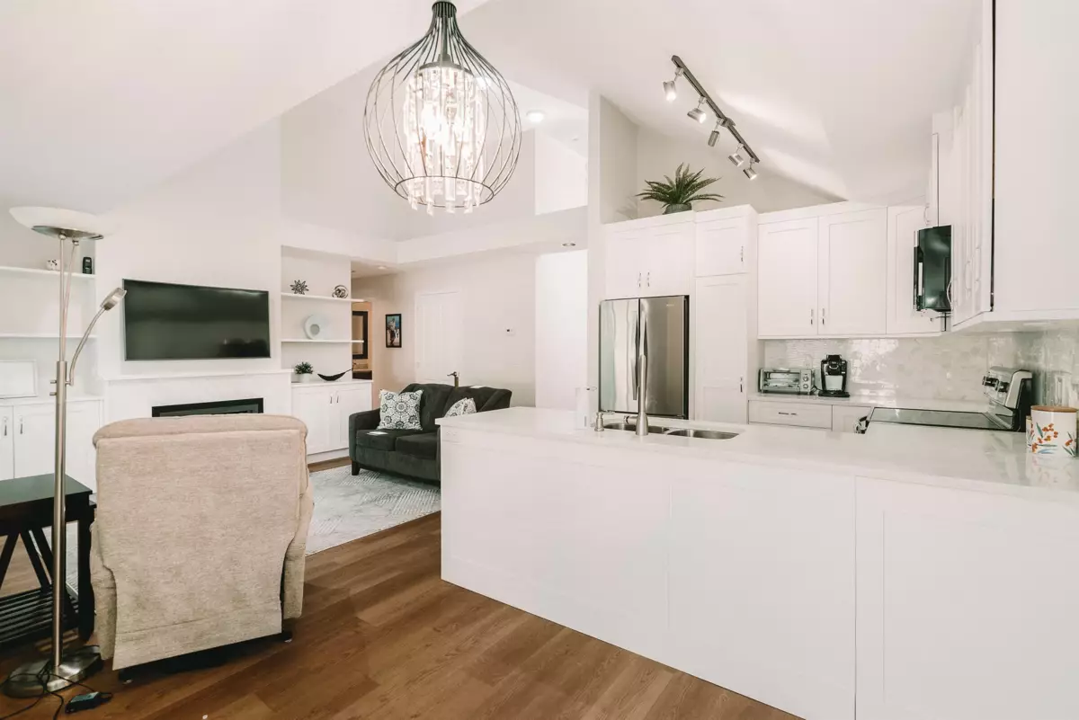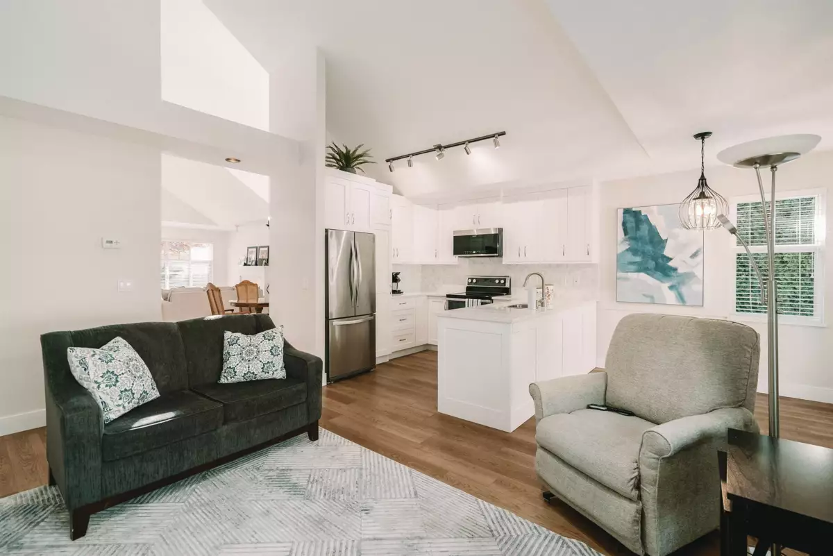 Sandhurst is a centrally located in a gated community. This unit is in a quiet peaceful complex featuring the primary bedroom on the main floor, vaulted ceilings and a open concept dining area great for family gatherings. Above is a full bath and two bedrooms. A fenced yard with garden and patio is perfect for the summer months and cool shade in the afternoons. Unit has a spacious double garage with plenty of room for storage and two large vehicles. Located near all amenities, shopping and restaurants.