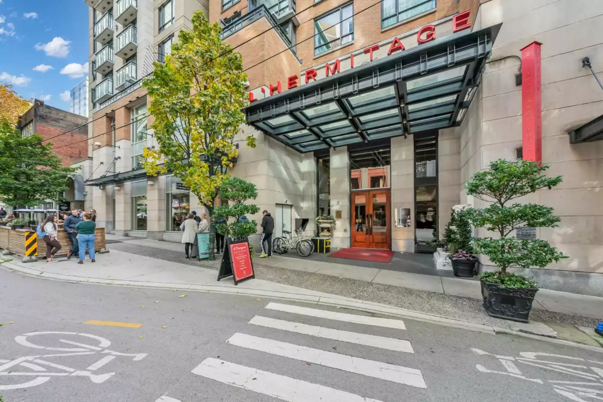 Welcome to the prestigious residences at L’Hermitage located in the vibrant core of Downtown Vancouver. This beautifully updated 1 Bed+Den home offers an open-concept layout that maximizes every inch of 617sqft. Step into a gourmet kitchen featuring granite countertops, Sub-Zero and Bosch stainless steel appliances, a 4-burner gas cooktop, and elegant brushed oak hardwood floors that flow seamlessly throughout. The spa-like bathroom is fully renovated with Bianco Carrara marble on the floors and shower, a separate tub and shower, NuHeat radiant flooring, and a custom vanity with Caesarstone countertops. Views of North Shore Mountains & Peekaboo Water. Resort-style amenities including 24-hour concierge, gym, steam room, and access to an outdoor pool & jacuzzi. 1 parking included.