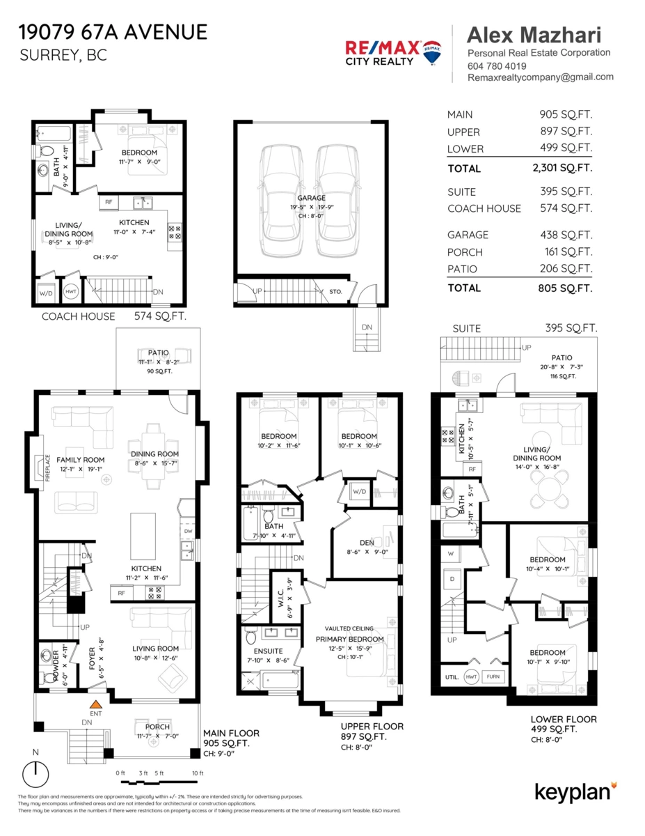 Welcome to one of the largest Coach Homes in Clayton Heights! Situated on a quiet, family-friendly street, this beautifully designed residence offers over 3,200 sqft of total living space across three fully self-contained areas — perfect for multi-generational living or rental income. The main home features 4 bedrooms upstairs, a bright and open main floor with off-white maple cabinetry, granite countertops, and stainless-steel appliances. Enjoy central air conditioning throughout and relax on your large, sunny south-facing veranda, perfect spot for your morning coffee. Below, you’ll find a licensed two-bedroom suite with its own laundry. The detached 500 sqft. legal coach home boasts vaulted ceilings separate parking & private laundry. Located just 3-minute walk to future Skytrain Station