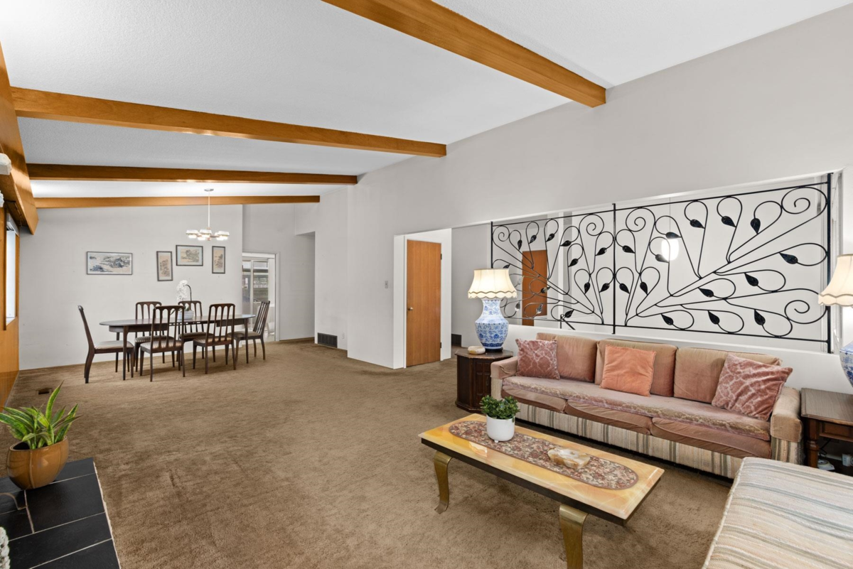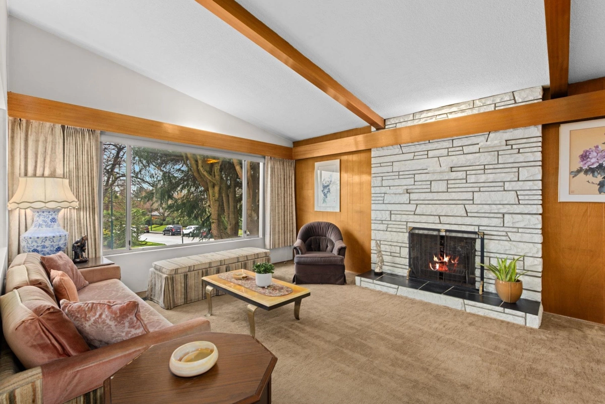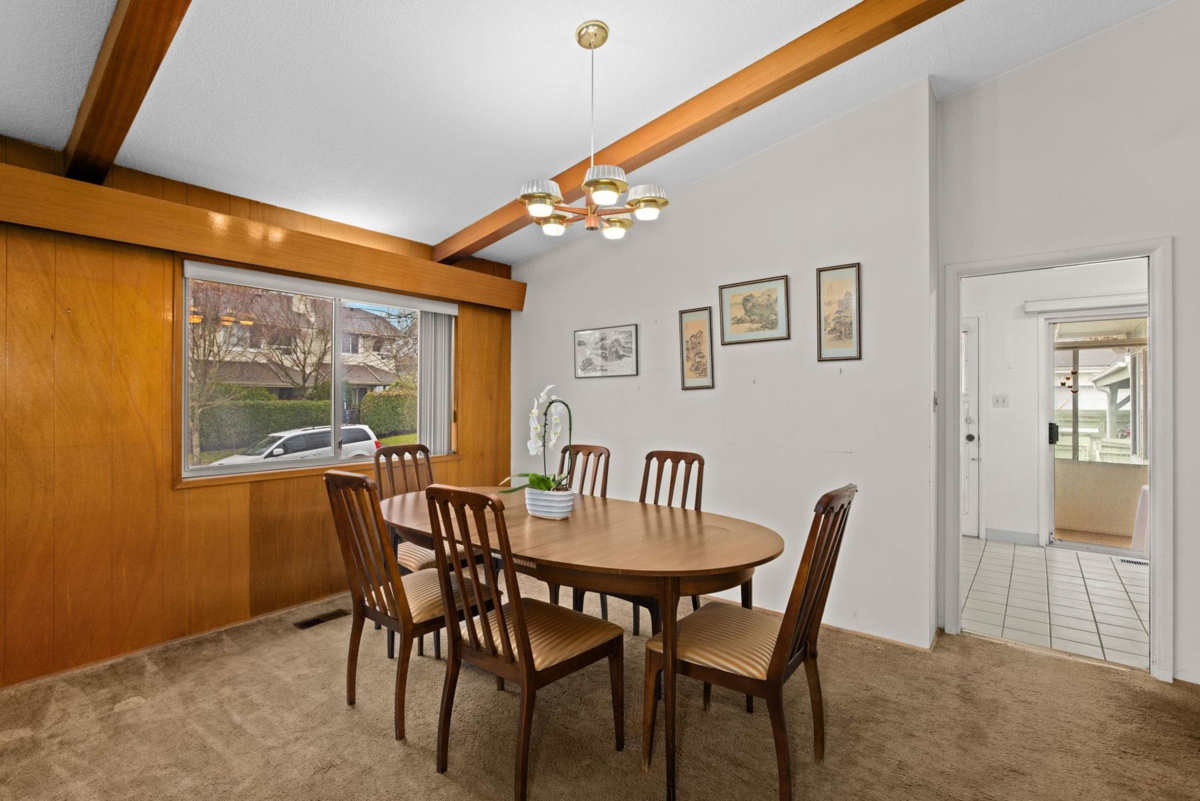 Well-maintained 6-bedroom, 3-bathroom family home on a prime corner lot in a family-friendly neighbourhood, just steps from J.W. Sexsmith Elementary. With over 2,700 sq ft of living space, this 2-storey residence offers incredible potential to live in, renovate, or redevelop. The main living room showcases vaulted ceilings, rich wood panelling, exposed beams, and a substantial stone fireplace. Large picture windows invite natural light and frame views of mature greenery. Ideal for a young family ready to modernize or a builder seeking a superb lot with great frontage. A unique opportunity with charm, location, and future upside.