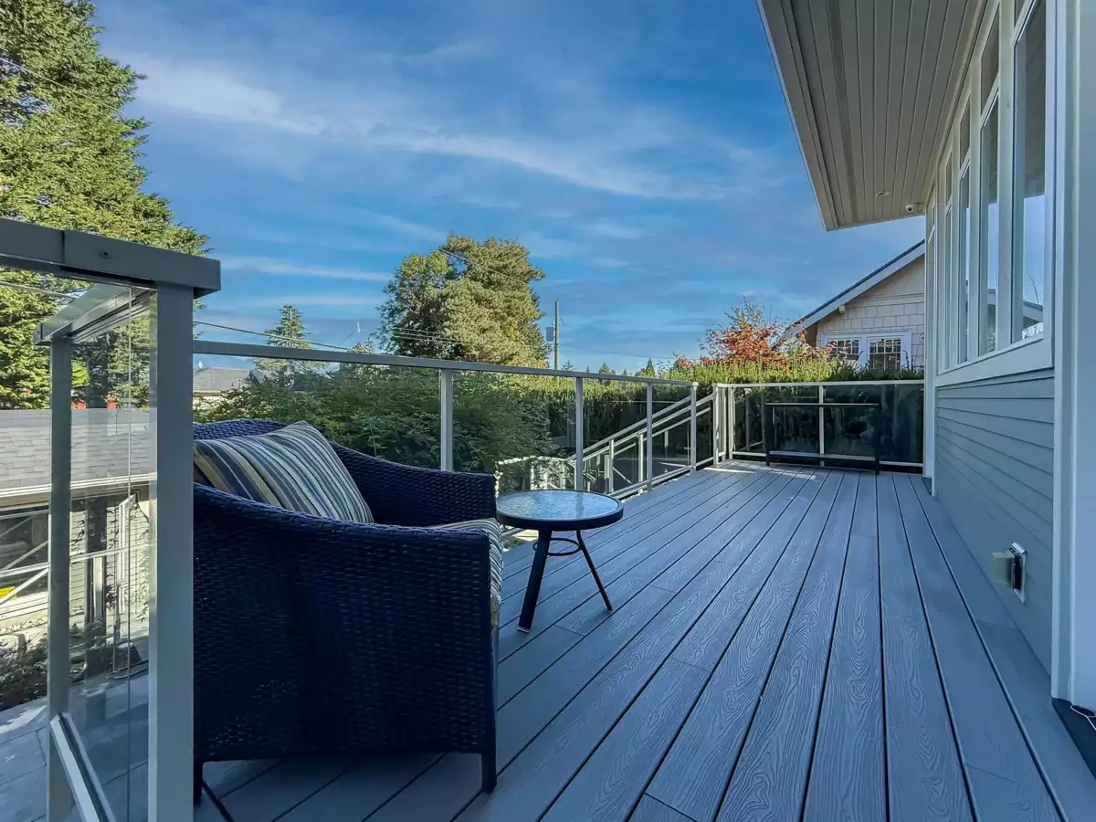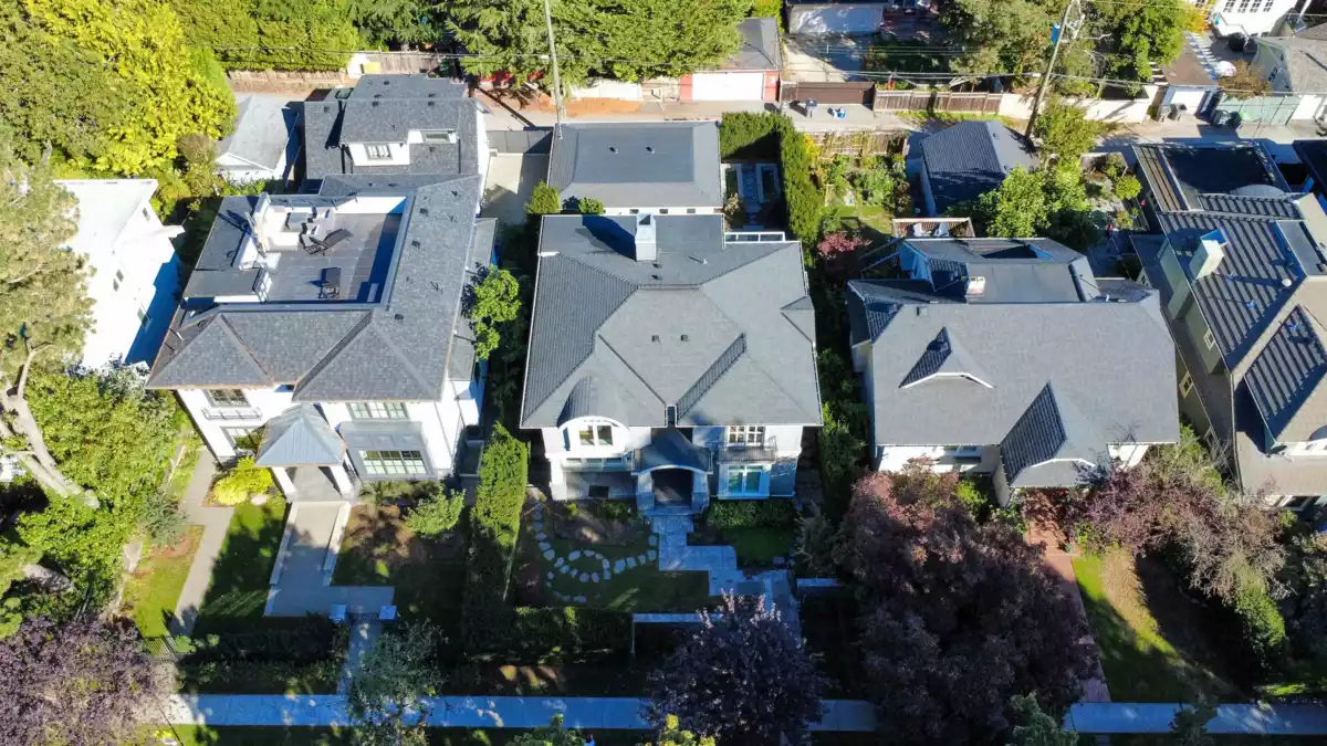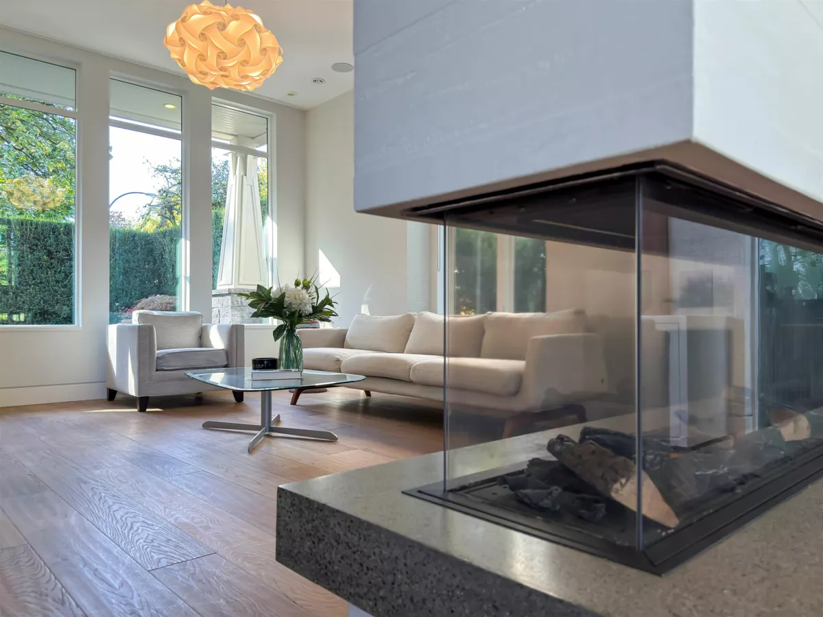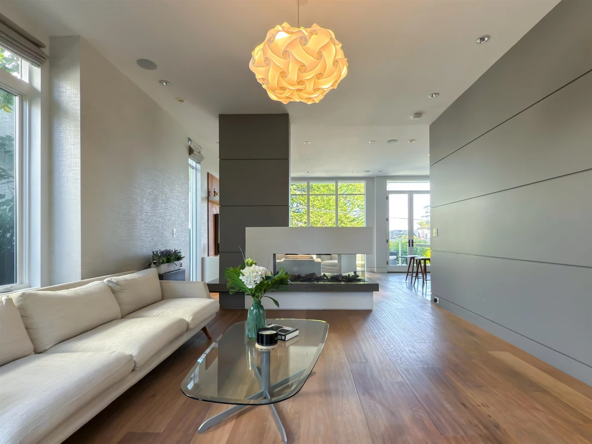 A refined modern home in prestigious Quilchena, set on a 6,000 sq ft lot with 3,800 sq ft of beautifully designed living space. Floor-to-ceiling windows fill the main living areas with natural light and showcase stunning views, complemented by a sleek gas fireplace and designer Bocci lighting. The chef's kitchen is ideal for entertaining, featuring Italian walnut and glass cabinetry, premium Gaggenau appliances, a prep kitchen, and Bertazzoni 6-burner range. Upstairs offers four bedrooms including a luxurious primary suite with fireplace, spa-like ensuite, and private deck. The lower level features a spacious rec room, guest bedroom with ensuite, and an impressive wine room. Complete with A/C, radiant in-floor heating, and a 3-car garage, this home delivers elevated Westside living.