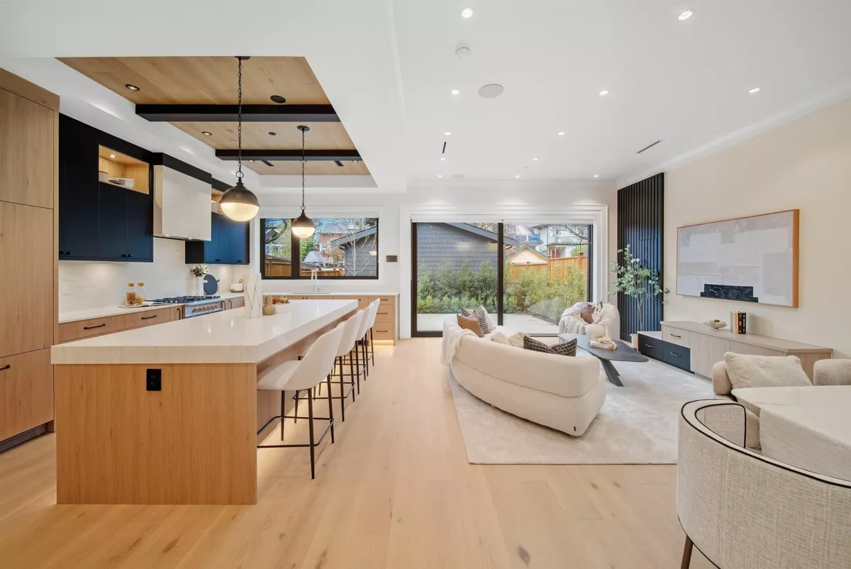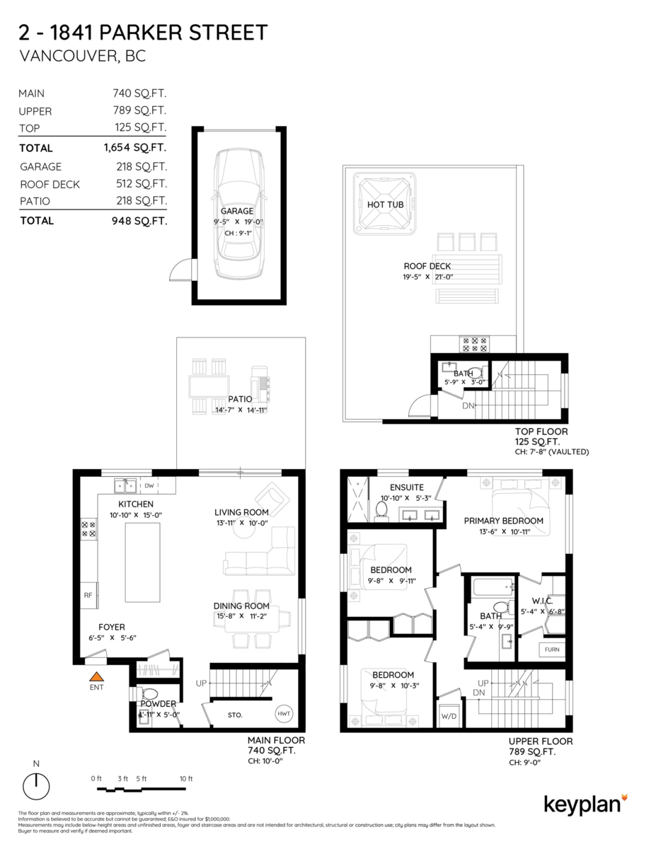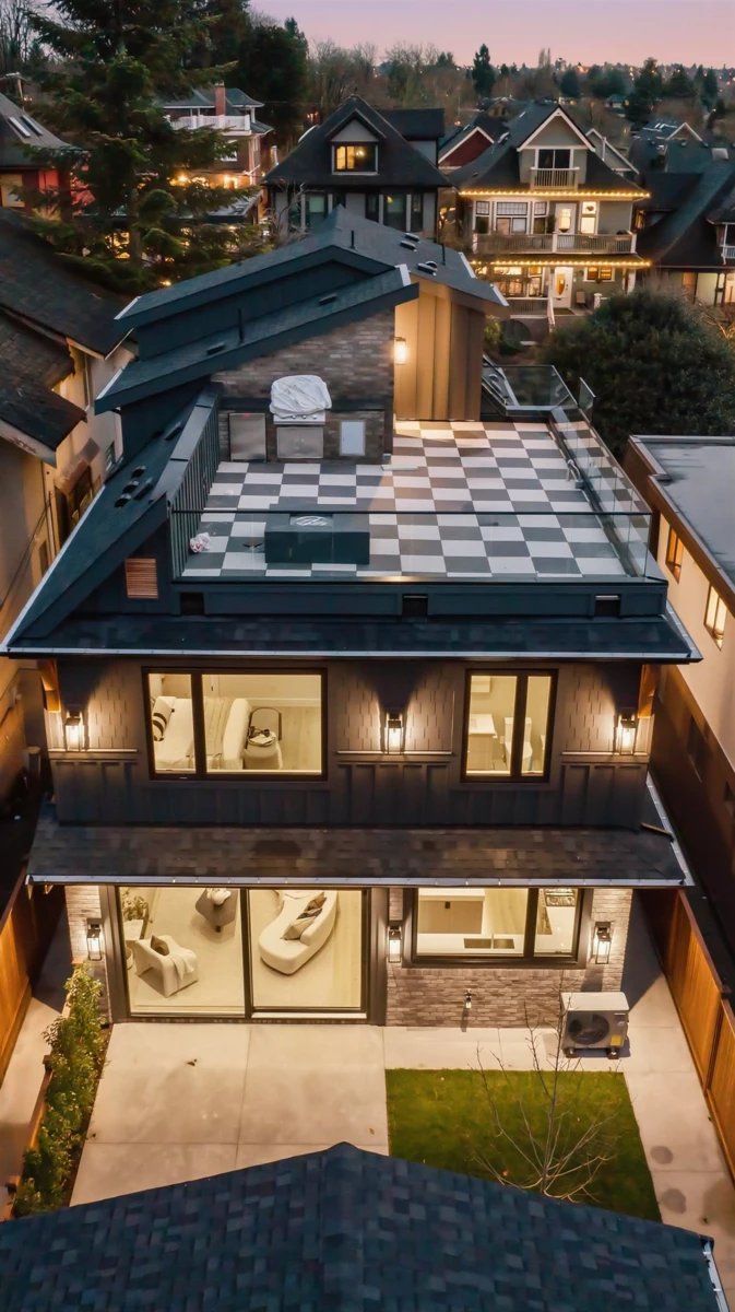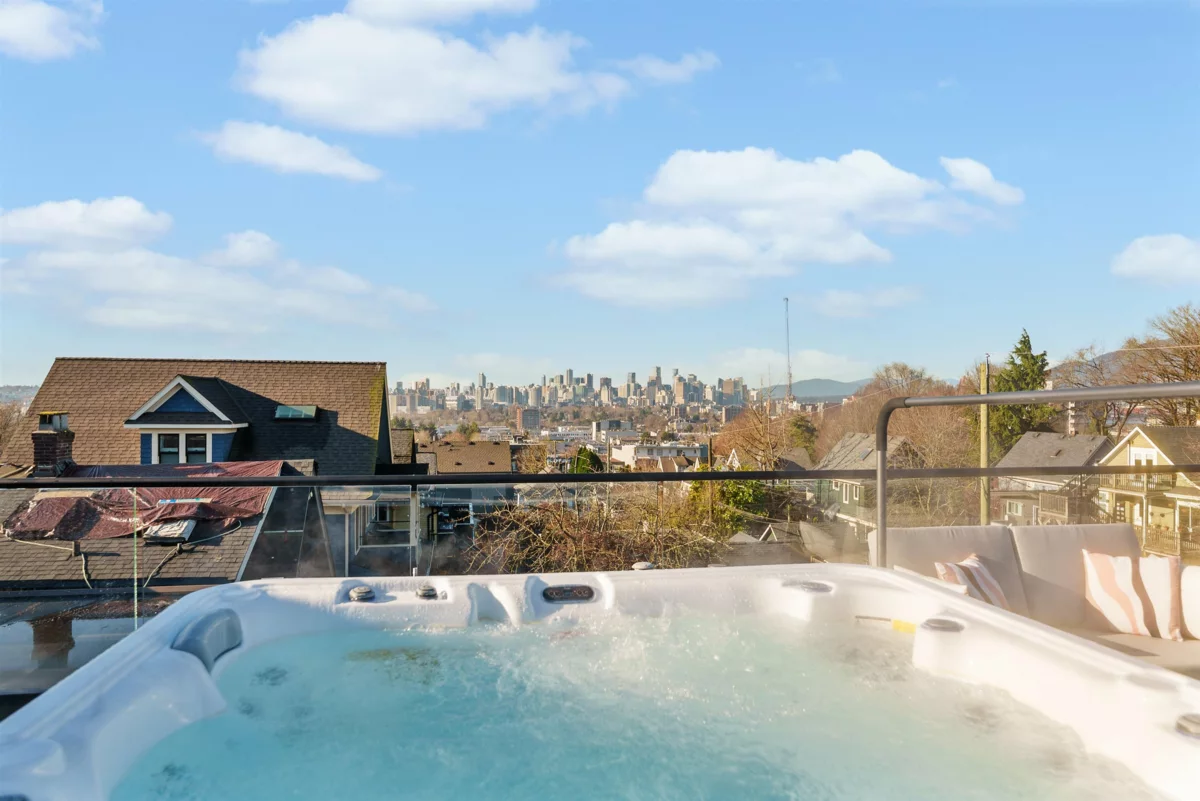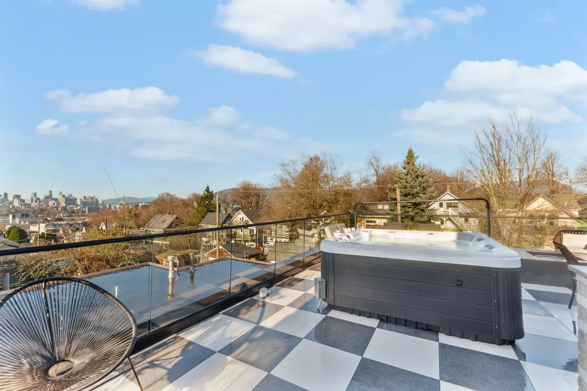 GRANDVIEW/WOODLANDS. Striking 1/2 duplex by AWARD-WINNING BRICKHOUSE BUILDING & CHRISTOPHE VAISSADE DESIGN, showcasing exceptional construction and craftsmanship. A show-stopping 512 SQ FT ROOFTOP DECK with HOT TUB, FIRE PIT, BUILT-IN BBQ, and PANORAMIC CITY & MOUNTAIN VIEWS-a rare offering. The main floor features a BRIGHT, OPEN-CONCEPT LAYOUT, expansive windows, and a CUSTOM KITCHEN WITH PREMIUM MILLWORK anchored by a LARGE ISLAND-RARE IN DUPLEX HOMES. Seamless INDOOR-OUTDOOR FLOW to a PRIVATE BACKYARD. The SPACIOUS PRIMARY BEDROOM includes CUSTOM ACCENT MILLWORK and a DOUBLE-VANITY ENSUITE, plus two additional generously sized bedrooms. Striking curb appeal with BOLD EXTERIOR COLOURS, STONEWORK & MODERN CLADDING. Walkable to schools, transit, and LIVELY COMMERCIAL DRIVE.