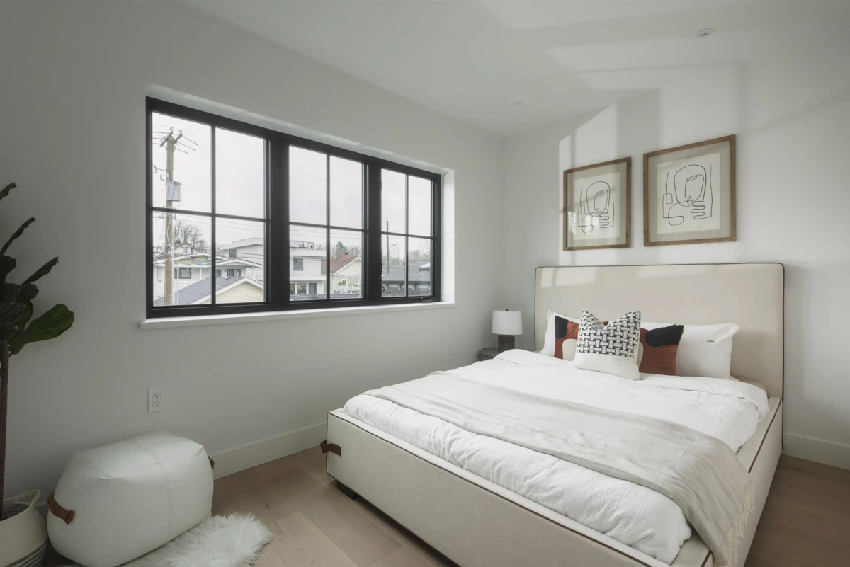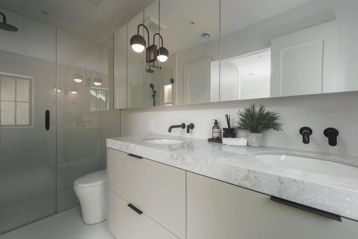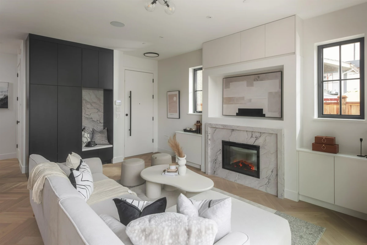 Experience a spectacular duplex by Mirani Homes, community-oriented builders who truly care. Steps from Queen Elizabeth Park, this luxurious south-facing back unit offers 3 bedrooms and 3.5 baths with open-concept living, a large dining area ideal for family gatherings, herringbone floors, bronzed mirrors that amplify natural light, and inspired craftsmanship. The second-floor primary bedroom features a walk-in closet and a spa-worthy ensuite with double sinks. All washrooms showcase custom-tiled finishes. The chef’s kitchen includes Miele appliances, premium countertops & custom cabinetry, plus a lime-wash powder room. Enjoy radiant heating, heat pump A/C, fireplace, crawl space, epoxy-finished garage & an indoor–outdoor flow to the sunny south-facing yard.