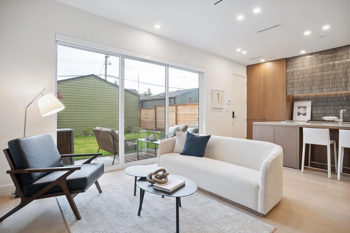 Mizan Developments & Architrix Design Studio present this stylish 1/2 duplex home in the desirable Kensington/Cedar Cottage neighbourhood of East Van. Each home offers 3 beds+Den/3.5 baths, an open-concept main floor, and luxurious earth-tone finishes, including quartz countertops, brushed oak flooring, and a gas fireplace. Kitchens feature large islands, Fisher Paykel appliances, and custom cabinetry, leading to spacious at grade outdoor patio and fully fenced private yard. The primary bedroom has a spa-like ensuite and large walk-through closet. Spacious upper level bedroom with sliding doors leading to the deck to enjoy the view. Detached garage with EV capable parking. Schools:Lord Selkirk Elem & Gladstone Secondary.