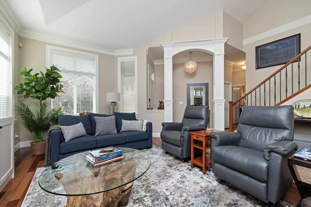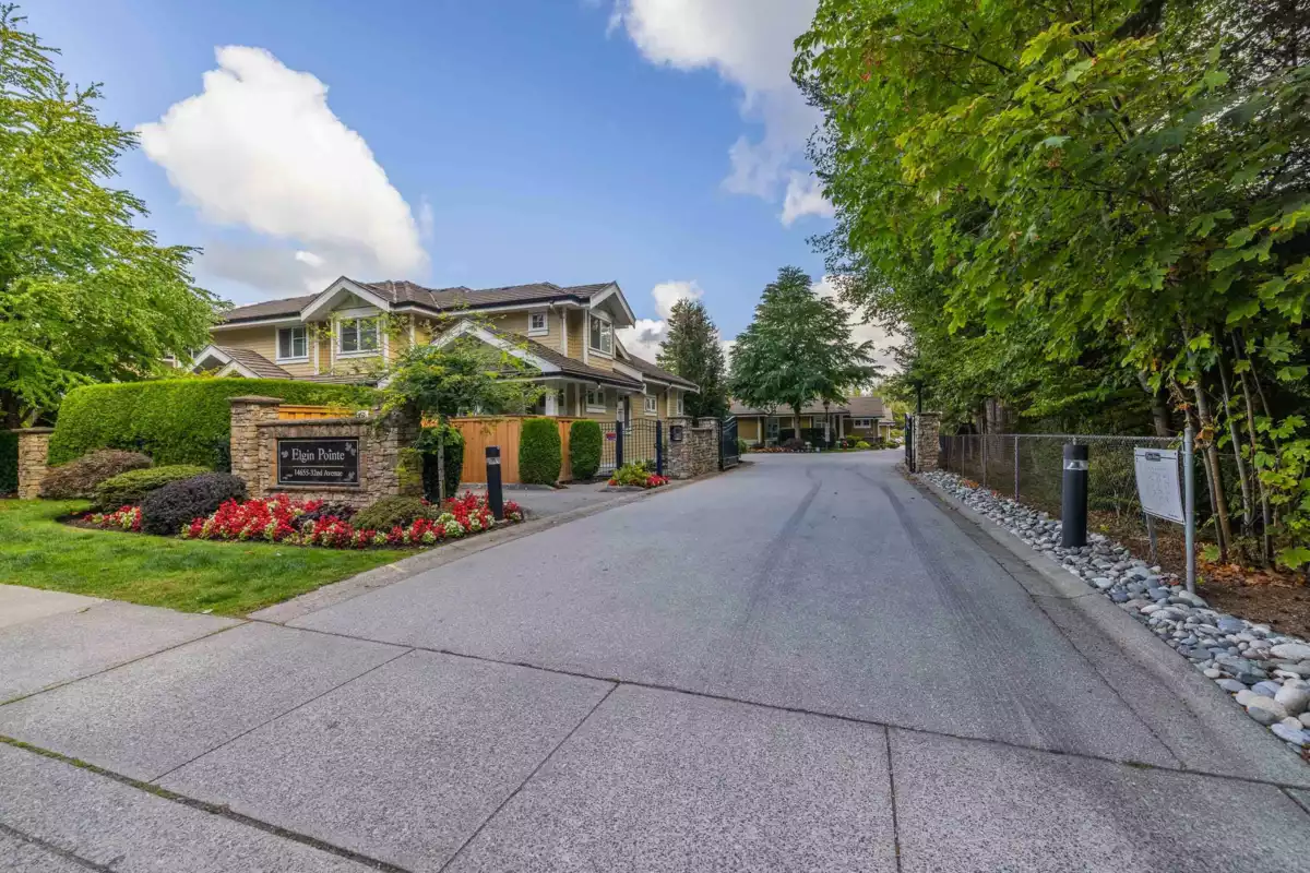 Welcome to Elgin Pointe, a gated community of executive DUPLEX STYLE townhouses that is South Surrey/White Rock's best-kept secret! This unit offers main floor entry, vaulted ceilings, an open concept renovated living/dining area, new kitchen cabinets & counters. The large MAIN FLOOR PRIMARY BEDROOM'S fully renovated ensuite features double sinks, large walk-in shower, and heated floor. Upstairs comprises of 2 bedrooms, bathroom & a large den/office. The lower level offers a huge family/recreation room c/w pool table, another bedroom and bathroom, and an over-sized utility room. A recently installed heat pump provides heating & air conditioning. Quiet location in the complex with a very private backyard. The double garage and reserved parking stall accommodate 3 cars.