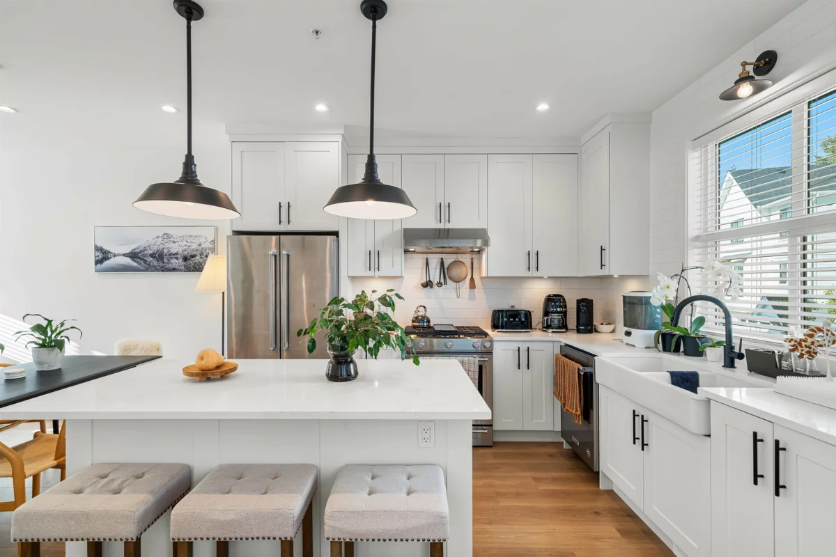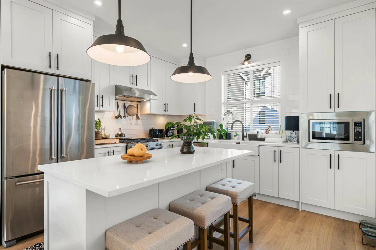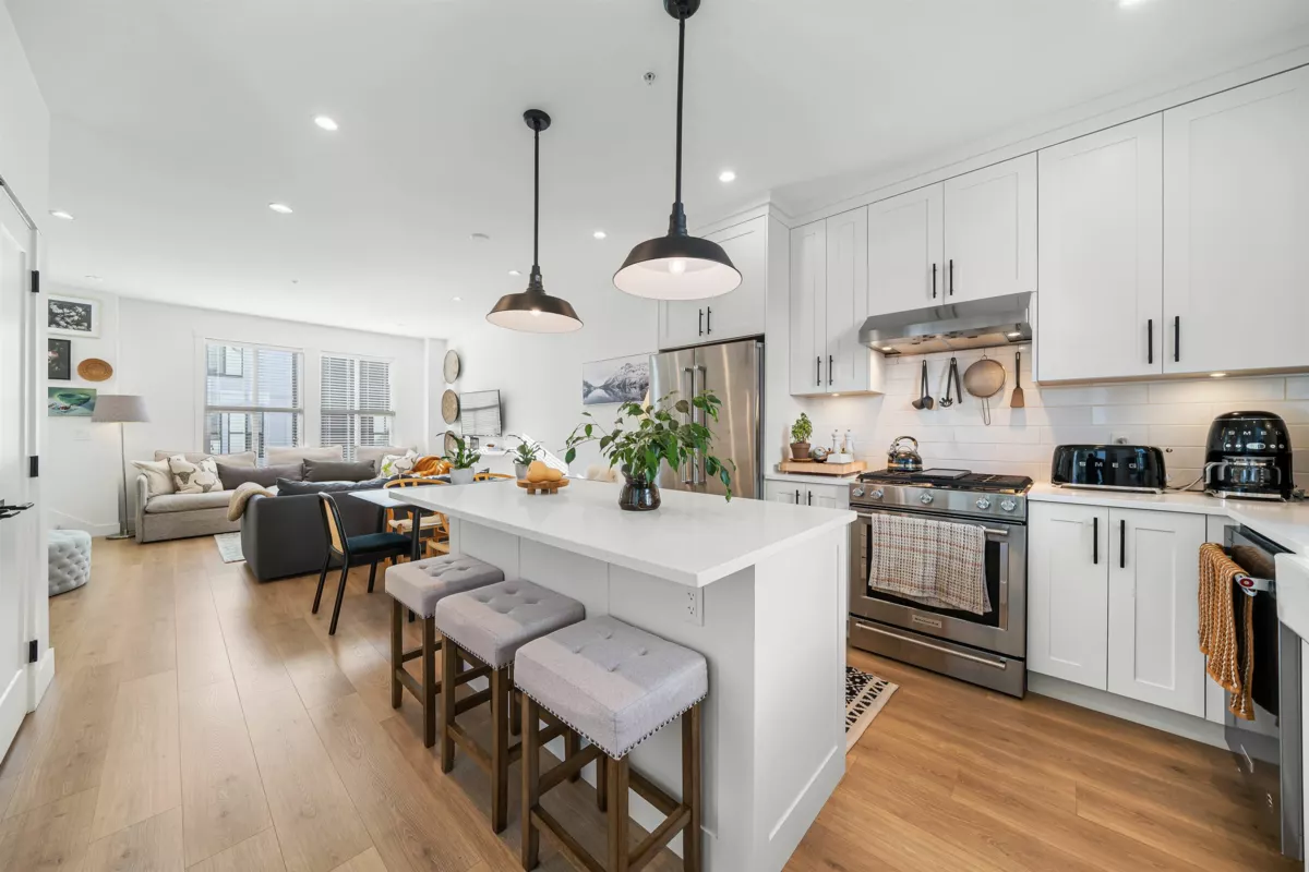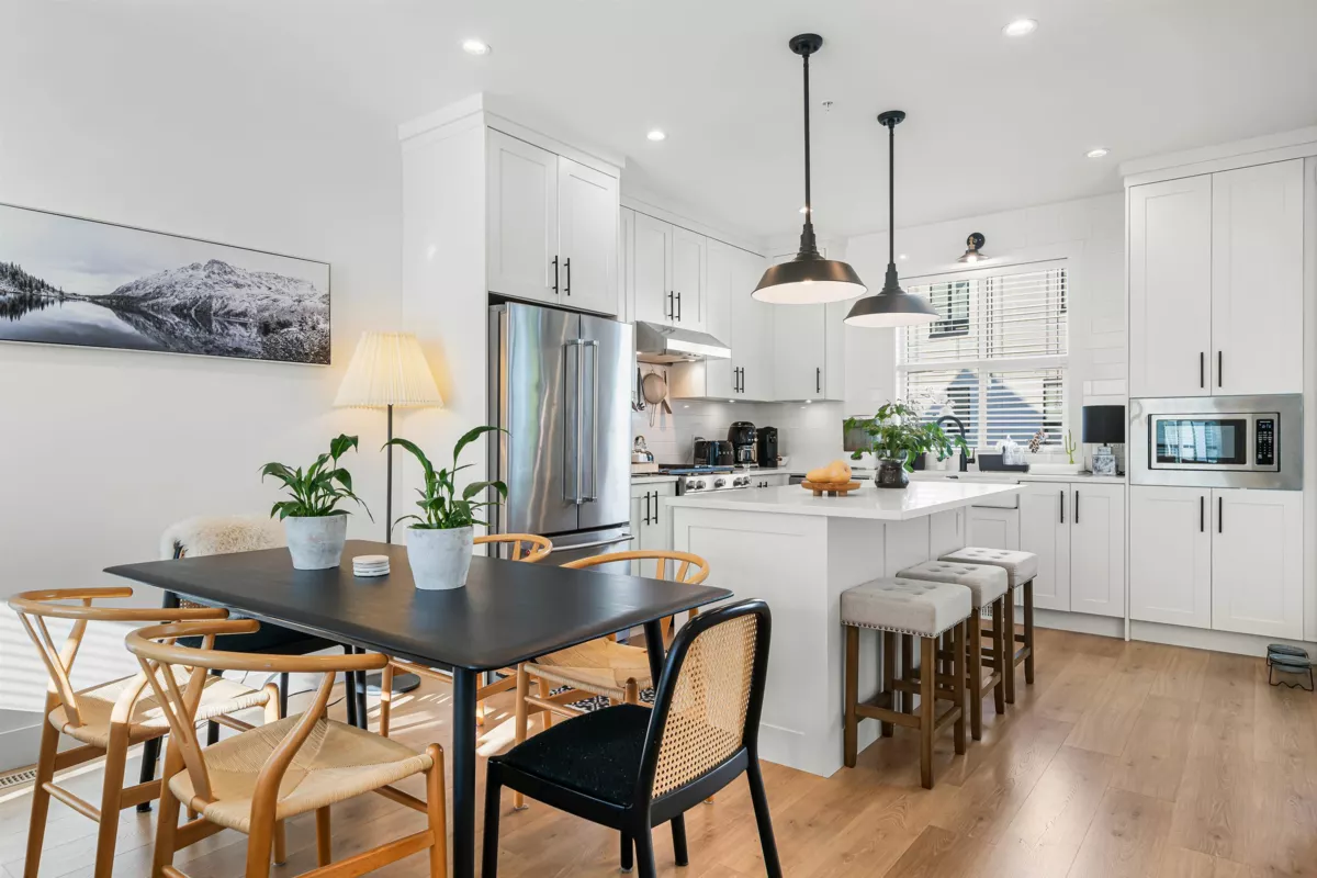 Contemporary farmhouse style townhouse in sought after and conveniently located Homestead. Close to schools, shopping,transit and Hwy 1. This 4 bdrm / 2.5 bath plan boasts top line finishes and features throughout including 9' ceilings on the main floor, gourmet kitchen, s/s appliances, deck with nat. gas for bbq. Navian on demand hot water system, side by side double garage with extra storage. Family friendly, shows like new and ready to move in!
