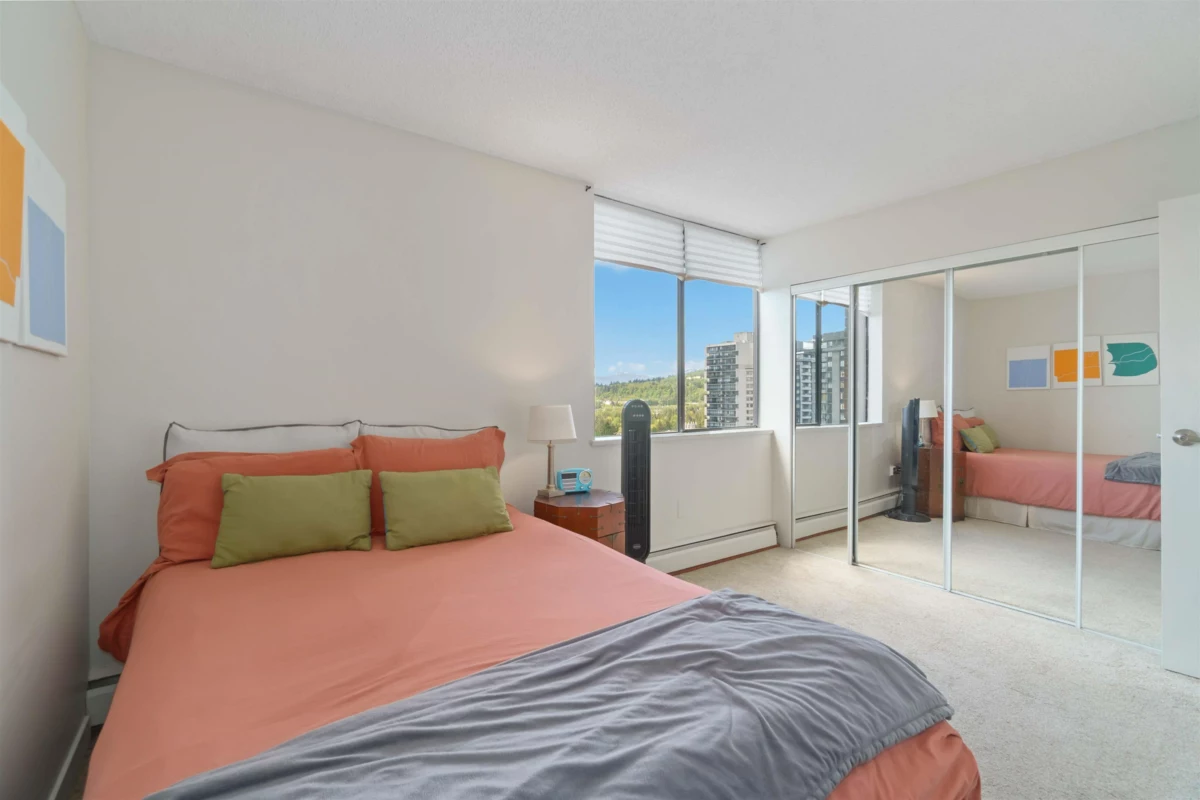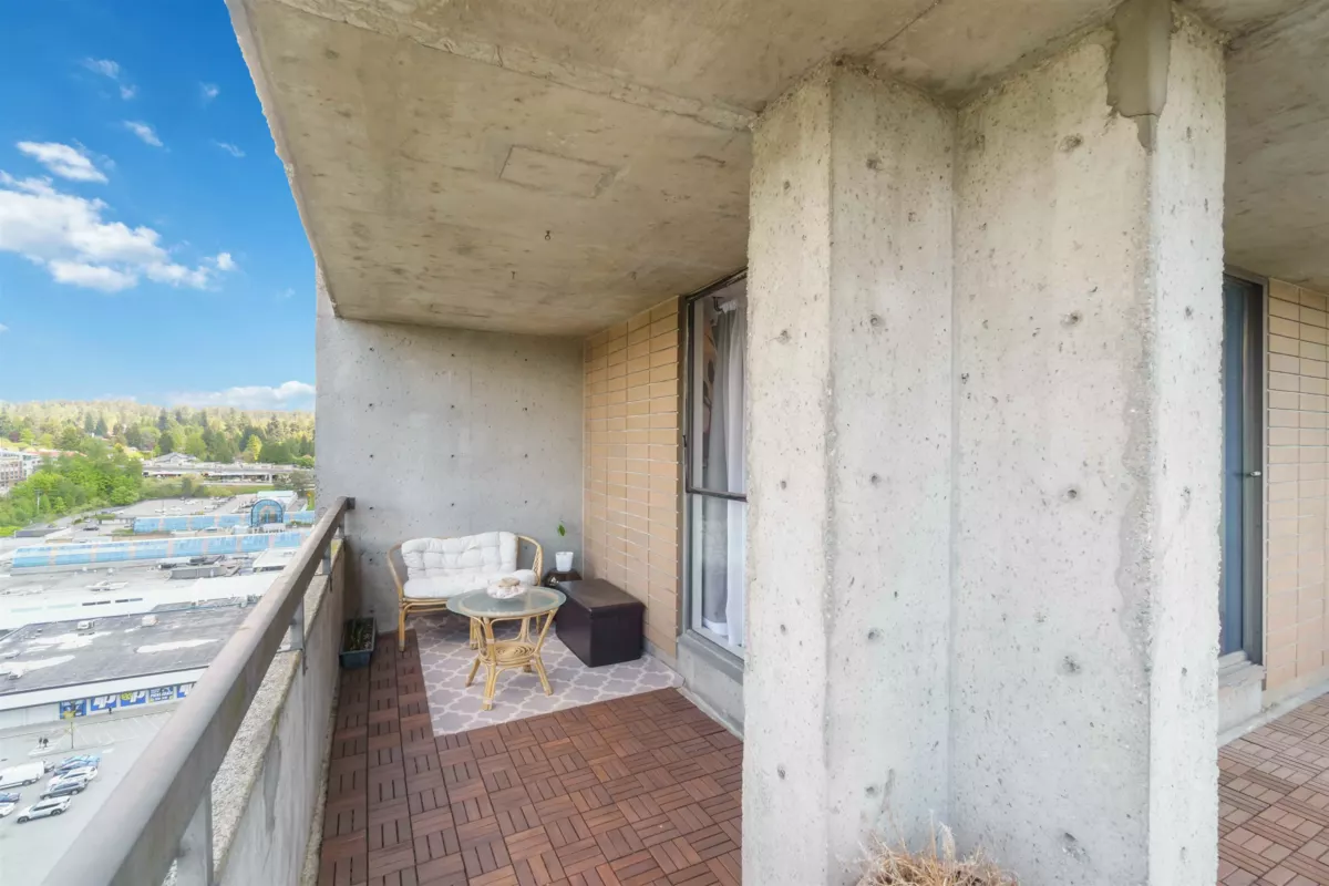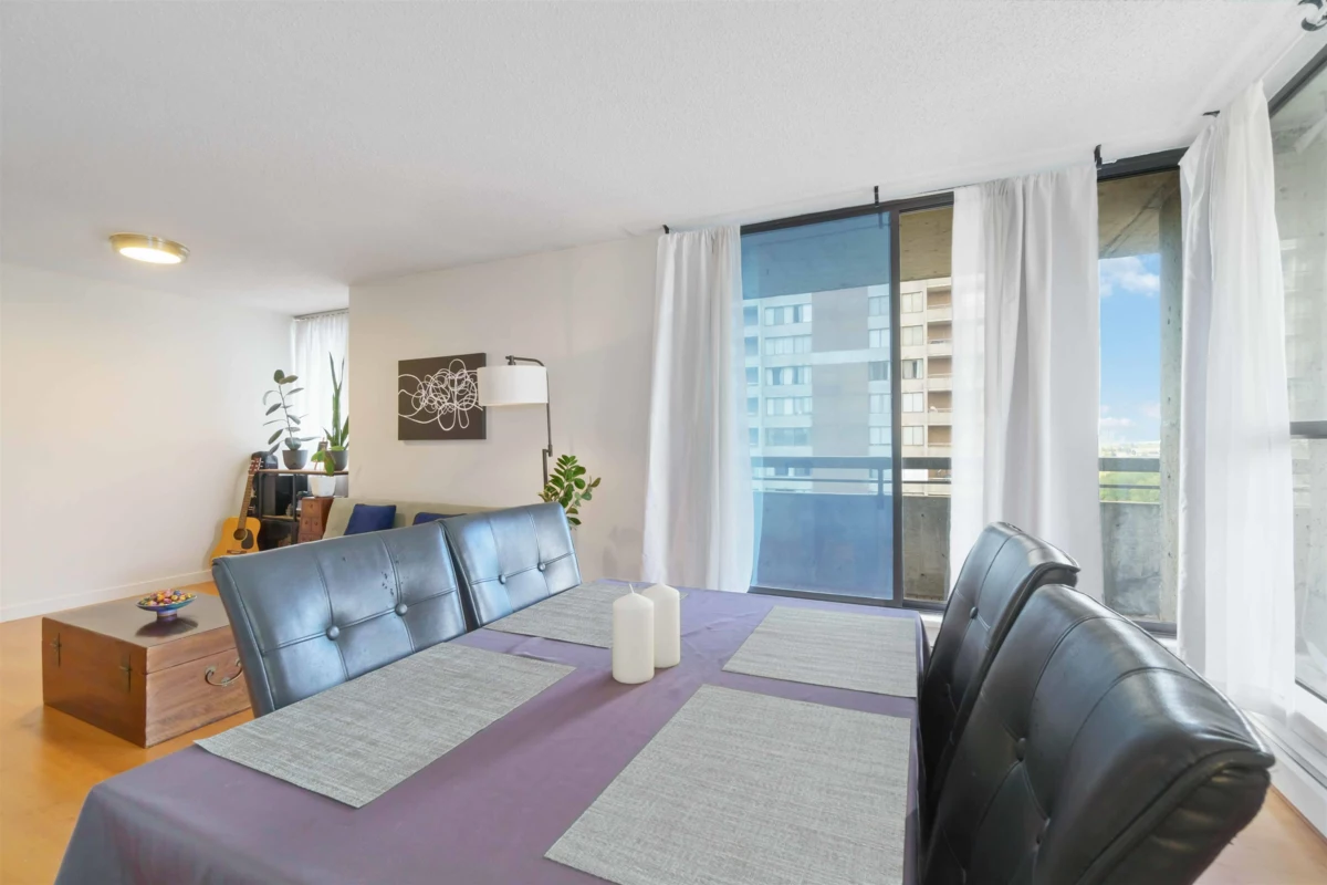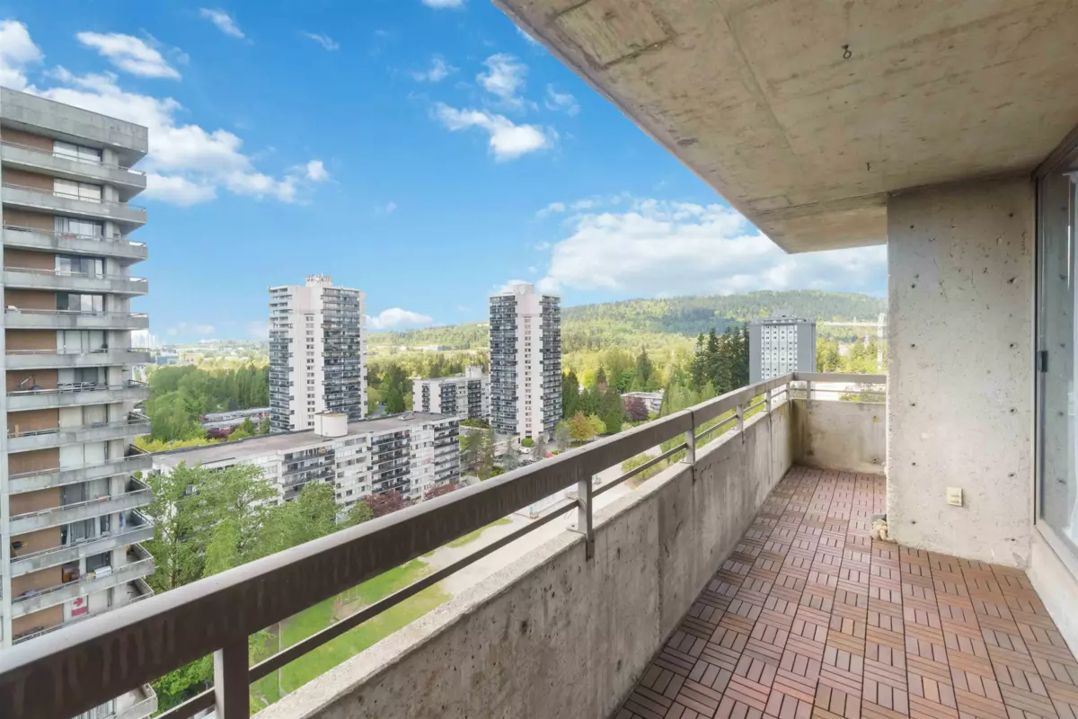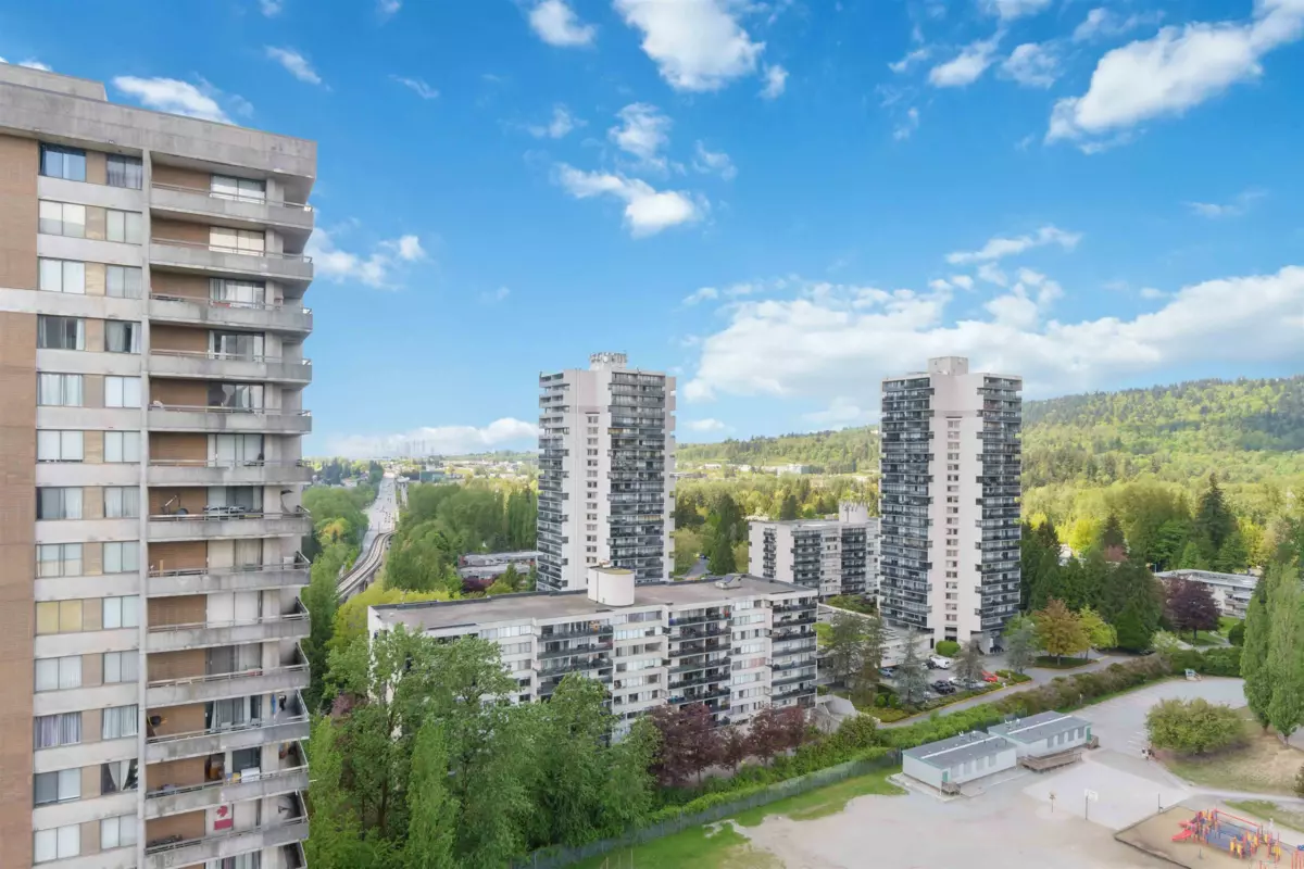 Bright and spacious 1 bedroom, 1 bath corner unit in Timberlea, move-in ready and easy to show (tenant related to owner, move in ASAP), featuring a covered wraparound balcony with north and west city and mountain views. This well-designed home offers a combined living and dining area with laminate flooring and large windows for excellent natural light, a generously sized bedroom, and an updated kitchen with fresh cabinetry, modern countertops, and newer appliances providing great storage and prep space. Enjoy excellent amenities including an indoor pool, lounge, fitness centre, games room with pool table and ping pong, and a workshop. Conveniently located near Lougheed Mall and SkyTrain. Heat, hot water, and electricity included, plus 1 parking stall and 1 storage locker.