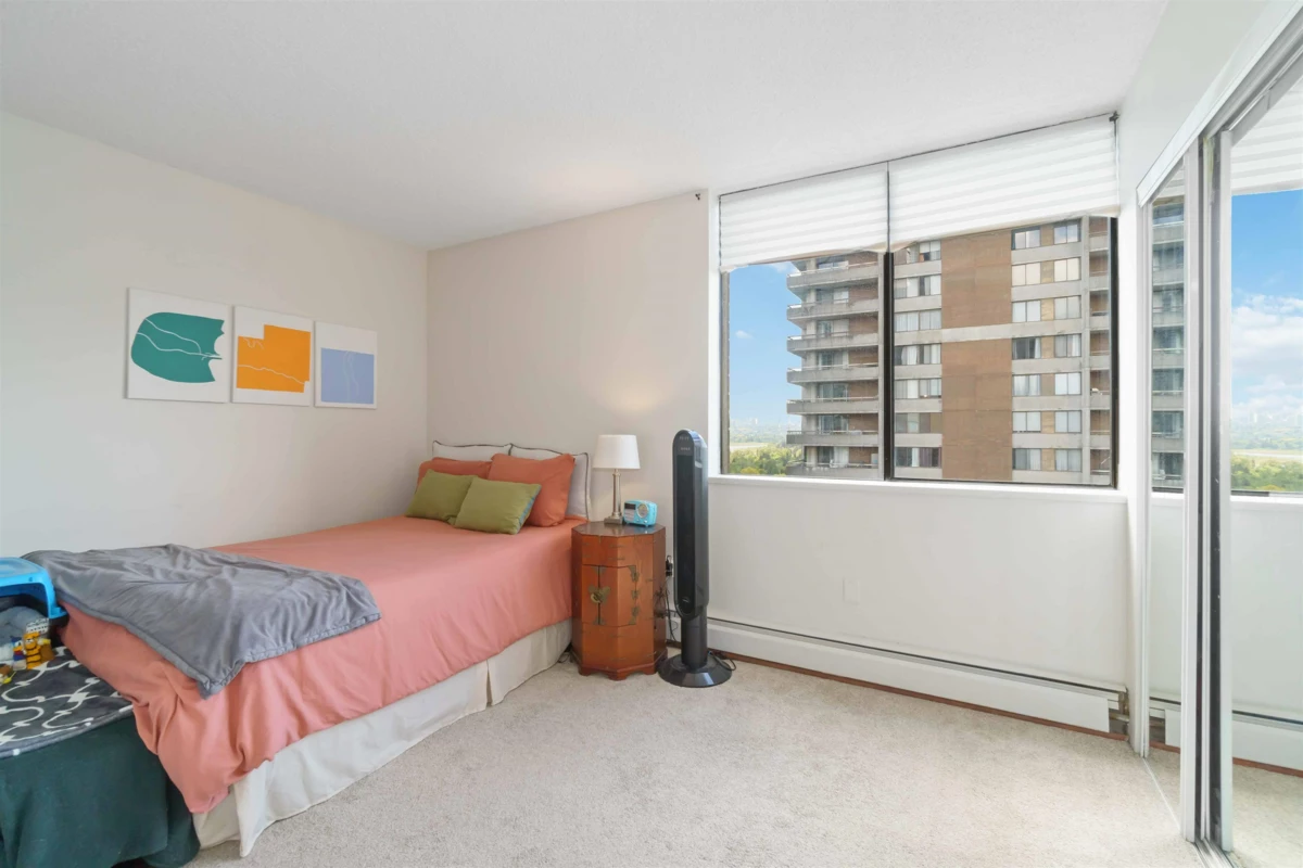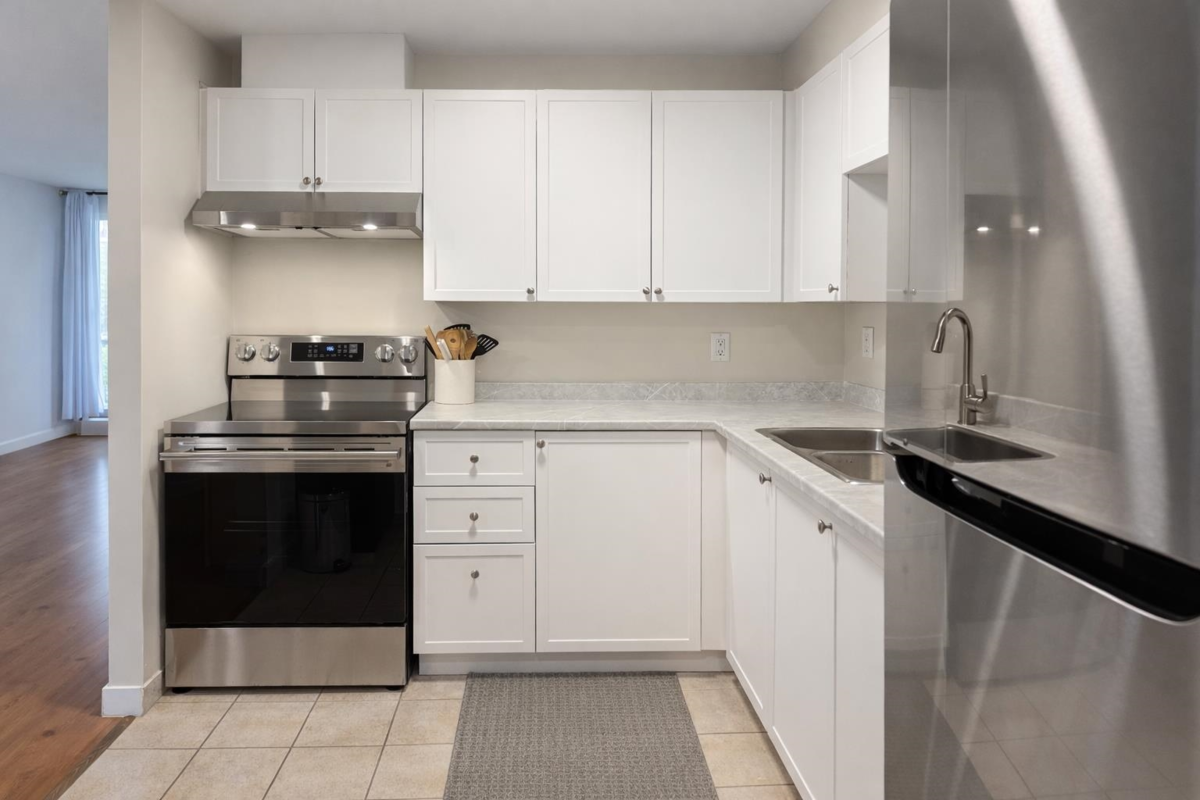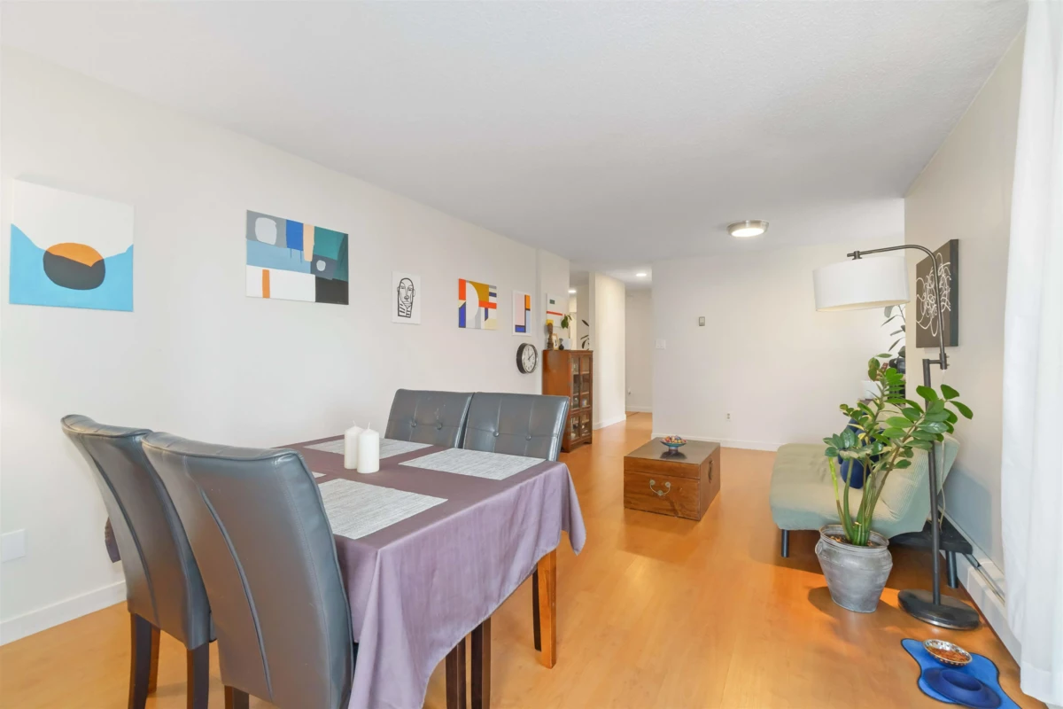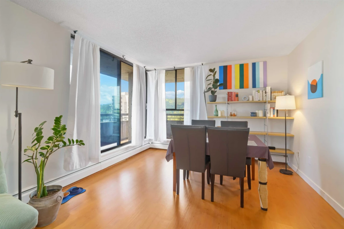 Bright and spacious 1 bedroom, 1 bath corner unit in Timberlea, move-in ready and easy to show (tenant related to owner, move in ASAP), featuring a covered wraparound balcony with north and west city and mountain views. This well-designed home offers a combined living and dining area with laminate flooring and large windows for excellent natural light, a generously sized bedroom, and an updated kitchen with fresh cabinetry, modern countertops, and newer appliances providing great storage and prep space. Enjoy excellent amenities including an indoor pool, lounge, fitness centre, games room with pool table and ping pong, and a workshop. Conveniently located near Lougheed Mall and SkyTrain. Heat, hot water, and electricity included, plus 1 parking stall and 1 storage locker.
