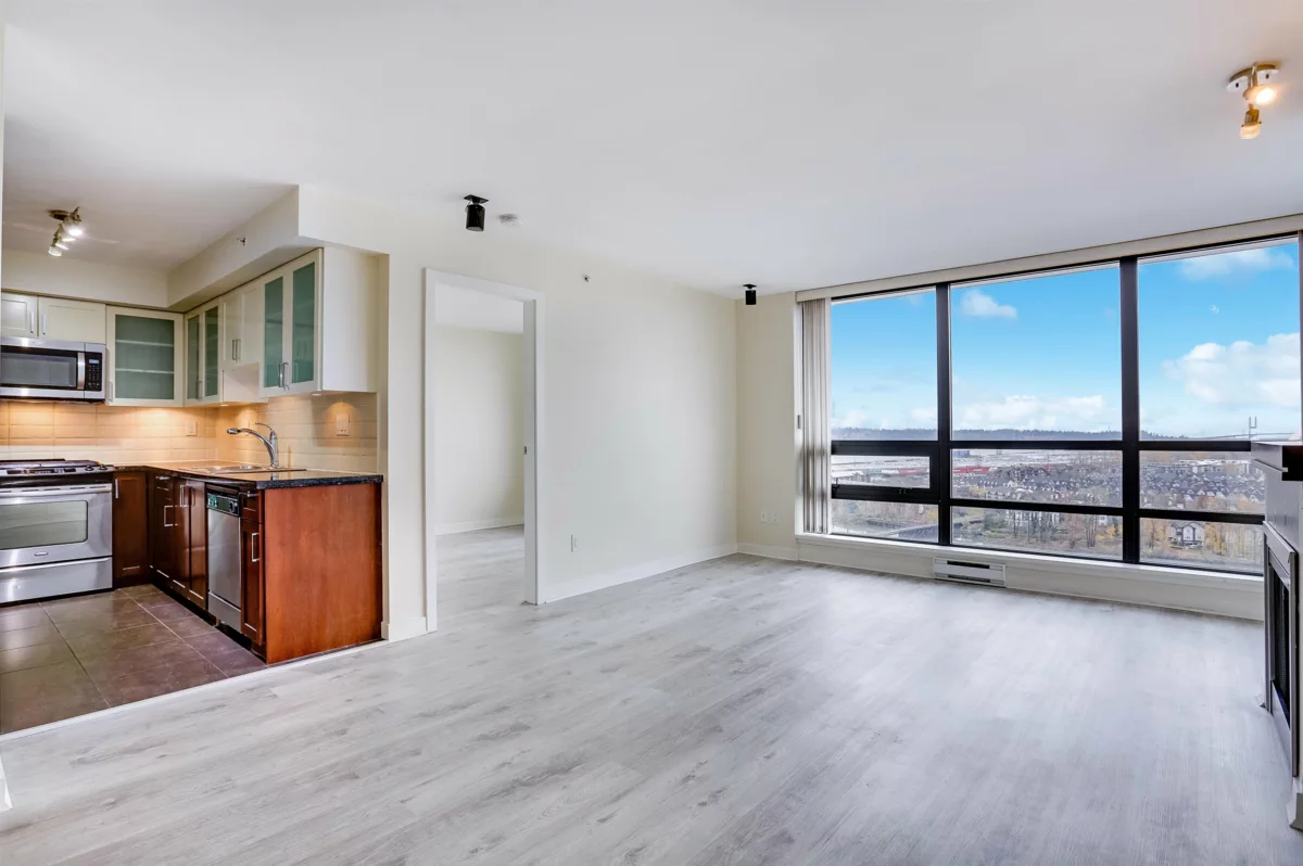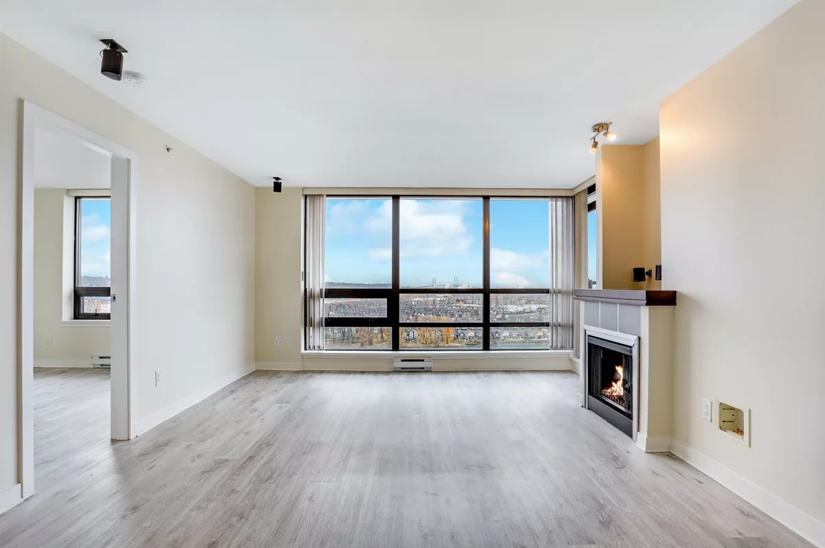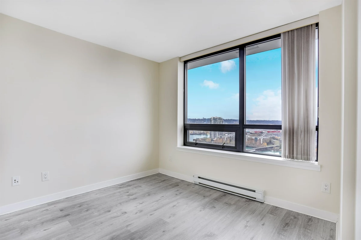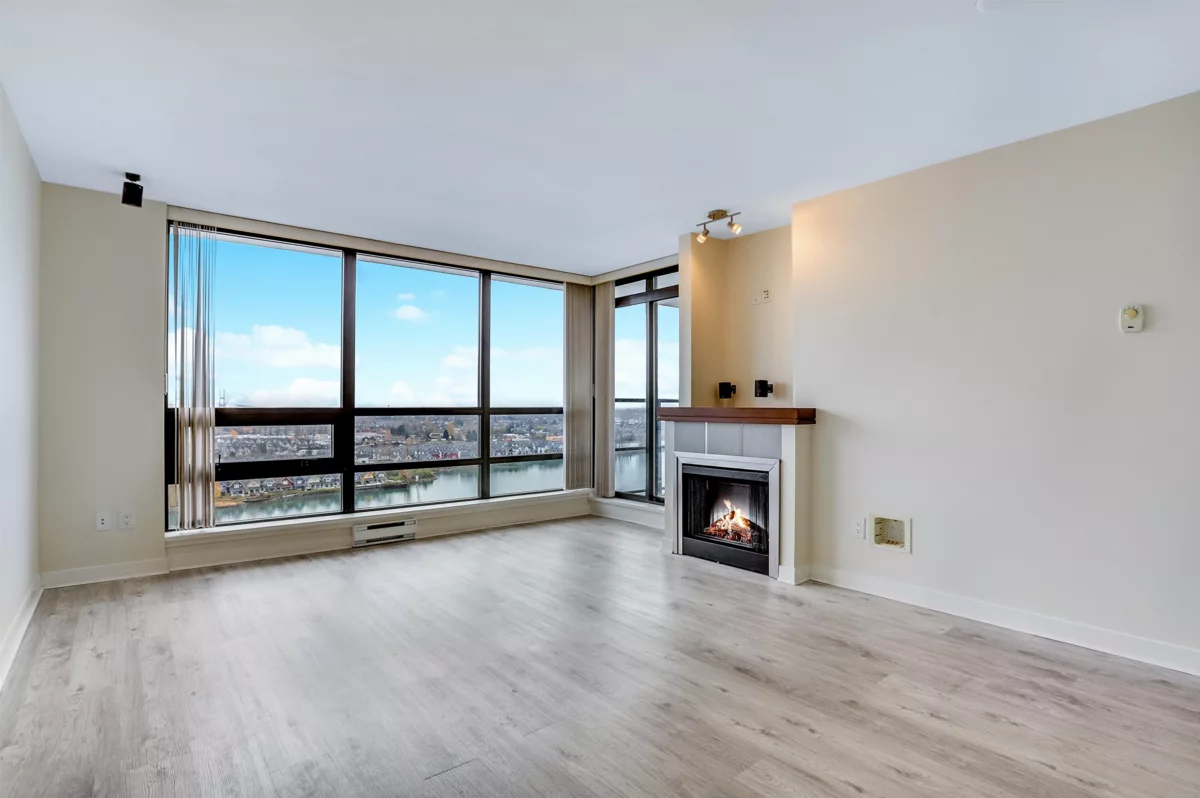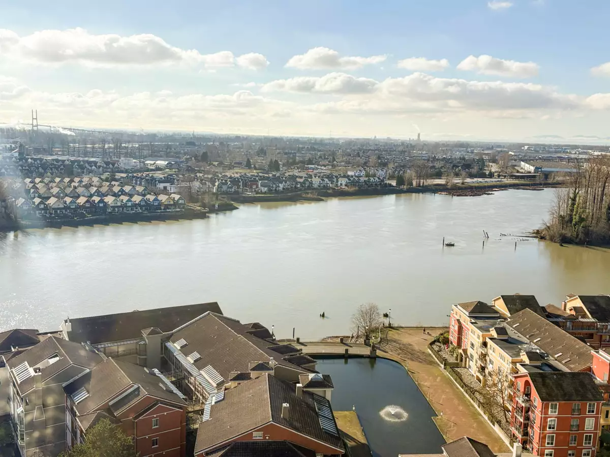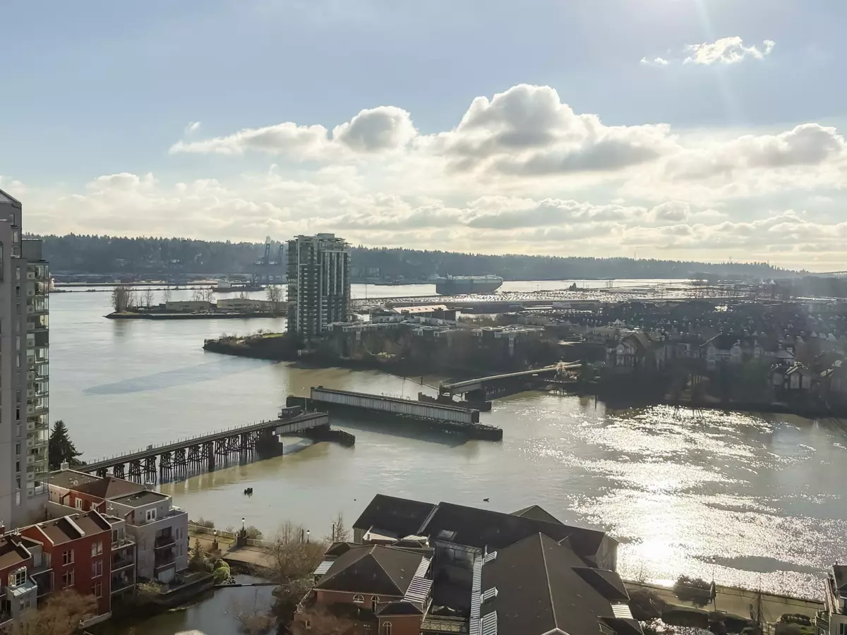Enjoy stunning panoramic views of the Fraser River from this 20th-floor 2-bedroom, 2-bathroom condo at The Q, a well-maintained concrete high-rise in a prime waterfront location. This bright & freshly painted suite features a fantastic floor plan with separated bedrooms, floor-to-ceiling windows and laminate flooring throughout. The kitchen offers granite countertops, stainless steel appliances, and a gas stove, perfect for everyday living and entertaining. Additional features include an electric fireplace, 1 parking stall, & 1 storage locker, & amenities such as a fully equipped gym, bike room, and clubhouse. Pet & rental friendly too! You'll be steps from the River Boardwalk, dog park, SkyTrain, Douglas College, cafés, restaurants, breweries, and River Market. Call your Realtor!