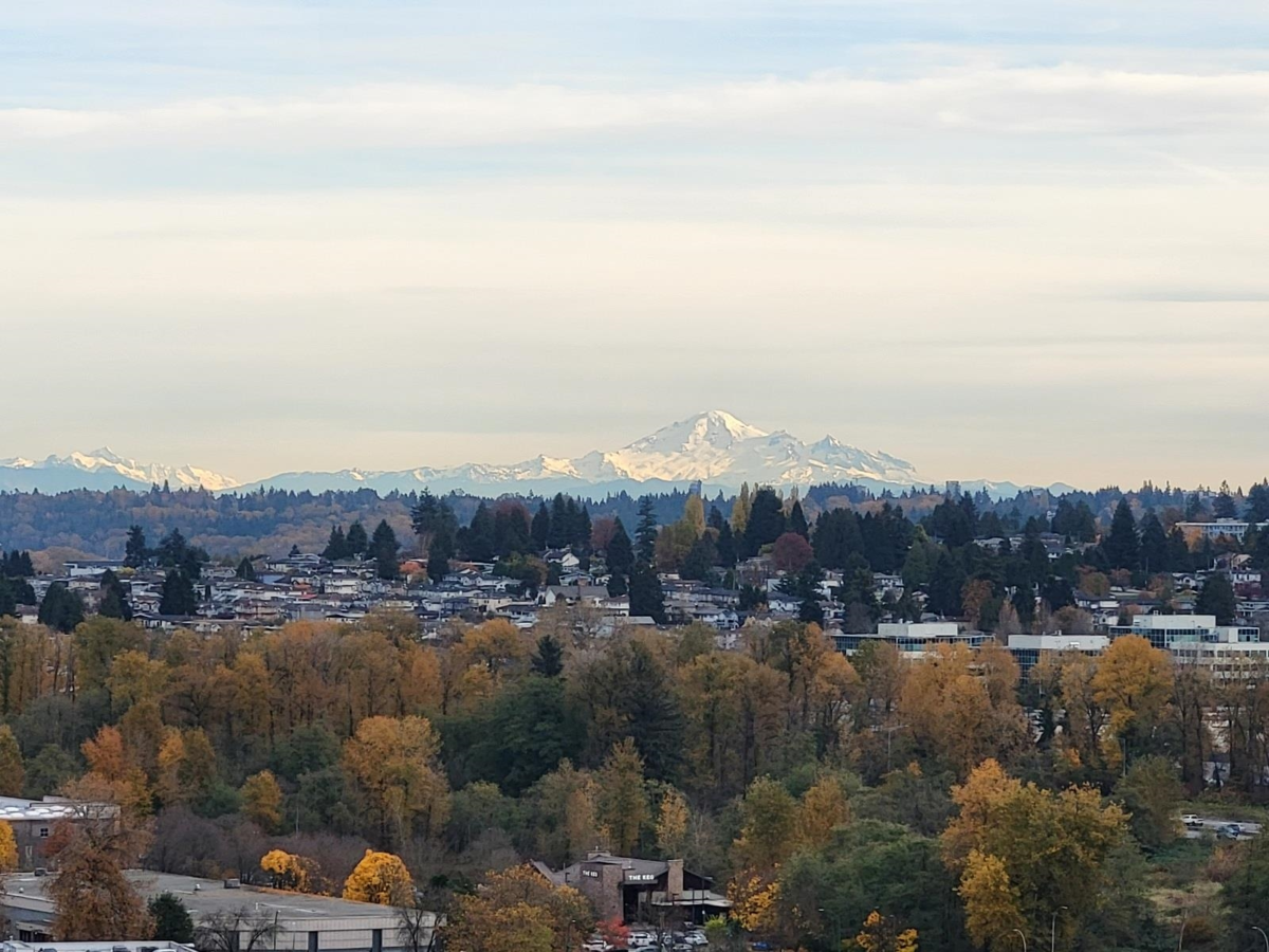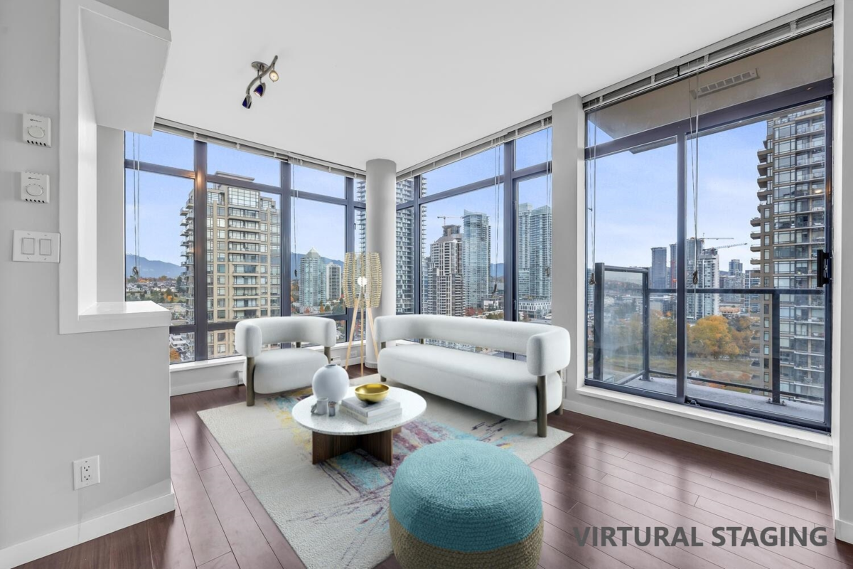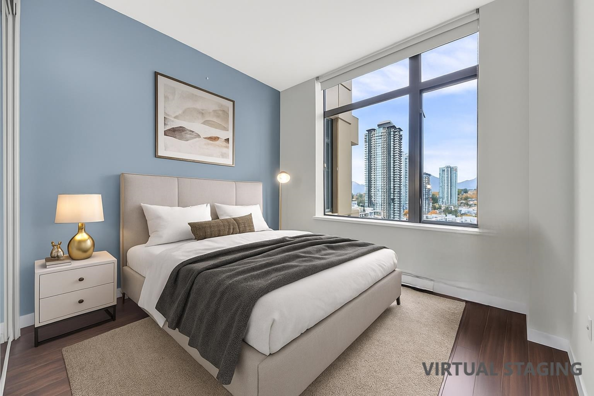 Corner unit at OMA with panoramic city & mountain views, move-in ready with floor-to-ceiling windows and open layout. Northeast-facing and larger than many new builds, offering cooler summers and great value. Enjoy the open-concept layout featuring a satellite bedroom design, a gourmet kitchen, and ample cabinetry. Includes 1 parking stall and 1 storage locker. The building also features 6 EV charging stalls. Clubhouse amenities include a gym, an indoor pool, hot tub, sauna, a steam room and a rooftop garden. Located in the heart of Brentwood, you're just steps away from the SkyTrain, shopping, dining and parks, and also T&T supermarket is coming soon at Gilmore Place. Don't miss out!!