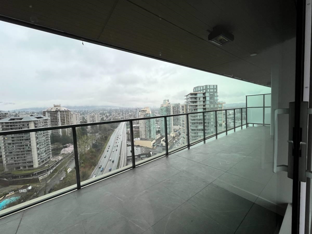 Modern and stylish 2-bedroom, 2-bath plus den on the 20th floor with beautiful NE city and mountain views. Features 868 sqft. of living space plus an approx. 300 sq.ft.spacious balcony with inset radiant ceiling heaters for all-season use. Bright and airy with 9' ceilings and floor-to-ceiling windows in both bedrooms and the living room. The custom kitchen offers engineered quartz counters, Bosch appliances, gas cooktop, built-in oven and microwave. Quality laminate flooring, porcelain tiles, and central A/C and heating throughout. Includes 1 EV parking stall and 1 bike locker. Enjoy premium amenities: 24-hour concierge, fitness centre, and media/music room with karaoke. Only a 5-minute walk to Brentwood SkyTrain, restaurants, shopping & entertainment.Transit to BCIT & SFU.Supper location!