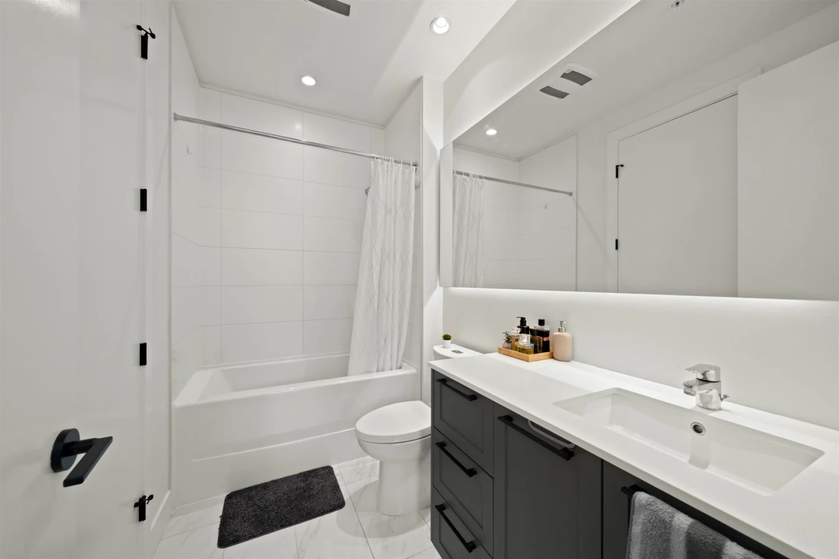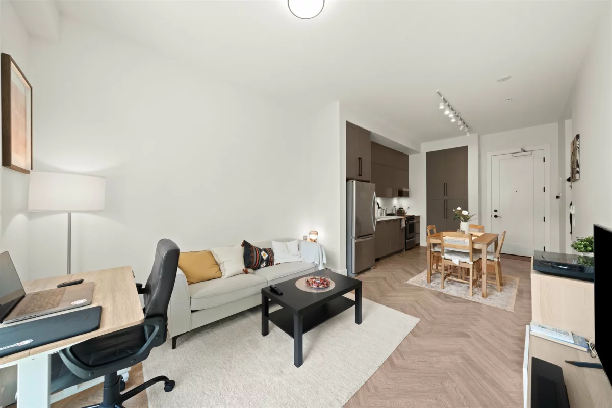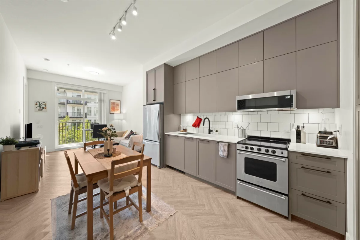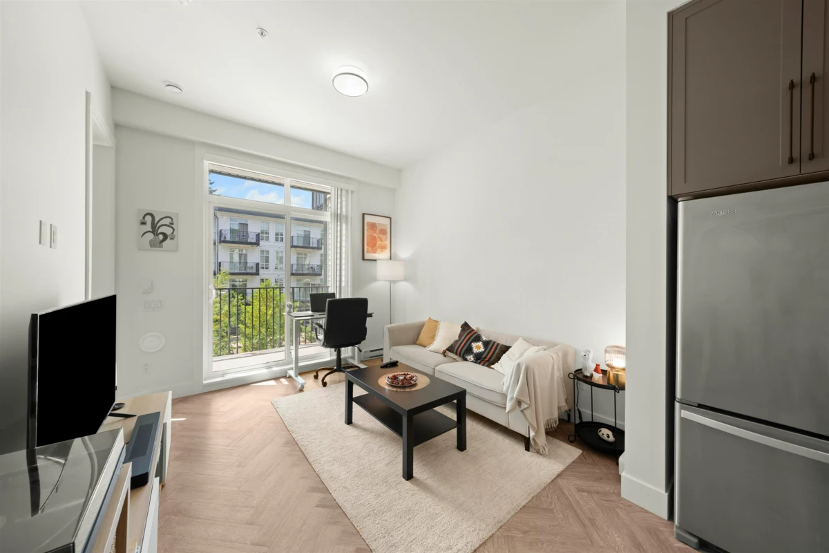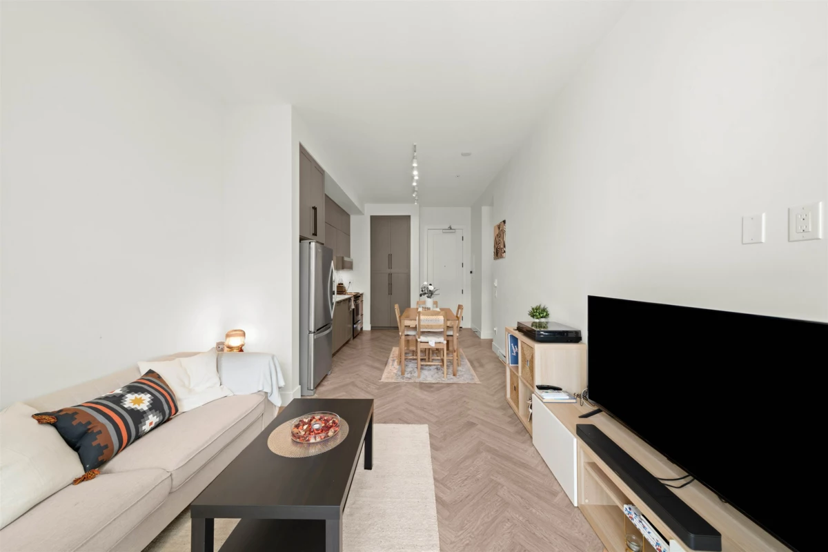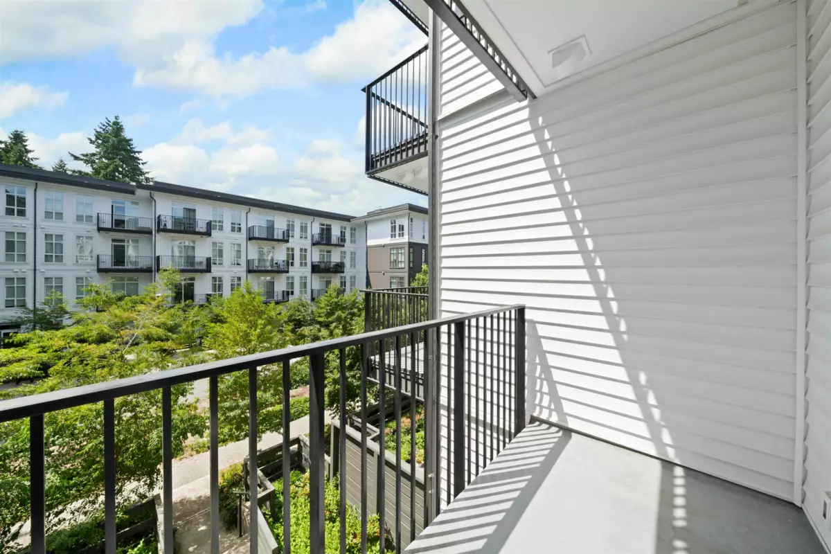 PARKER BY MOSAIC! This large 1 bed 1 bath west facing home come with 1 parking is perfect to live in or invest! Immediately notice the 10 FT ceilings in this bright home and appreciate the timeless elegance of herringbone flooring met with contemporary, clean Scandinavian kitchen and bathrooms. Very efficient layout with oversized windows and patio looking out into the quiet courtyard. Whirlpool appliances, full-size laundry, recessed LED portlights, ambient lighting behind floating bathroom mirrors, quartz countertops. Minutes to Surrey City Centre, SFU & KPU, Surrey Central skytrain, parks, etc. Must see to appreciate!
