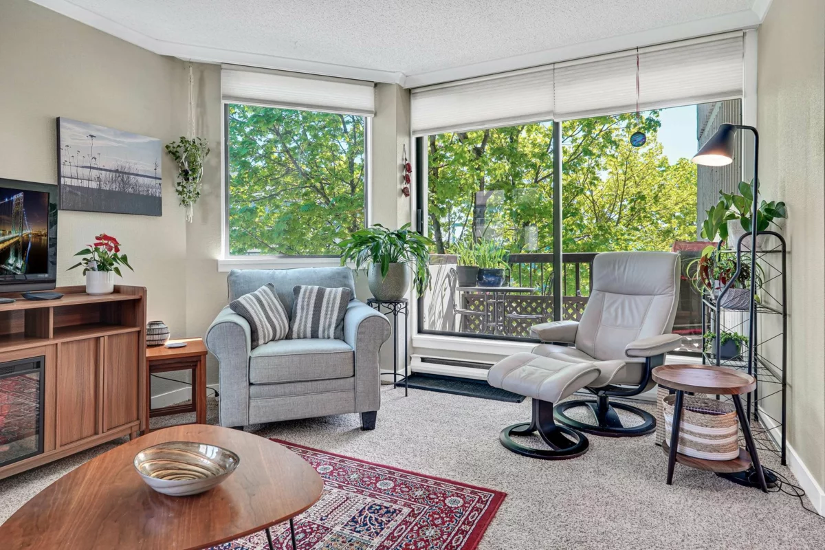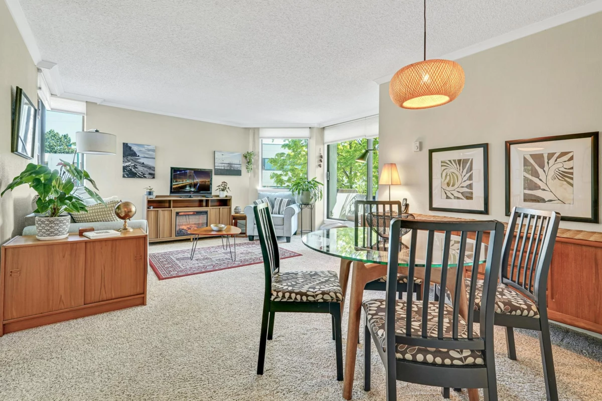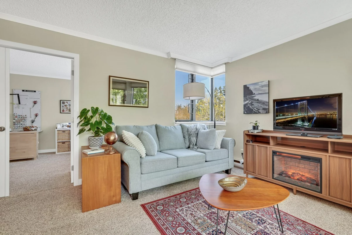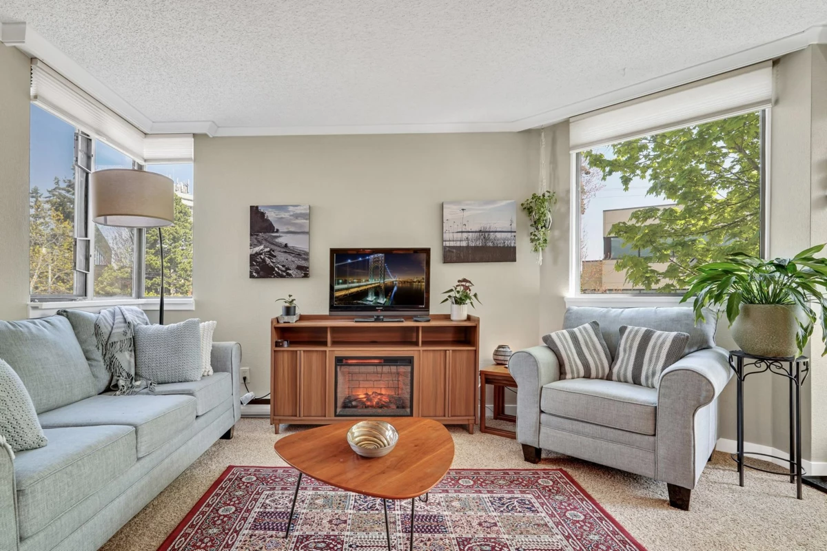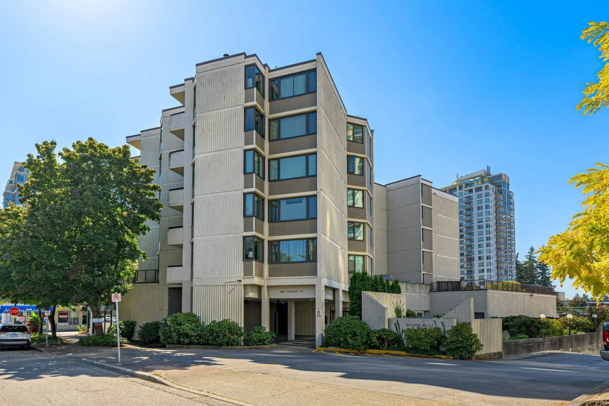 BAYVIEW PLACE located in the heart of White Rock! Affordable Concrete construction two bedroom and one bathroom home. Wonderful, bright south east facing corner unit with spacious kitchen, nice white cabinetry, loads of counter space opening to the dining and living rooms. Nicely updated. Tons of windows for spacious and bright feeling, end unit with balcony looking onto lovely trees. Easy level walking to shops, restaurants, Farmer's Market & more! Book your private showing now. Secure underground parking, in-suite laundry. A true gem!