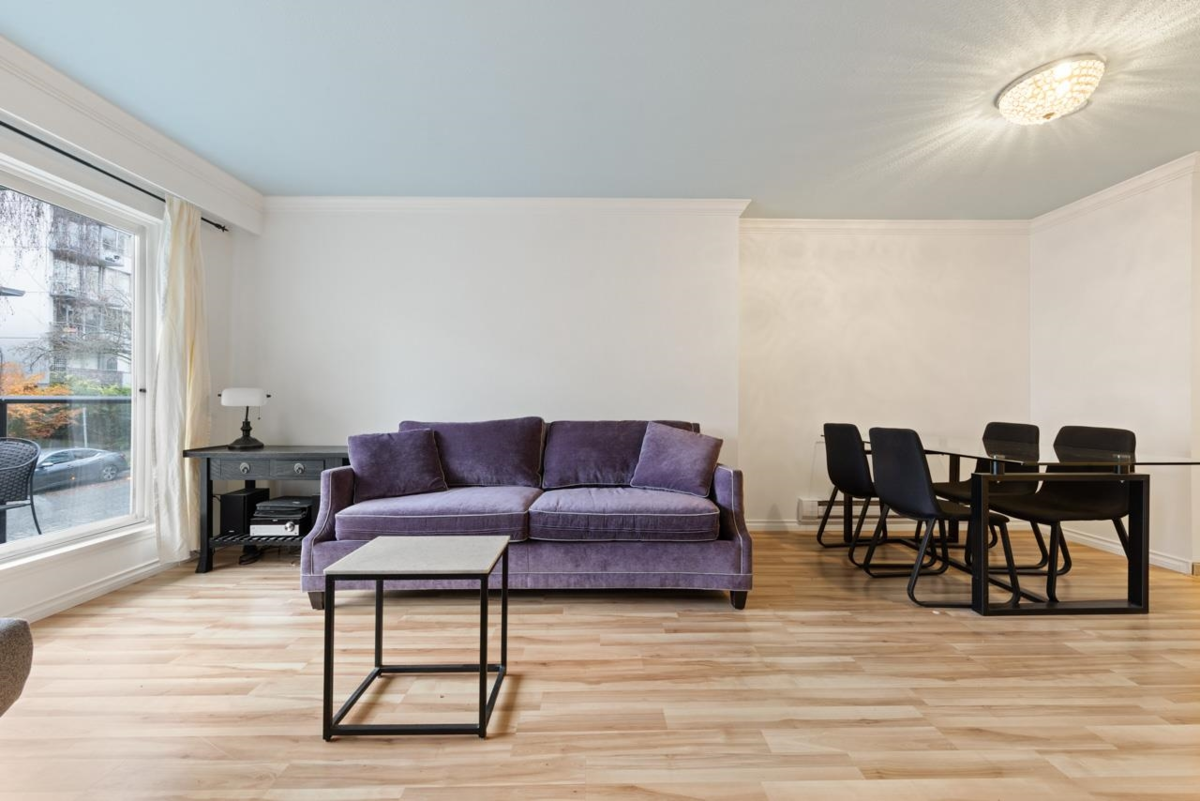 Bright and welcoming extra-large one bedroom home in the heart of the West End. This well-kept home features a living area with a gas fireplace, large windows, and a dining space that easily fits a full size table. The kitchen offers ample storage, stainless steel appliances, and a cheerful window for added natural light. The bedroom is generously sized with room for a king bed as well as additional furniture. Enjoy a covered balcony overlooking a quiet residential street Located in a boutique, rainscreened building just steps to cafés, the Seawall, shopping, & transit. Includes 1 parking & storage. Pets welcome! OPEN HOUSE SAT JAN 24TH 2-4 PM.