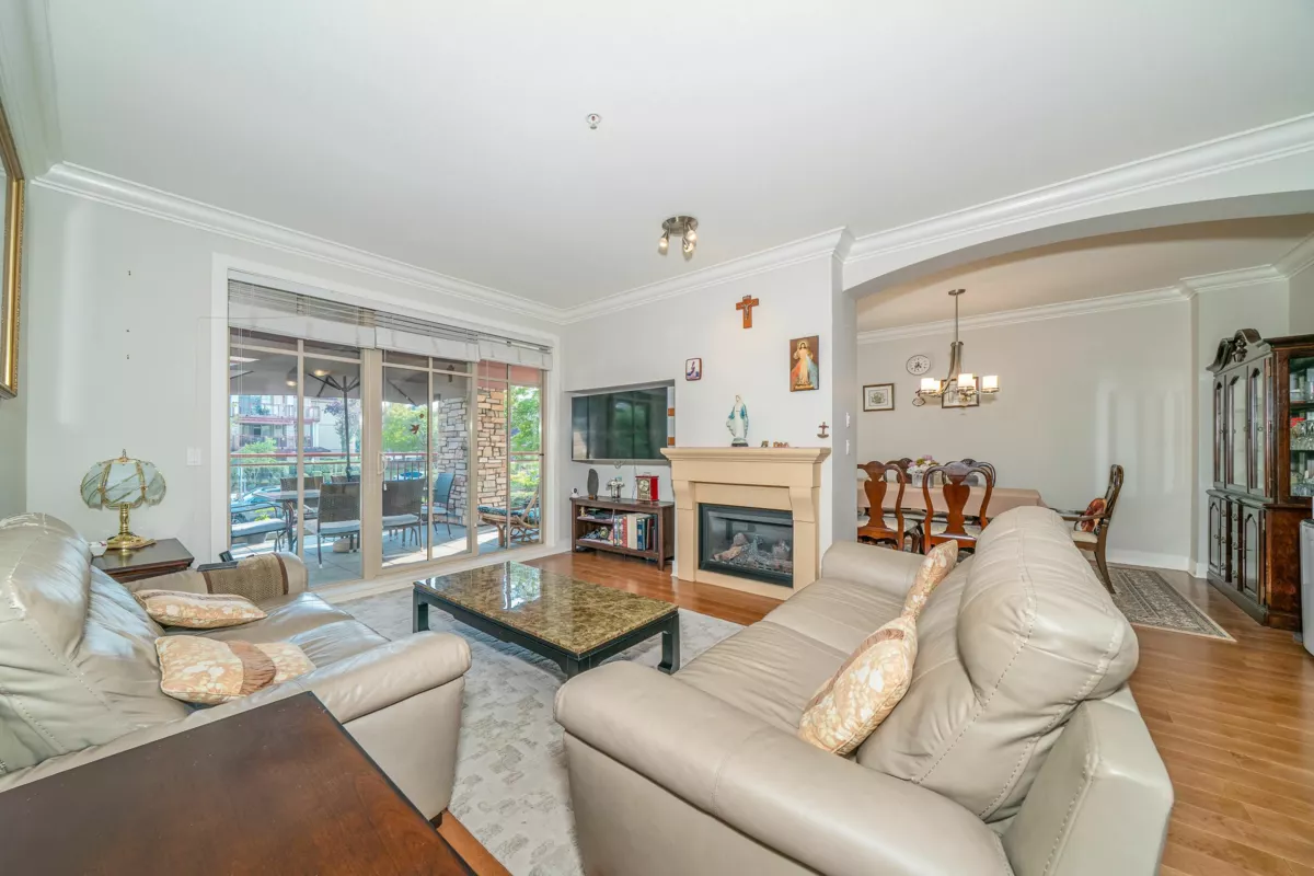 ST. ANDREWS AT NORTHVIEW. Welcome to this rare 2BD+Den end-unit offering enhanced privacy and a spacious layout. Standout features include luxurious radiant in-floor heating, a gas fireplace, and a massive balcony perfect for entertaining. Bonus: Storage locker is conveniently located on the same floor right outside your door, plus side-by-side parking stalls. Enjoy world-class amenities at the 5-star clubhouse: outdoor pool, hot tub, fitness center, guest suites, and an A/C library. Located steps from Northview Golf Course-this is resort-style living at its finest. End units in this complex are highly sought after and rarely available. Move-in ready and waiting for you!
