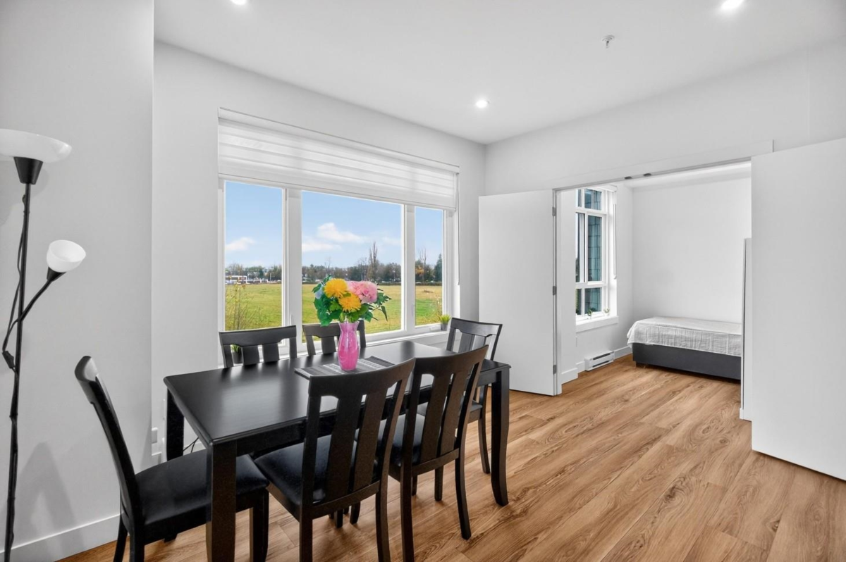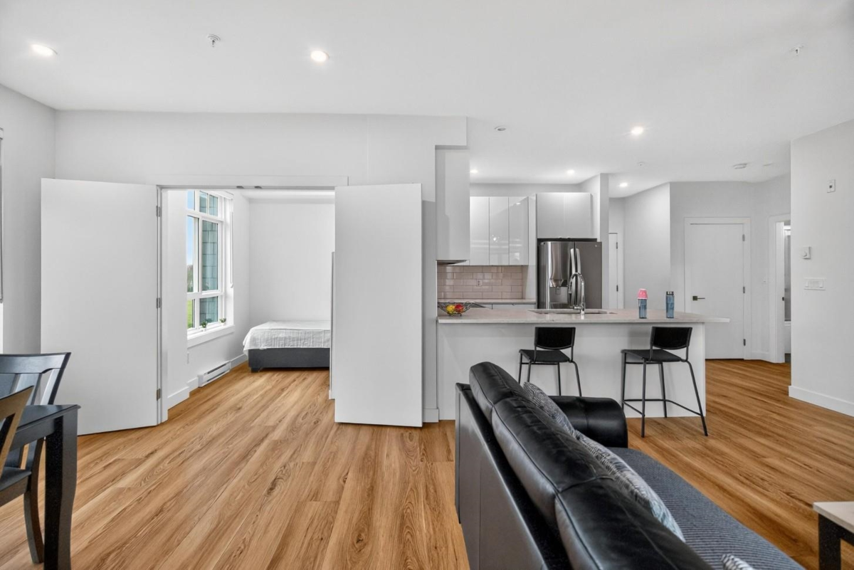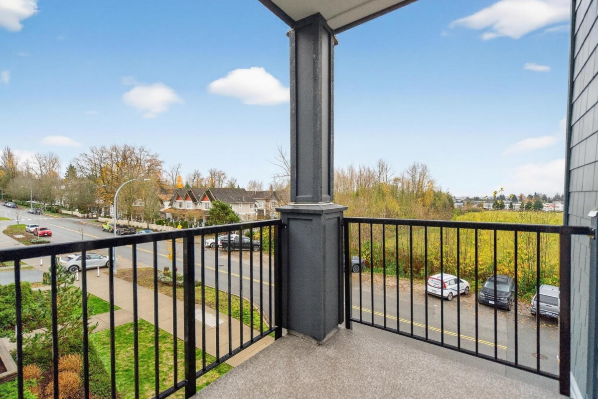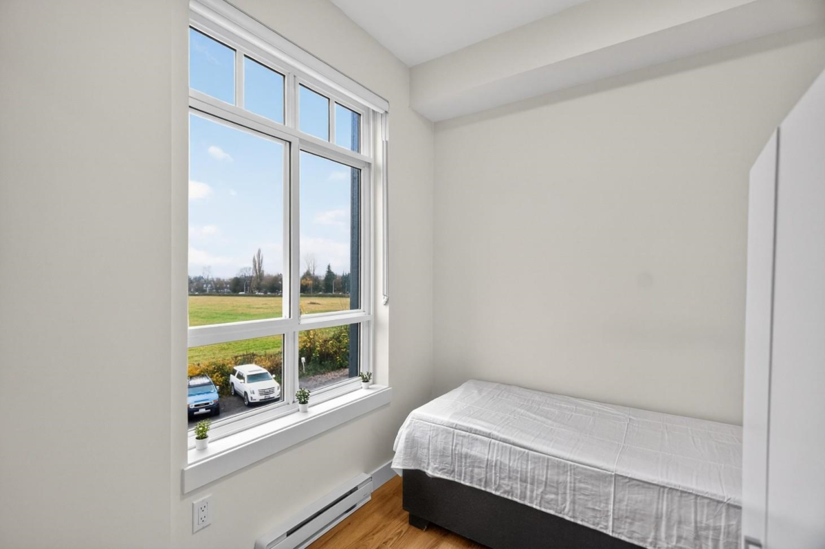 Spacious boutique living on the greenbelt! This bright 781 sq. ft. SE CORNER 2-bedroom home offers modern comfort with a sunlit living room with large windows & an open-concept layout featuring 9 ft. ceilings, a white kitchen with soft-close cabinetry, quartz counters, premium S/S appliances & a large island. Located in a 3-level boutique building with only 15 owner-occupied units built in 2023, it provides exceptional privacy. Upgrades include organized closets, zebra blinds & a full-size washer/dryer. The second bedroom has its own window & closet—not a junior suite. Enjoy a same-floor storage locker, 1 parking & a prime location minutes to schools, shopping, recreation & the Langley Events Centre. Pets welcome (2, no size restriction). Open House Dec 7th, Sunday, 2-4 PM