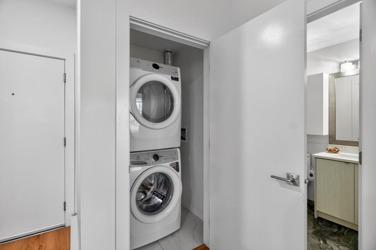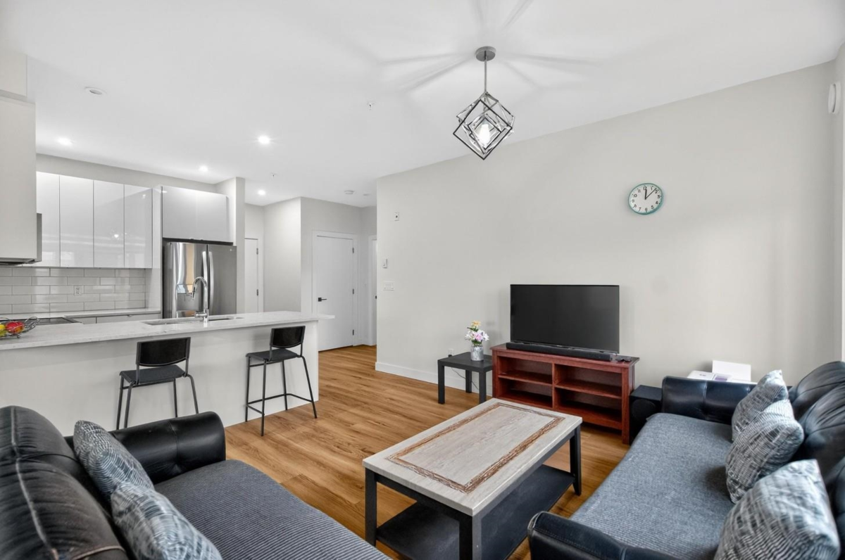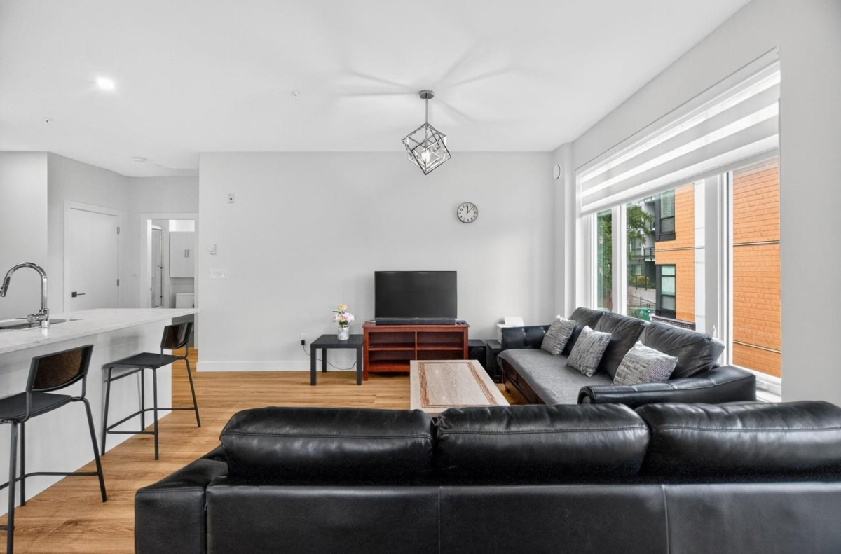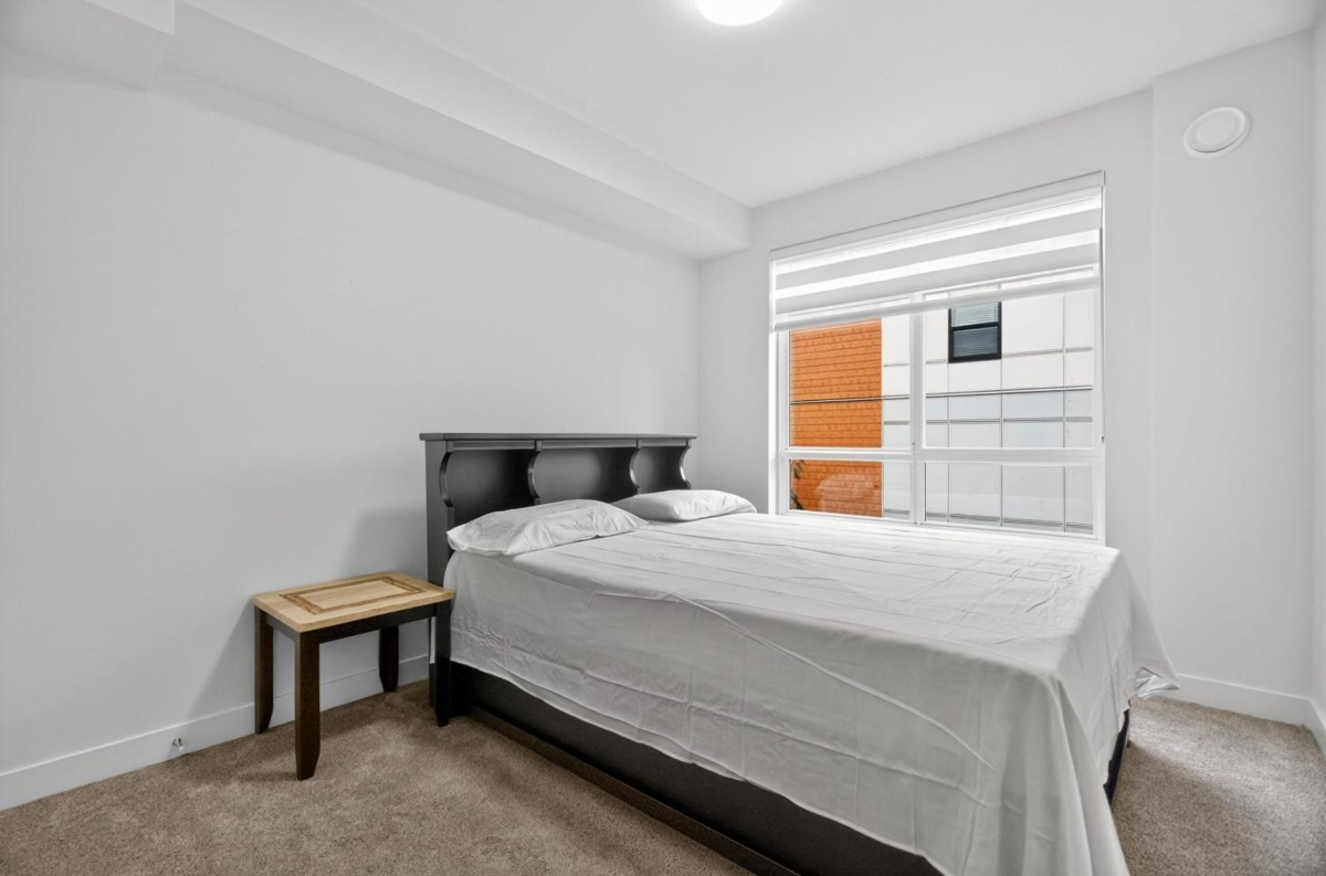 Spacious boutique living on the greenbelt! This bright 781 sq. ft. SE CORNER 2-bedroom home offers modern comfort with a sunlit living room with large windows & an open-concept layout featuring 9 ft. ceilings, a white kitchen with soft-close cabinetry, quartz counters, premium S/S appliances & a large island. Located in a 3-level boutique building with only 15 owner-occupied units built in 2023, it provides exceptional privacy. Upgrades include organized closets, zebra blinds & a full-size washer/dryer. The second bedroom has its own window & closet—not a junior suite. Enjoy a same-floor storage locker, 1 parking & a prime location minutes to schools, shopping, recreation & the Langley Events Centre. Pets welcome (2, no size restriction). Open House Dec 7th, Sunday, 2-4 PM