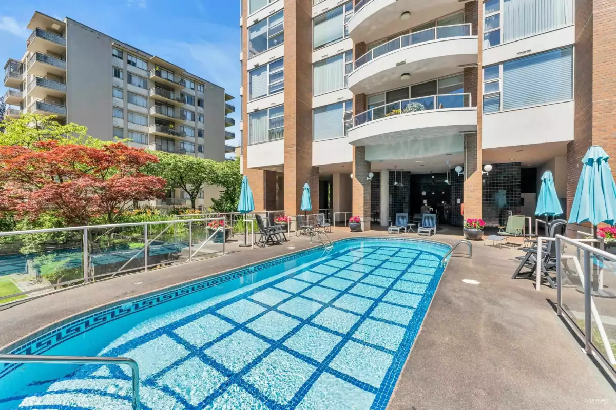 Well-known St. Moritz building in the heart of Kerrisdale designed by James Cheng Architect! Welcomed by the semi-circular driveway to the elegant enrance lobby surrounded by mature garden, Koi fish pond, outdoor pool, and gazebo. Close to transit, restaurants, banks, schools and community center. This unit has elegant layout and timeless design looking over the garden and pool with Cherry blossom views in the Spring. Specious 1,382 sf with 2 bedrooms plus a den which can beused as an extra bedroom. Well cared by the owner. 2 parkings and 1 locker. School catchment: Quilchena Elemetary and Point Grey Secondary.