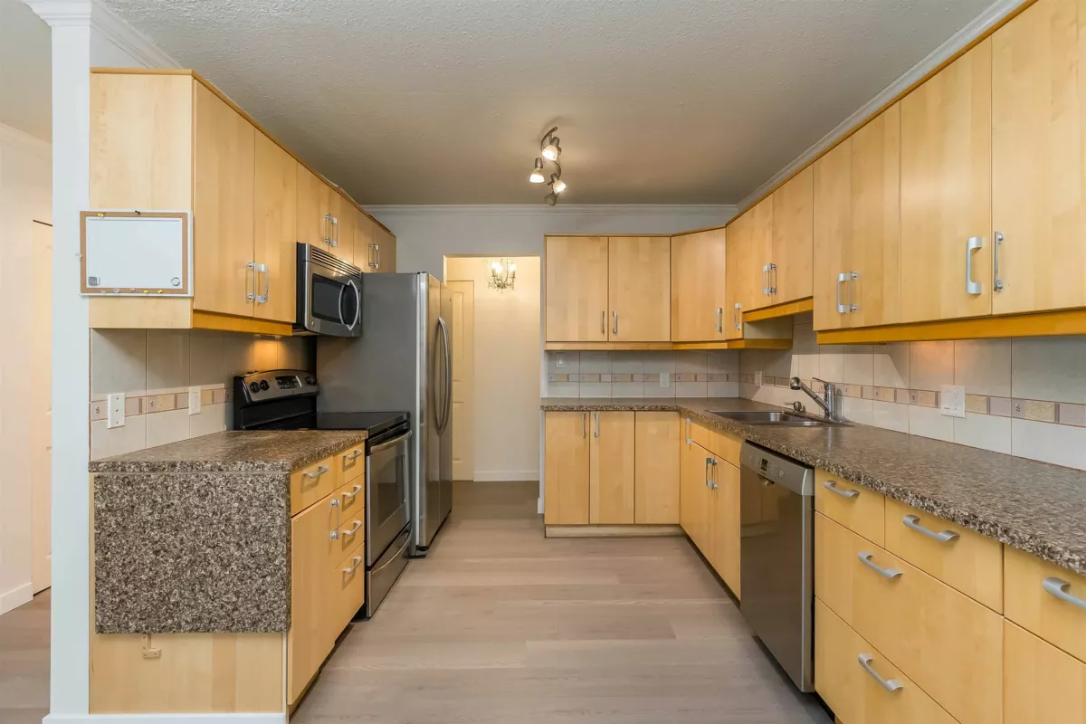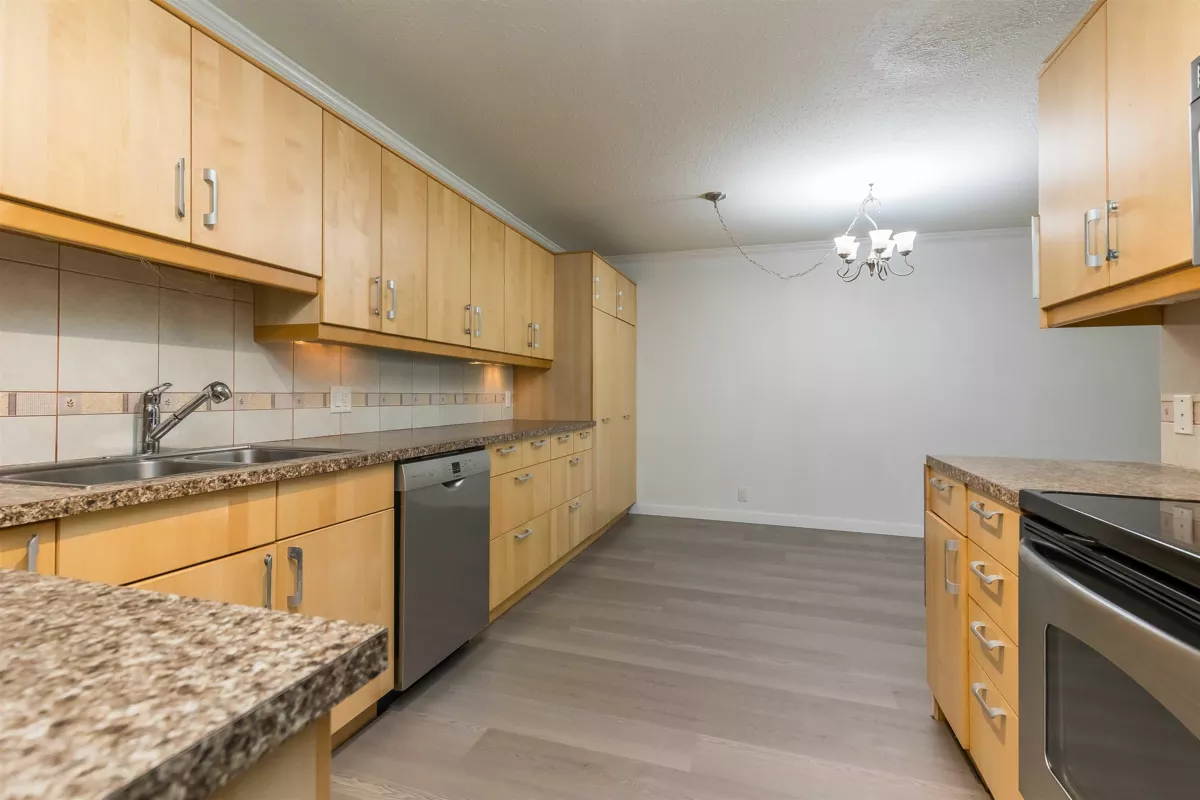 Beautiful 2 Bed Spacious layout, just under 1,000 sq.ft CORNER New Laminate Flooring, New paint & baseboards, Updated Kitchen with Cabinets thru to dining rm, Cupboards galore, oversized Custom Pantry w/ slide-outs, SS appliances, & under-cabinet lighting! Updated bathroom w/ walk-in shower! HUGE living rm w/ electric Fireplace. sprawling enclosed Solarium w/ vinyl plank flooring for even more year round living space! Bonus: In-Suite Laundry, large Storage Locker & 1 covered parking spot in the secure garage to complete this perfect package, just move in! Croft Manor, for 55 plus adult lifestyle condo with Games & Fitness rm, 2 Lounges! Pets are allowed w/ restrictions. Central location, shopping transit, etc. & great freeway access!