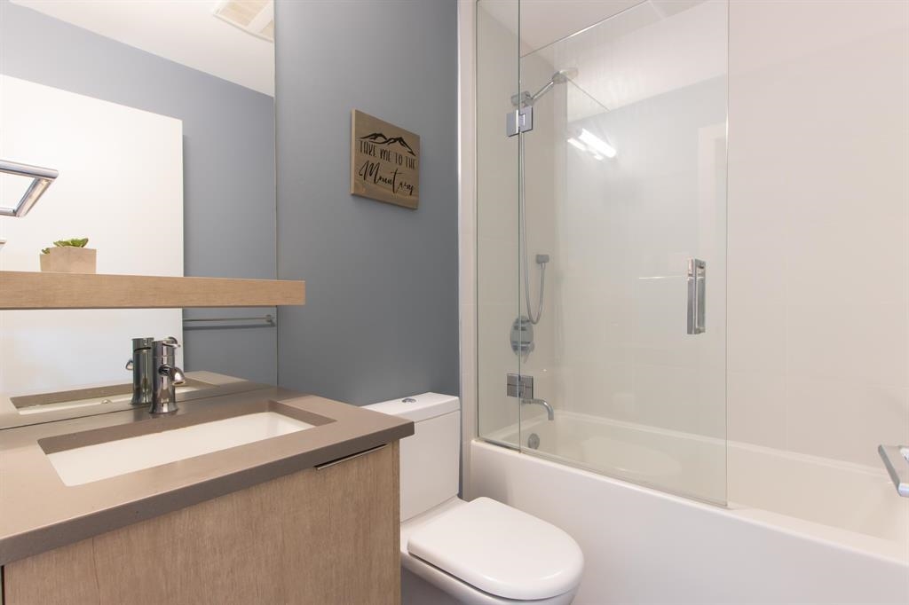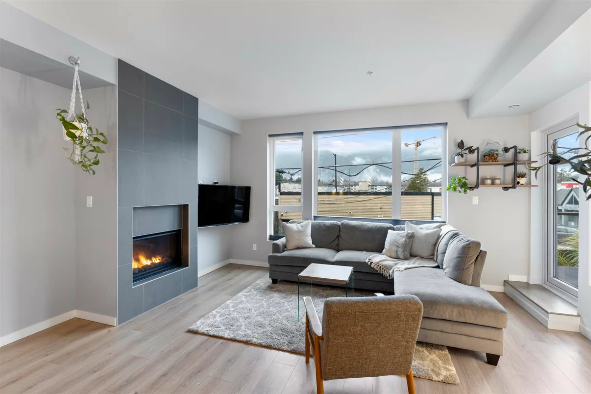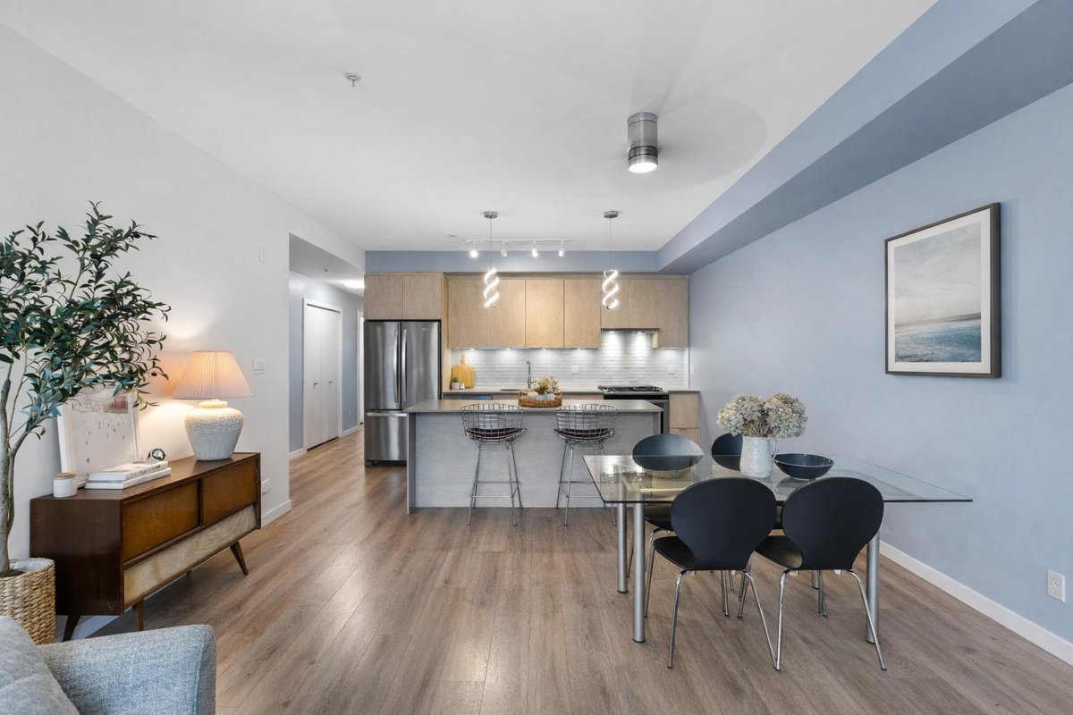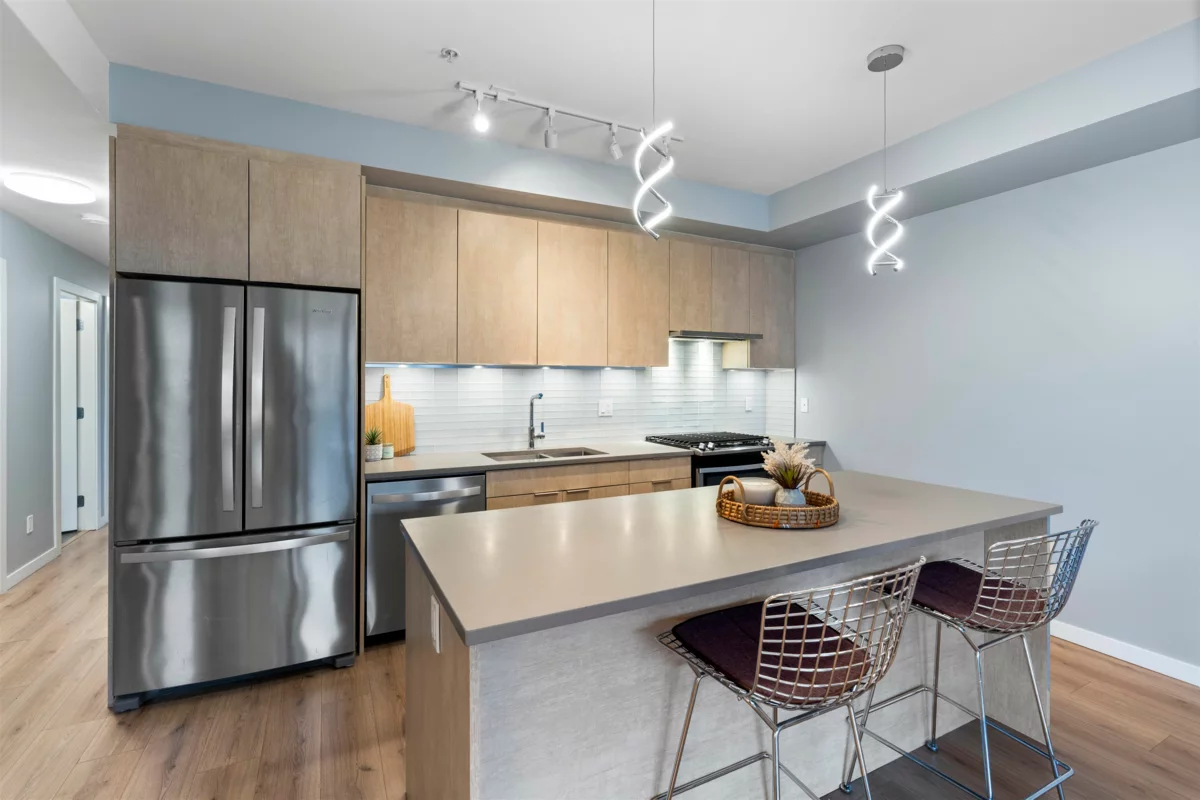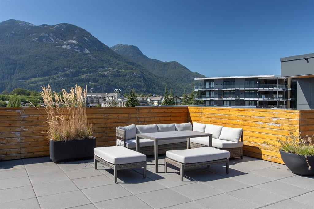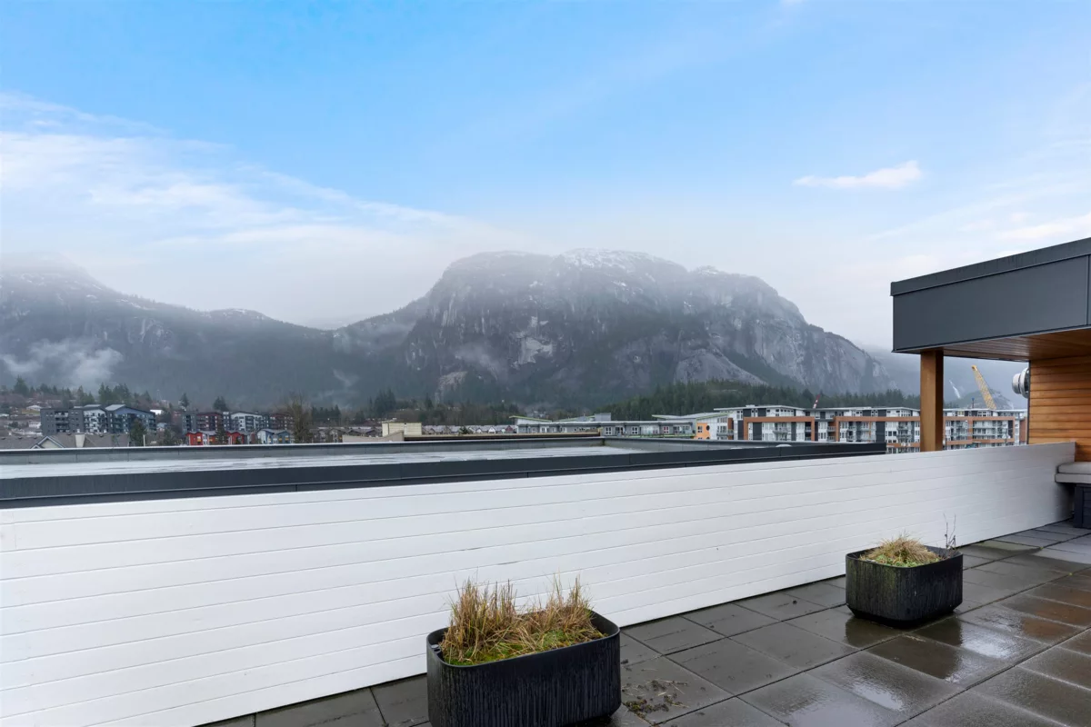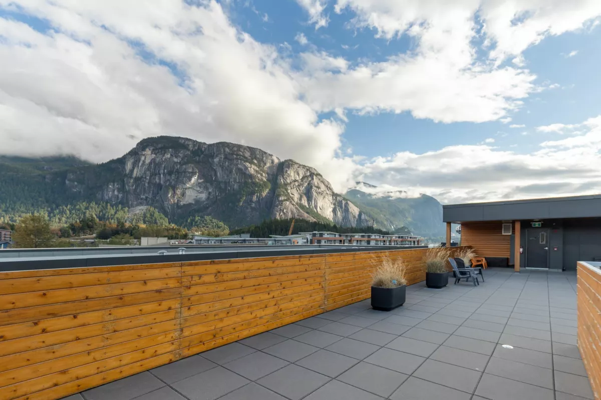 Discover life at Cleveland Gardens! This wide and spacious corner unit spans 1,060 sqft with 2 bedrooms, 2 bathrooms in a desirable split floorplan configuration. The modern kitchen is a chef’s dream, featuring stainless steel appliances, a gas range, and a large island ideal for entertaining. Cozy up by the gas fireplace or step out to your covered balcony with breathtaking views of the coastal mountains. The wide floorplan makes this not only a sleek and beautiful unit, but also an incredibly comfortable and versatile place to call home. Additional perks include lots of in-suite storage, 2x bike/storage spaces, secure parking and a rooftop patio with 360-degree views. Located in downtown Squamish, close to schools, trails, waterfront/marina, shops, cafes & more. This is a must-see unit!
