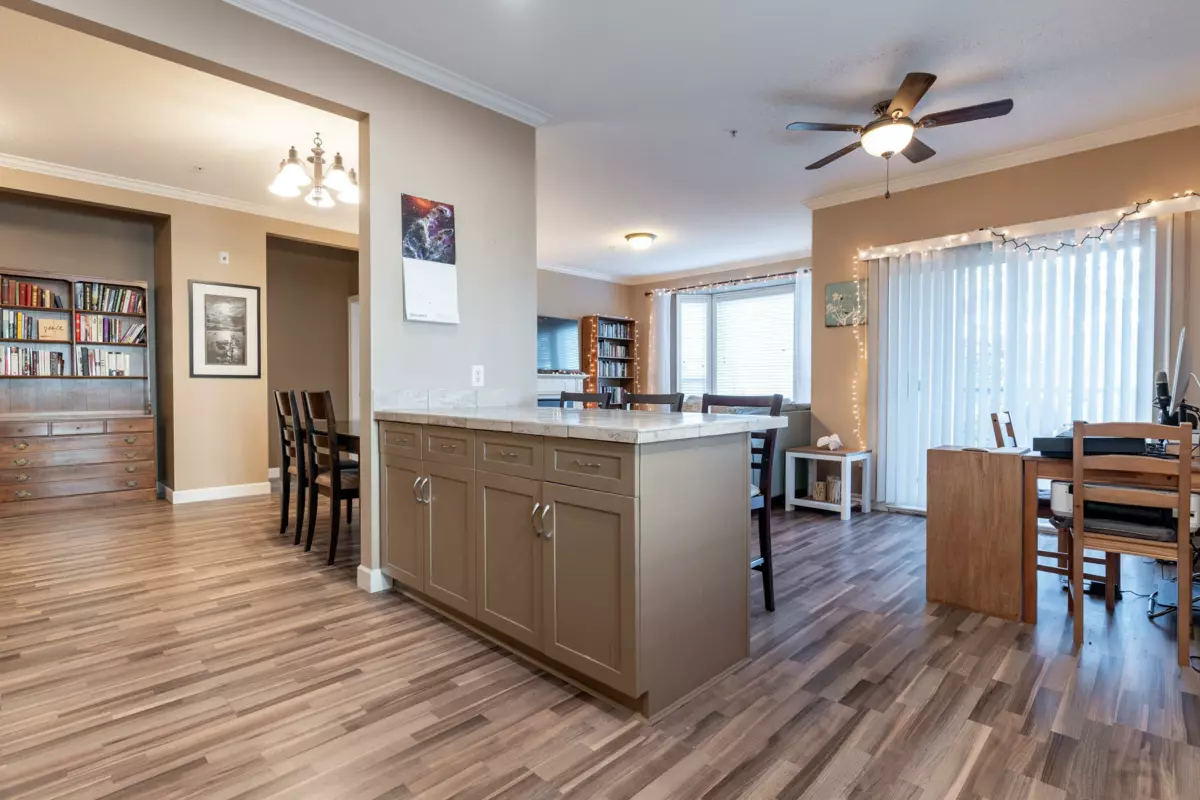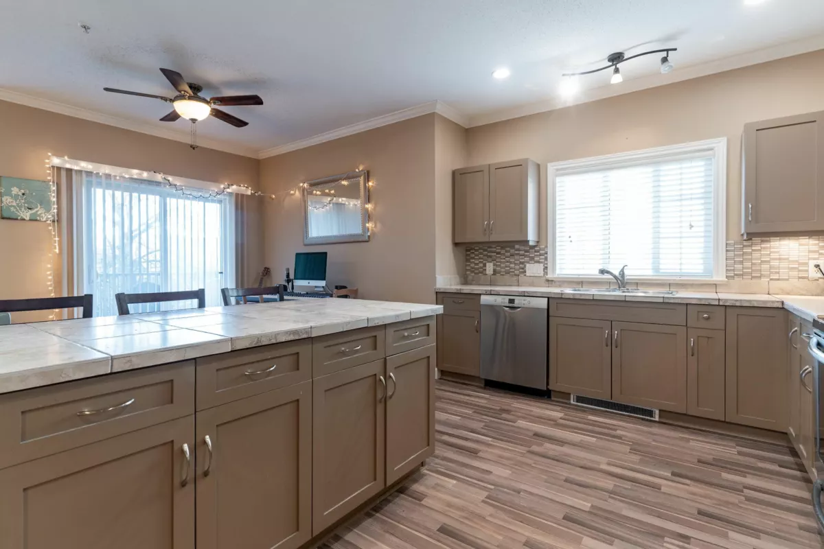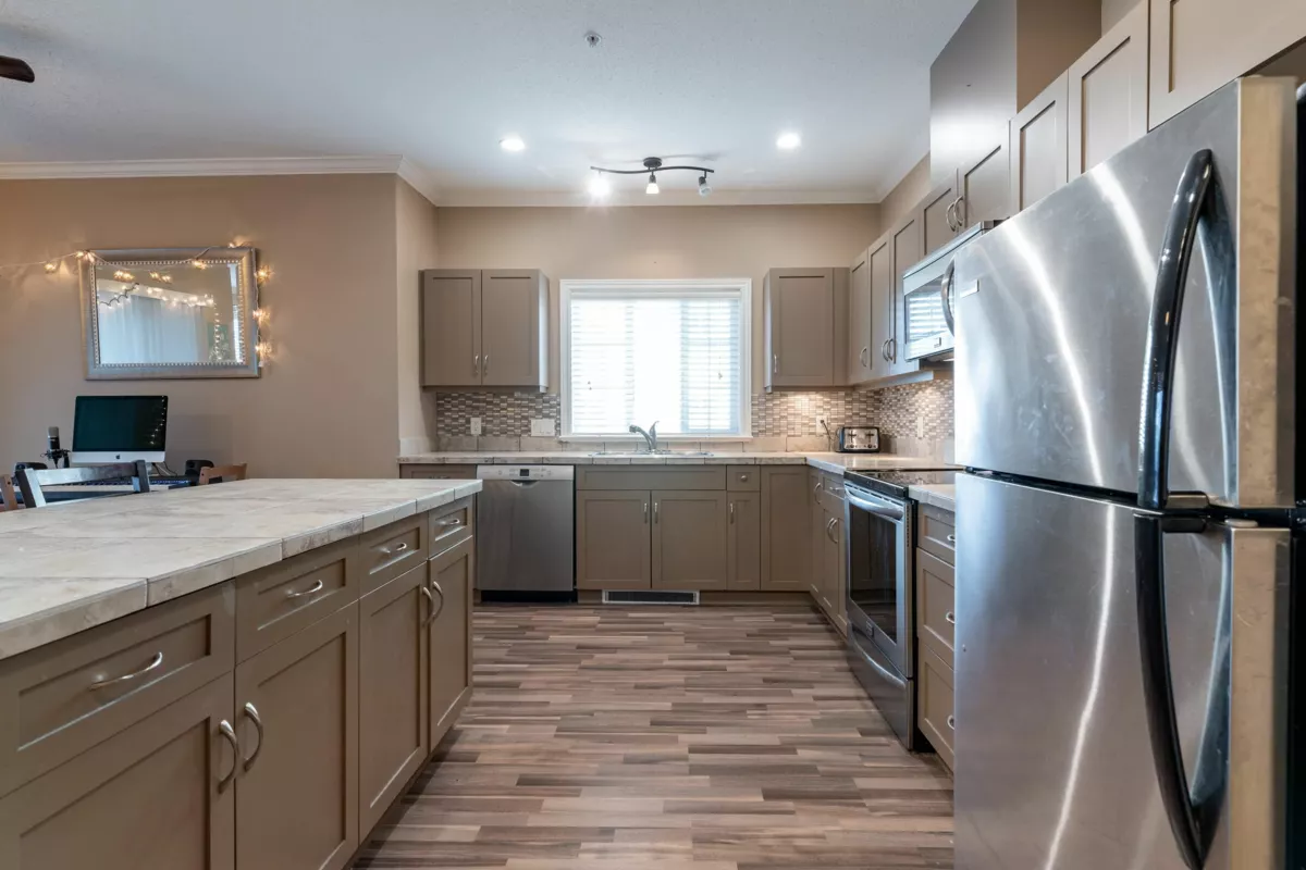 Discover your urban sanctuary: a beautifully styled corner unit home that's sure to make your life great. Bathed in sunlight, this two-bedroom home blends style & function with an open-concept layout of nearly 1200 sqft & tall ceilings. The primary bedroom offers a spacious retreat with a walk-in closet and sleek ensuite. Being a corner unit the kitchen is light filled & showcases stainless steel appliances, abundant counters, & plenty of storage. Elegant touches like crown moldings & quality flooring elevate the space, while large sliding doors lead to a balcony oasis. Two parking stalls & convenient storage complete this perfectly positioned home near shopping, recreation, and schools. Cats & dogs allowed. 2 parking spots & storage. Live your beautiful life in this home for many years.