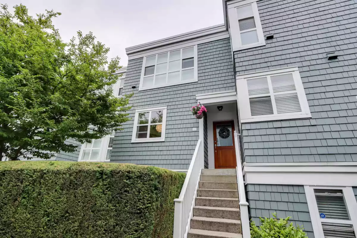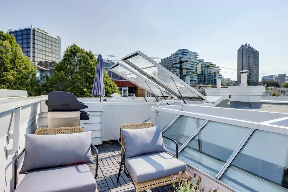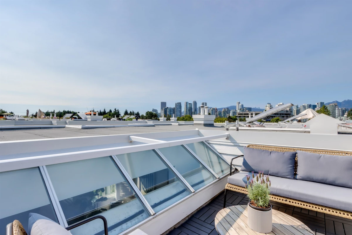 THE IVYS- Sought-after gated complex in Fairview Slopes! Charming 2 level 2 bed/2 bath townhome features a private rooftop deck with stunning city & mountain views. Well designed, ideal for individuals or couples, features 2 beds & 2 baths on the main level including spacious primary with walk-in closet. Upper level offers open plan, 9-ft ceilings, skylights, gas fp & updated kitchen with S/S appliances, granite counters & large pantry. Spanish-style tile flooring and in-floor radiant heat add comfort and character. Steps to Whole Foods, Home Depot, Save-On+ Broadway shops and restaurants. Short stroll to Cambie and Olympic Village Skytrain. Minutes to Vancouver's iconic seawall. 1 parking, storage, bike room. Well run proactive strata. Pets+ rentals welcome! Easy to show.