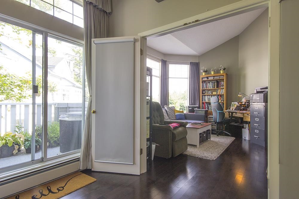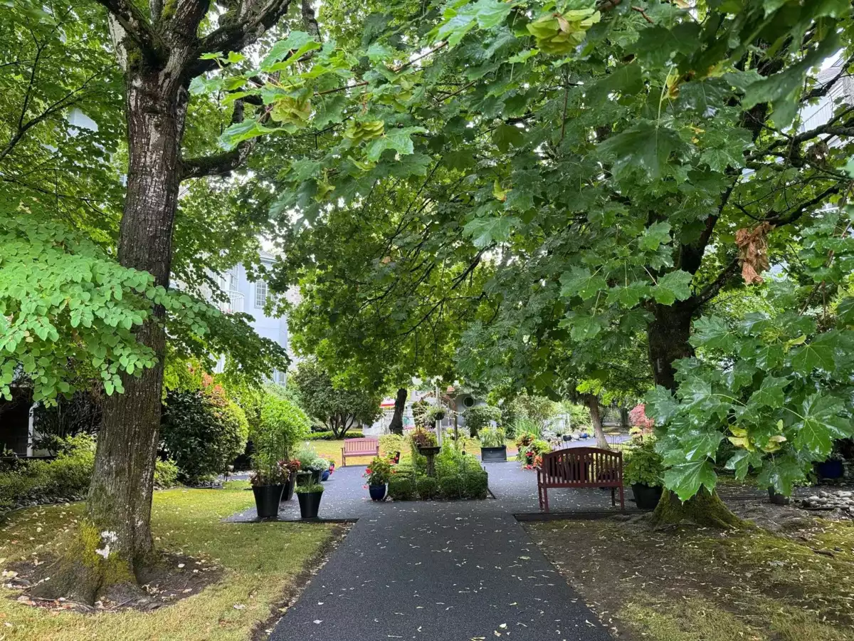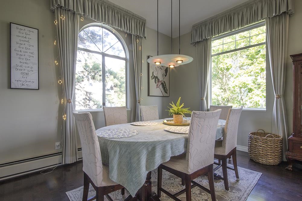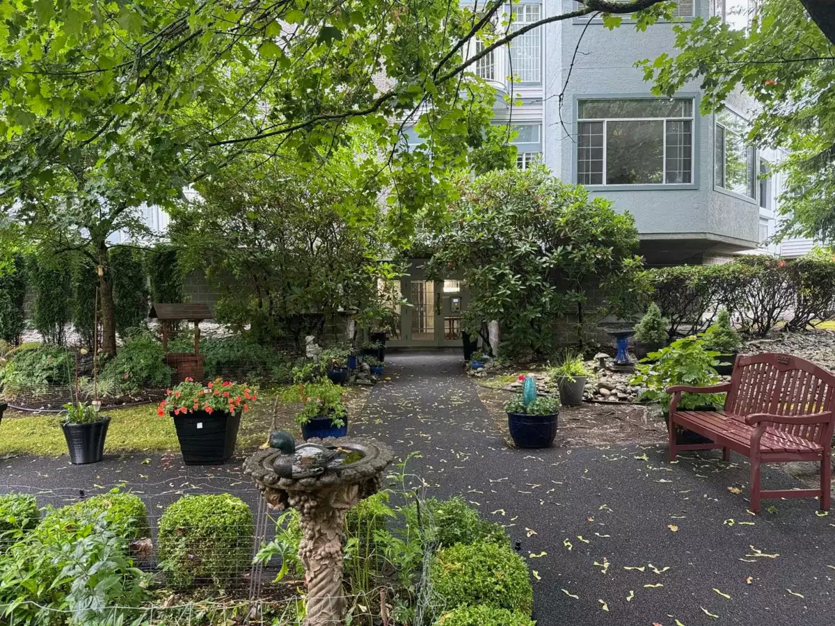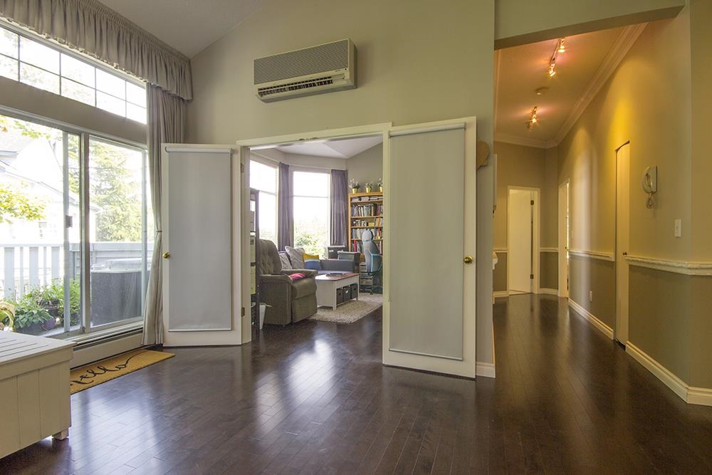 THIS IS YOUR CHANCE to live in the beautiful Bentley Wynd complex! Upon entering the gate, you will be welcomed by the FRESH park-like atmosphere of the gardens. Then, walk through the front door of your apartment, you will be impressed by the HIGH CEILINGS over 13-ft in most areas! Entire 1,873 sqft all in 1 level, GORGEOUS hardwood flooring, TALL and WIDE windows provide lots of natural light. Absolute cool COMFORT with refreshing AIR CONDITIONING or warm and cozy gas fireplace. ELEGANT dining room, breakfast nook, jetted tub, HUGE walk-in closet, spacious laundry room, wide entry hallway. It’s an END UNIT surrounded by trees providing privacy, it truly FEELS LIKE A HOUSE! 2 side-by-side parking, close to Richmond Centre, Skytrain and more
