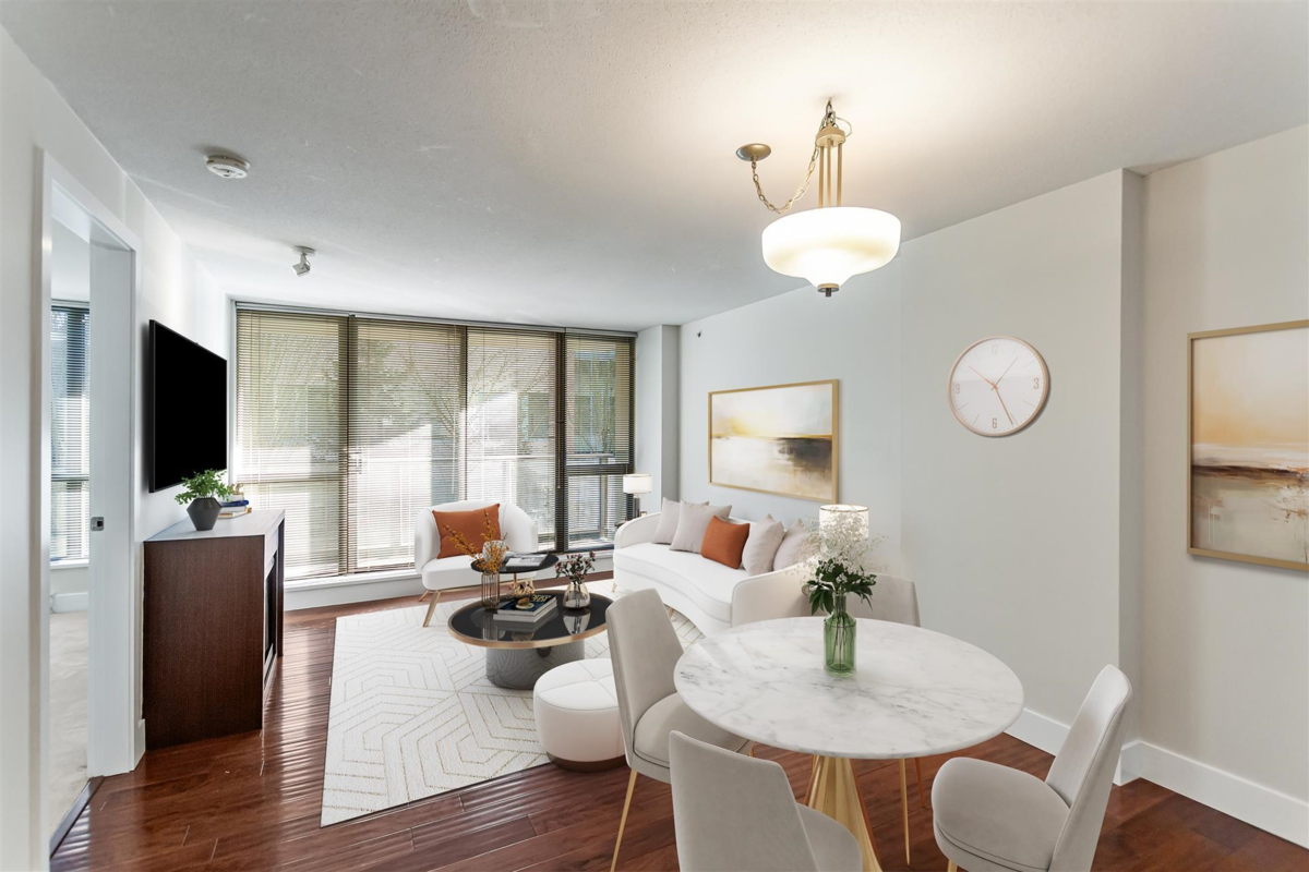 SPACIOUS 1 Bdrm + Den in The Parc! This bright 2nd flr suite offers 722 sq.ft. of open living w/engineered hrdwd flrs, granite counters & s/s appliances. Large primary w/walk-in closet, versatile den—perfect home office! Enjoy your morning coffee or evening unwind on the covered balcony. Freshly painted & move-in ready. Incl's 1 parking, 1 locker + access to concierge, fitness ctr, wine cellar, theatre & lounge. Unbeatable location; The civic address is on Glen, however the main building entrance is conveniently located off a quieter rd way, offering easy & stress-free access. A walk to Coq Ctr, SkyTrain, Douglas, Riverside Sec, Lafarge, groceries, trendy cafés & dining. No car needed! Ideal for first-time buyers or investors seeking comfort, space & convenience in the heart of Coquitlam.