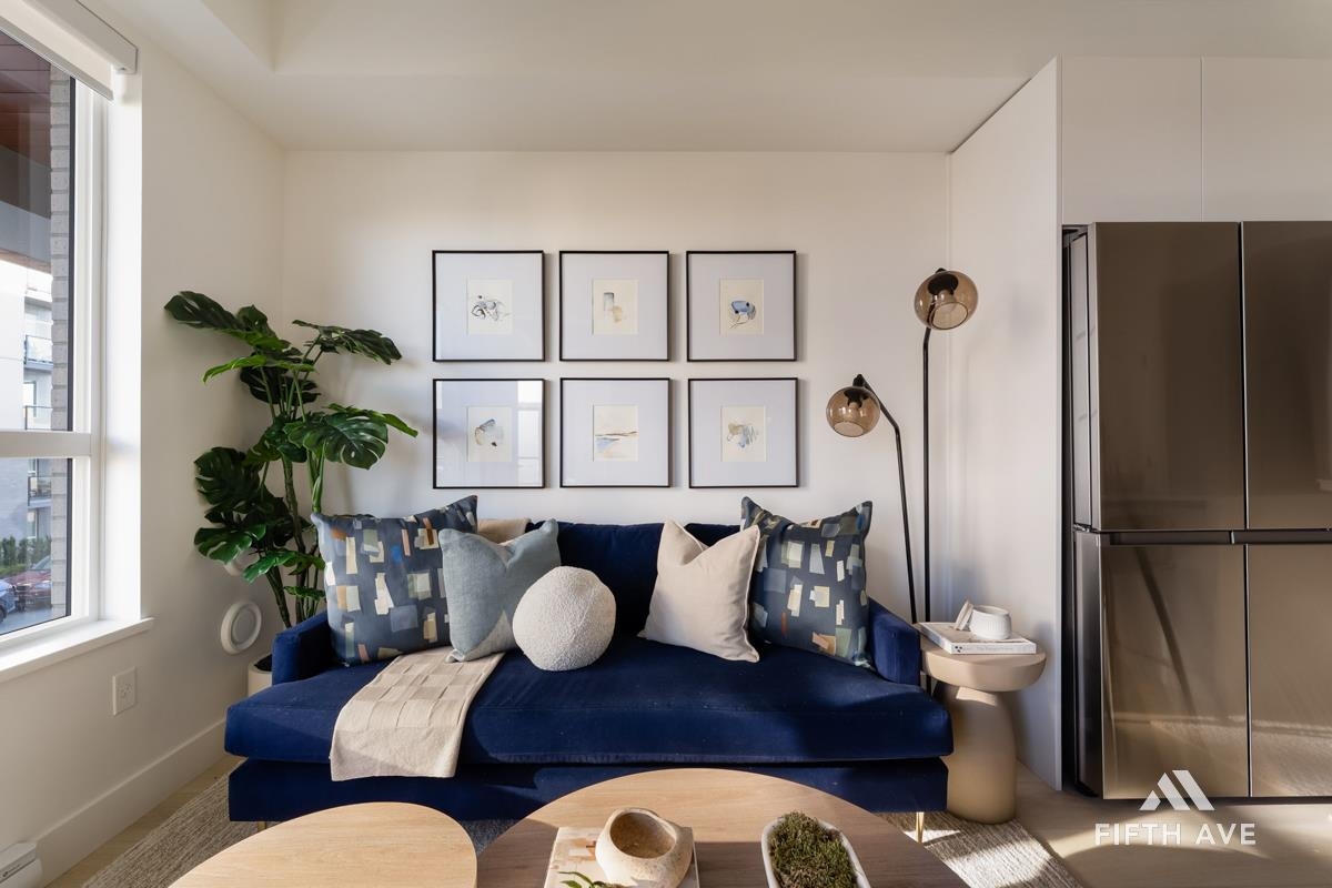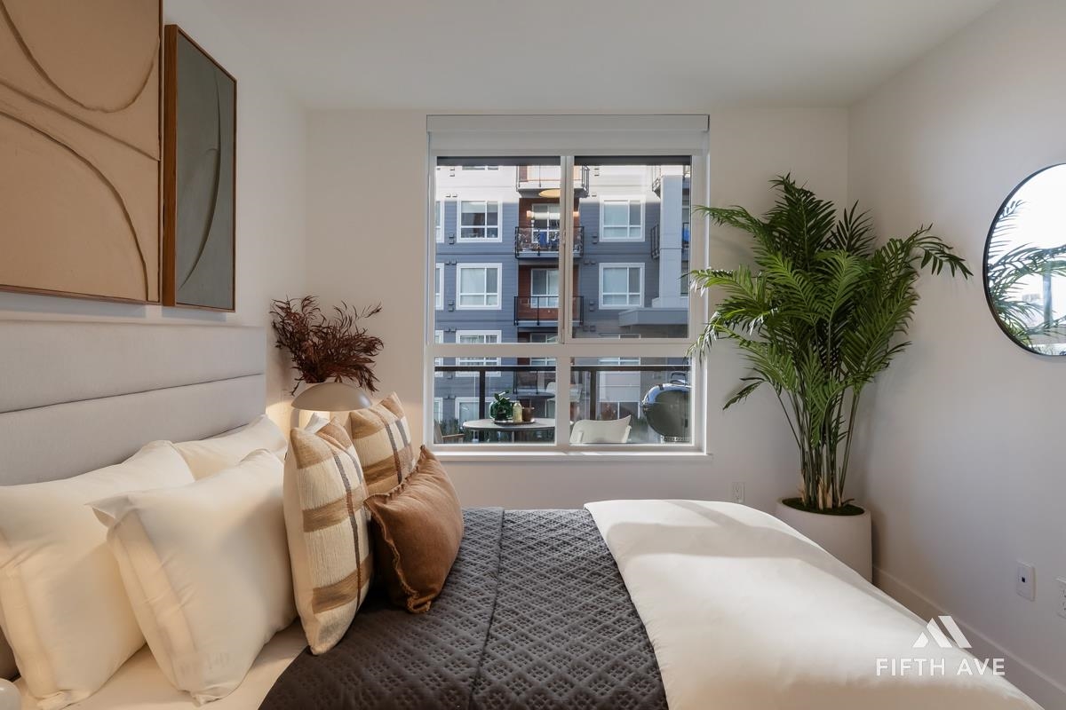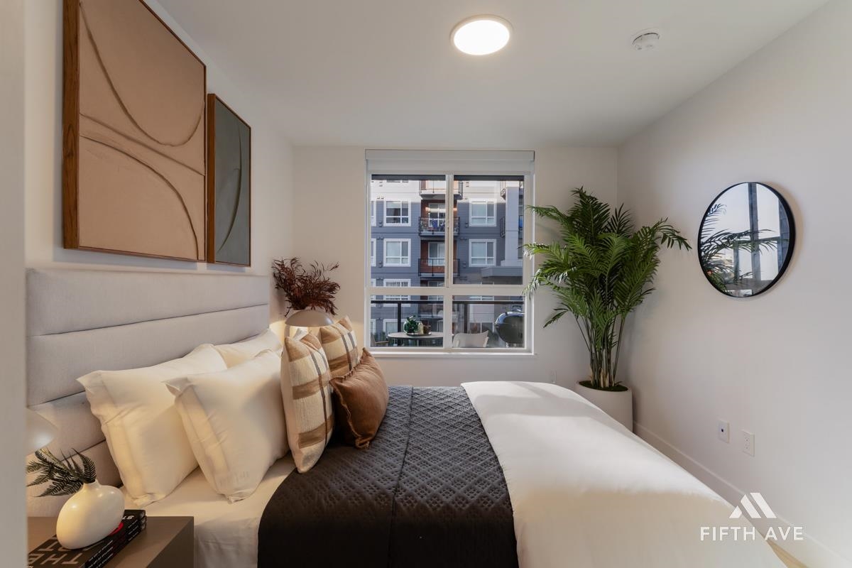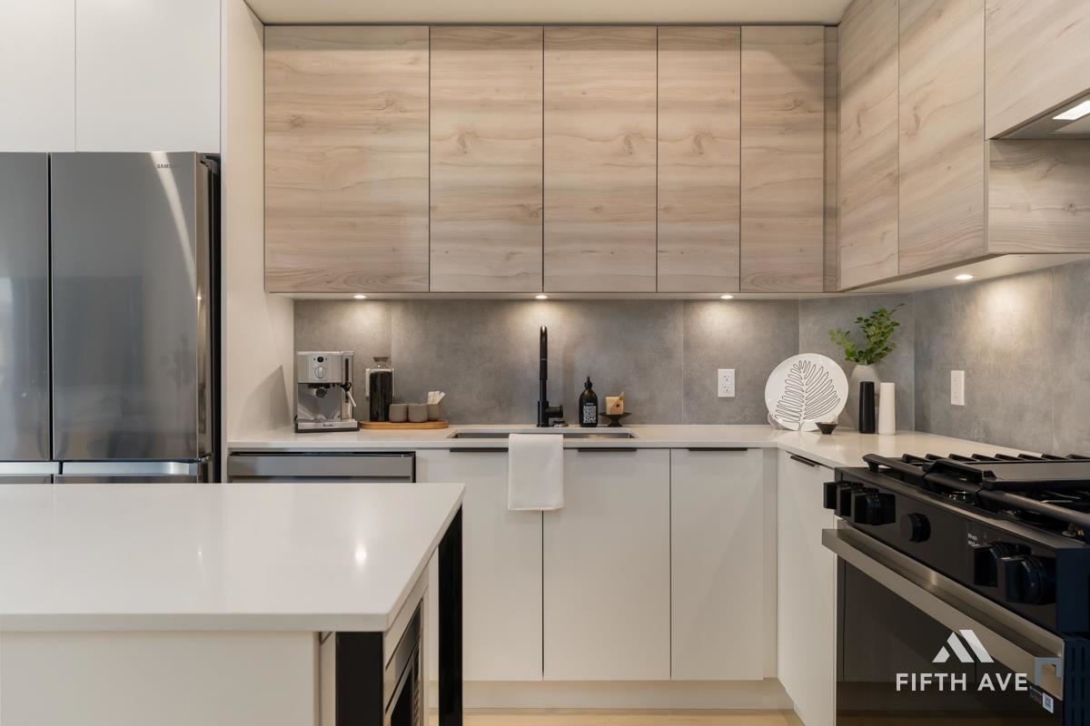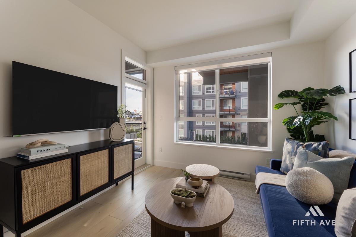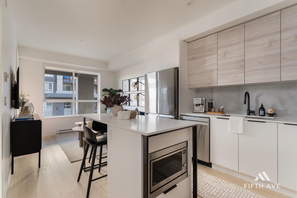 Move in ready at Highstreet Village - Abbotsford's best-selling community. This 1-bed 1-bath home features a modern kitchen, quartz countertops, two-tone cabinetry, stainless steel appliances, including an upgraded smart fridge and gas range. The spa-inspired bathroom includes a frameless glass shower and contemporary finishes. Large covered sundeck. Centrally located next to Highstreet Shopping Centre, Hwy 1, and Abbotsford Airport, all levels of schools and more. 1 parking and 1 storage space included!