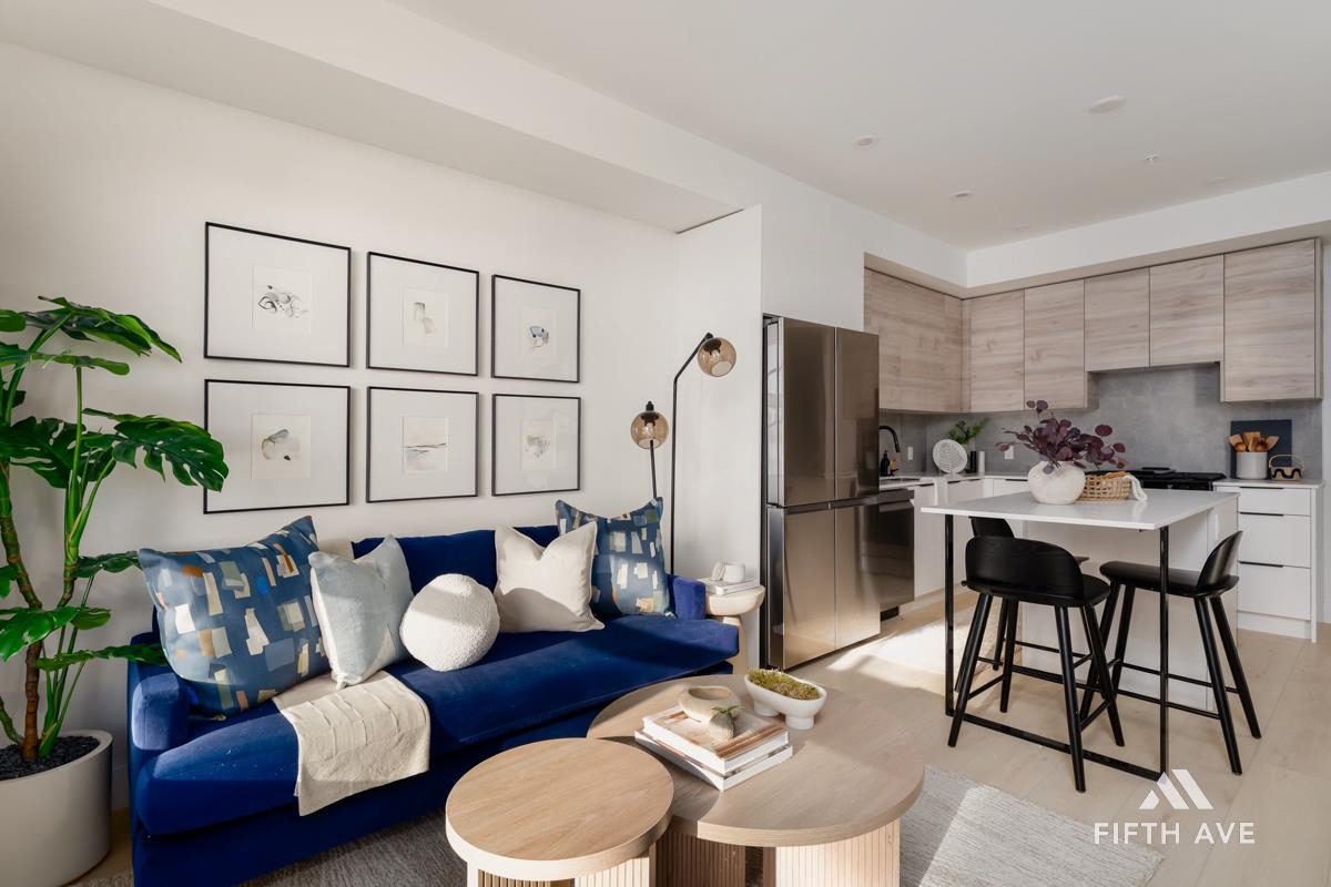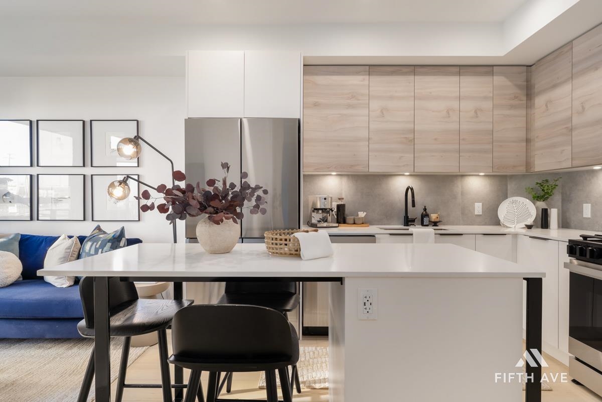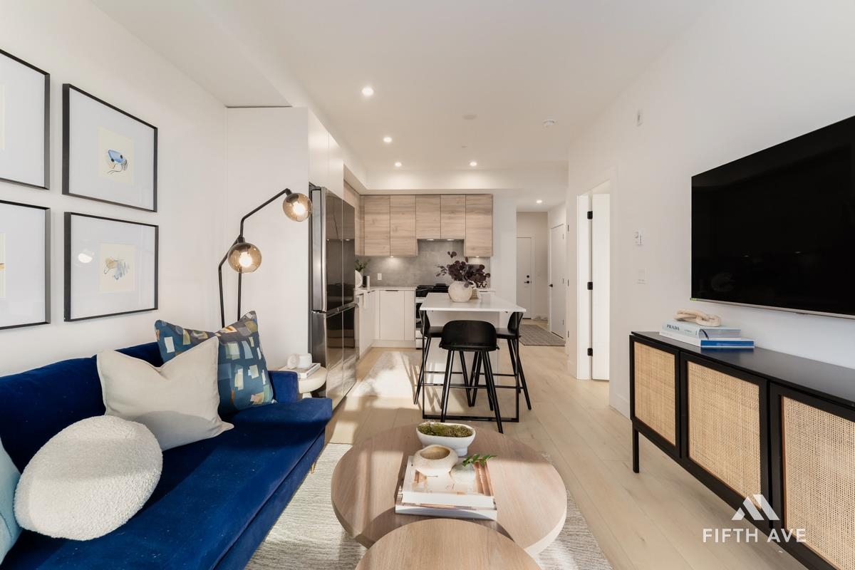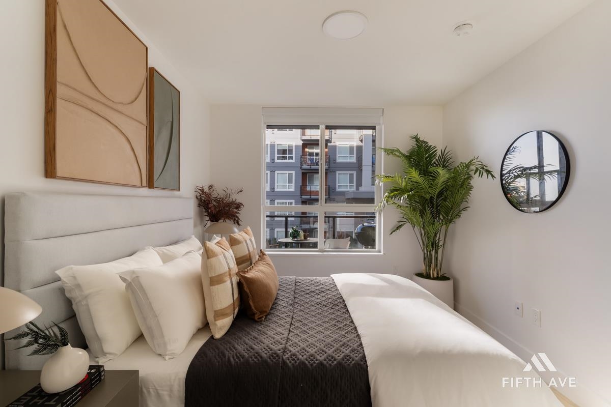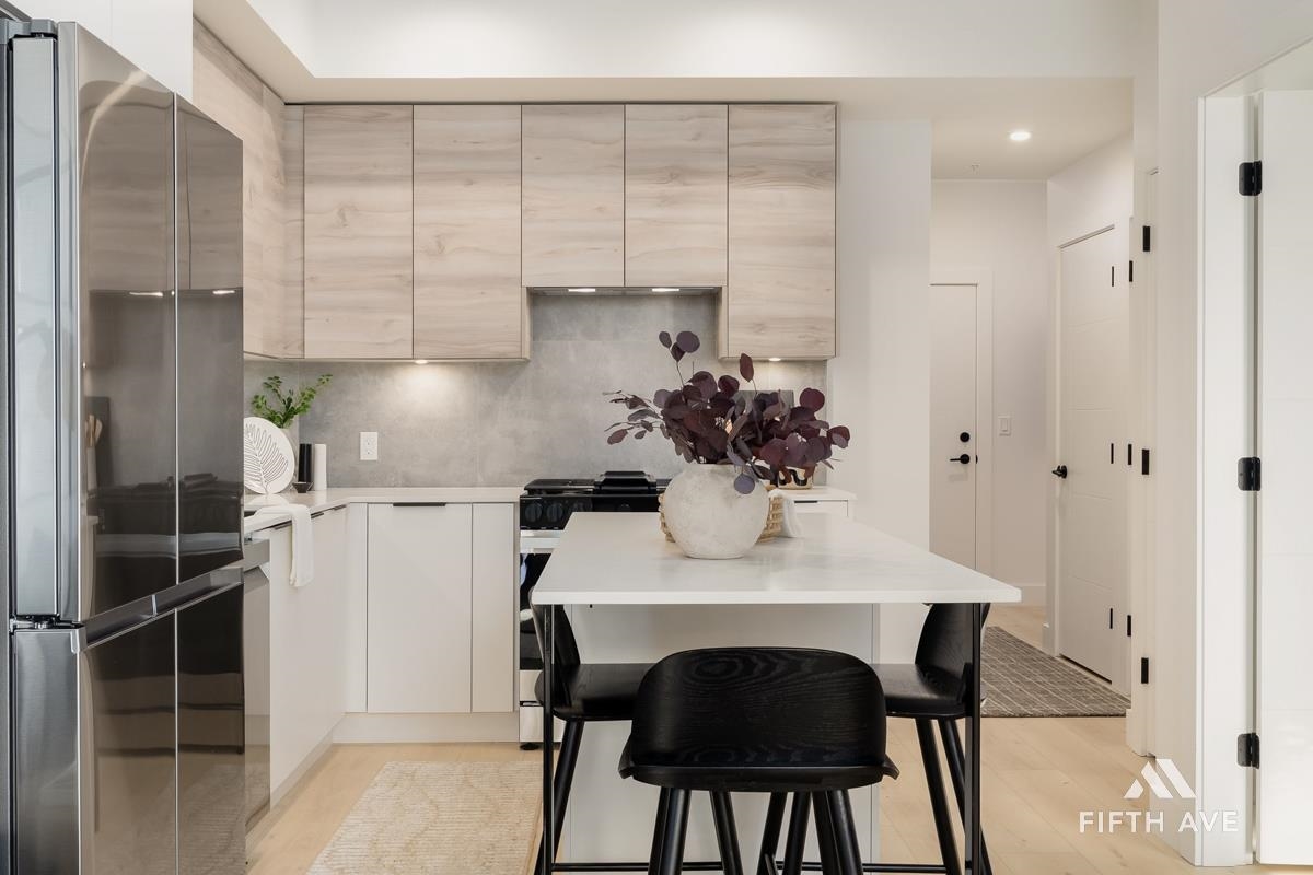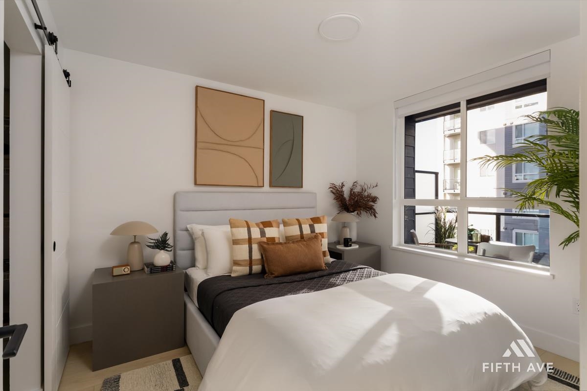 Move in ready at Highstreet Village - Abbotsford's best-selling community. This 1-bed 1-bath home features a modern kitchen, quartz countertops, two-tone cabinetry, stainless steel appliances, including an upgraded smart fridge and gas range. The spa-inspired bathroom includes a frameless glass shower and contemporary finishes. Large covered sundeck. Centrally located next to Highstreet Shopping Centre, Hwy 1, and Abbotsford Airport, all levels of schools and more. 1 parking and 1 storage space included!
