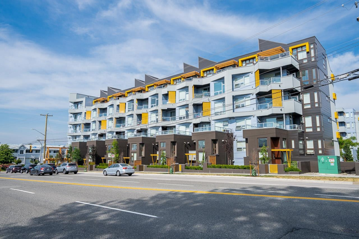 Bright modern 1 bedroom on the quiet side facing east to the beautifully landscaped courtyard. Relax with friends on the huge partly-covered 204 sq ft terrace -adding 1/3 of the size of the home to the living space! Features 2 side-by-side full-size secure parking stalls, common EV charging, large corner locker & bike room. Enjoy a Scandinavian-inspired interior, high ceilings, open plan, wide-plank flooring, spacious kitchen w/eating bar, stainless appliances, quartz counters, Fisher & Paykel fridge, in-suite laundry & storage room. Have fun in the courtyard w/picnic benches, lounge seating, fire pit, fitness space, & outdoor theatre for evening movies. Walk to Sevenoaks shopping, Mill Lake, trails, restaurants & transit. Easy freeway access. Rentals, children & pets welcome. Rare value!