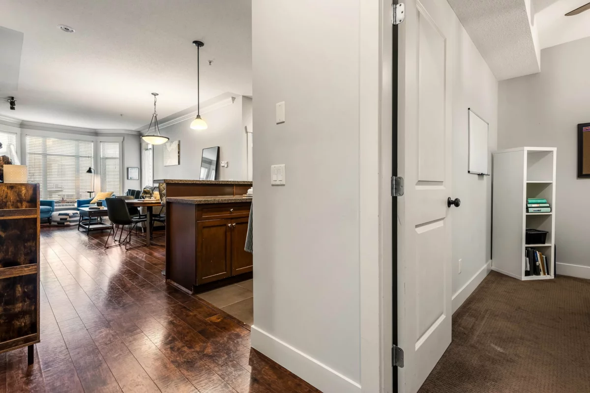 Welcome to The Regent! This bright and spacious second-floor unit offers 2 BEDROOMS, 2 BATHROOMS, PLUS A DEN— perfect for a home office! The open-concept layout features high ceilings, a kitchen with granite countertops, ample cabinetry, & an island with seating, flowing seamlessly into the dining area & living room with a COZY ELECTRIC FIREPLACE & access to the patio. THE PRIMARY BEDROOM INCLUDES AN ENSUITE WITH DOUBLE SINKS. Enjoy the convenience of IN-SUITE LAUNDRY with storage space & shelving, AIR CONDITIONING for year-round comfort, & a COVERED BALCONY WITH BEAUTIFUL MOUNTAIN VIEWS. This PET-FRIENDLY BUILDING includes one UNDERGROUND PARKING STALL & is ideally located within WALKING DISTANCE TO THE RECREATION CENTRE, PARKS, SHOPPING, DINING, & MORE! Don't miss this great opportunity!