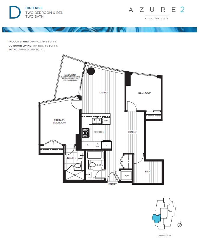 Discover this move-in-ready 2 bed + den home overlooking the peaceful courtyard and outdoor putting green at Azure. Enjoy a spacious U-shaped kitchen with breakfast bar, large pantry, and full-height cabinetry with under-cabinet lighting. A full dining area, separated bedrooms, and floor-to-ceiling windows create a bright and airy living space. Plus, a versatile den space suits an office or extra storage. Year-round comfort comes from the efficient heating and cooling system, along with access to in-building amenities including a Concierge, Fitness Centre, Amenity Lounge and guest suite. The Sales Centre will be closed for the holidays from Dec 19 to Jan 3, open by appointment only. Book an appointment with our Sales Team.