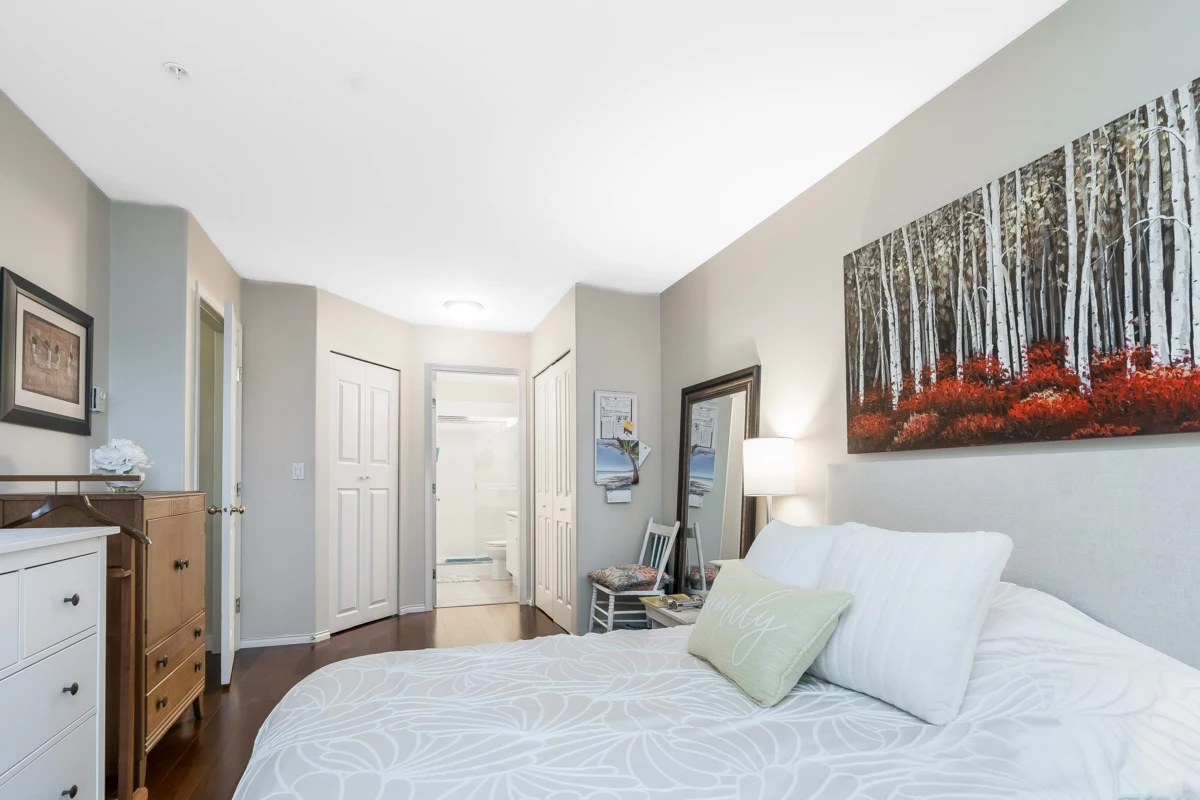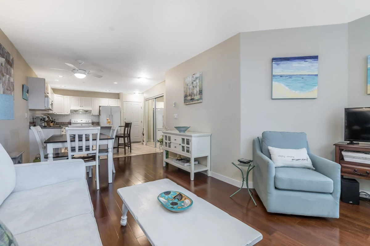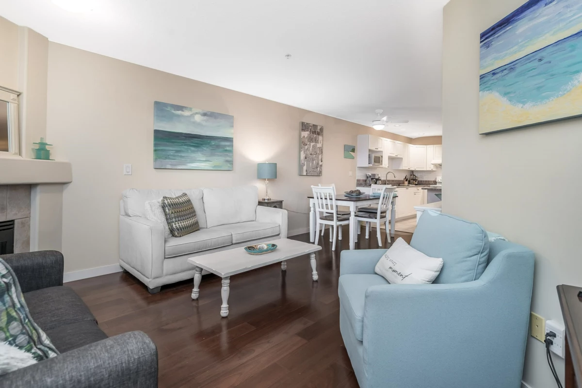 MONTECITO BY THE SEA. Bright & inviting 2 bedroom, 2 bath condo just steps from the beach, shops and restaurants of White Rock.Enjoy morning coffee by the ocean, evening strolls along the promenade and everything White Rock has to offer right outside your door. The west exposure from the balcony exposures offers beautiful sunset skies. Located at the back of the building, this condo enjoys a quiet setting while still being moments from the vibrant beachfront lifestyle. The well-designed layout is ideal for a single or first time buyer. Updated with hardwood flooring in main area & extra storage space in laundry rm. One pet (dog or cat) allowed, 1 parking stall & bike room. Fantastic & affordable opportunity to enjoy walkable seaside living in one of the most sought-after communities.