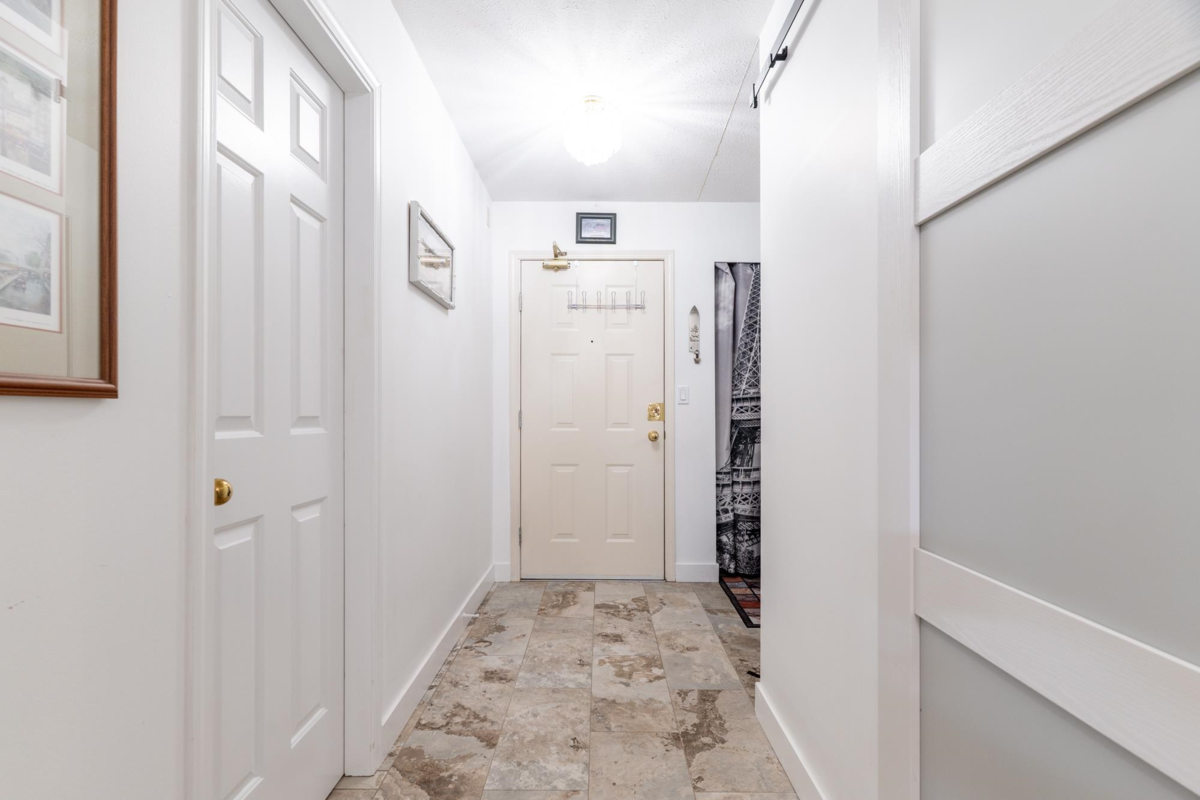 Welcome to The Carrington in Uptown White Rock! This beautifully updated 2-bedroom, 2-bathroom home offers 1,143 sq.ft. of bright, functional living space, + additional 154 sq.ft. of enclosed solarium-style space—perfect for a home office, reading nook, or extra lounging area. Newer laminate flooring in both bedrooms. Kitchen & bathrooms nicely updated w/modern new white cabinet doors and new tile flooring. South-facing windows flood the home with natural light, offering a warm, inviting atmosphere & even a small peek-a-boo ocean view! A full-sized laundry room adds everyday convenience. The well-maintained building features secure underground parking, a workshop, and a rec/party room. One resident must 55 and one cat allowed. Fantastic location close to all amenities!