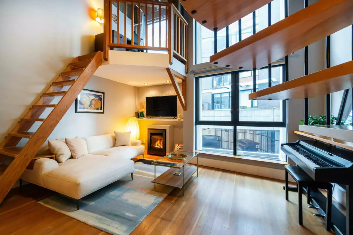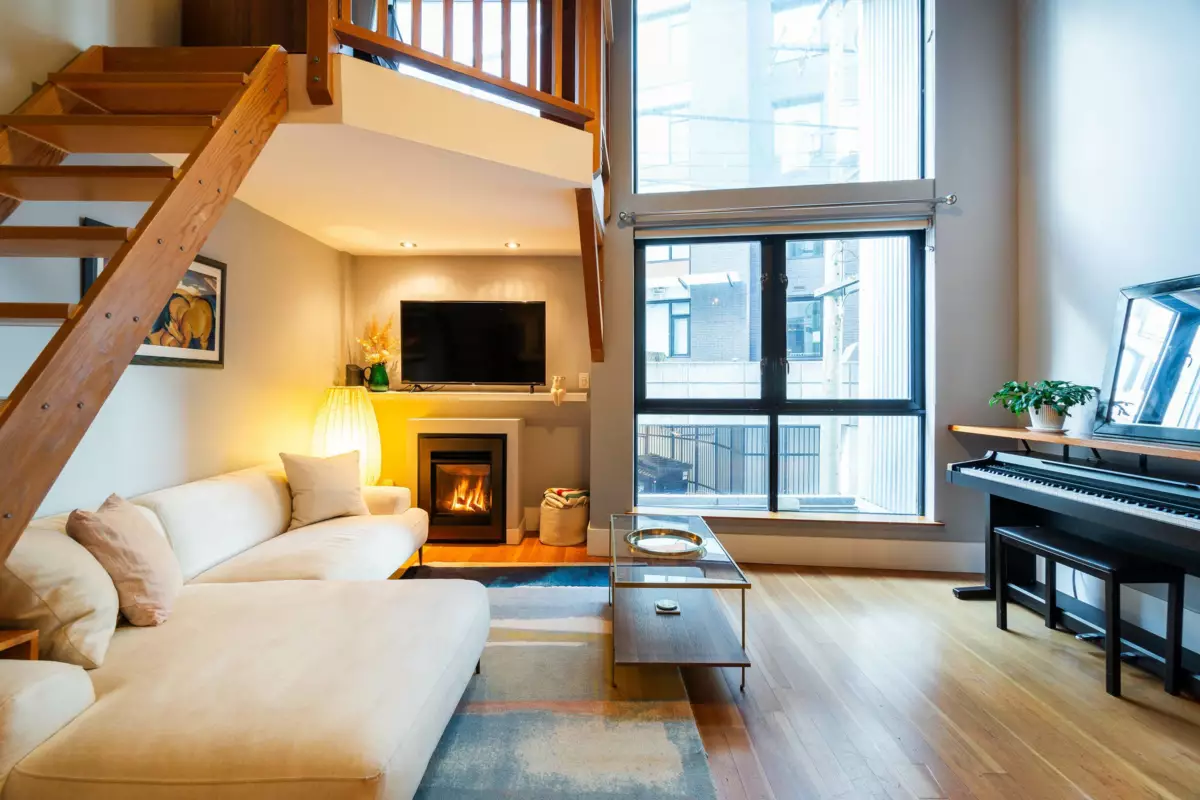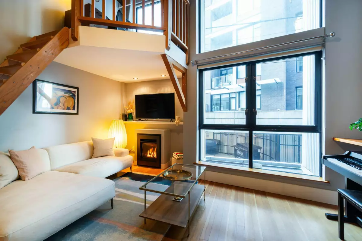 Granite Block, a unique live/work loft in the heart of Mt Pleasant! This 1007sf, 2 level loft boasts 16'6" ceilings & floor-to-ceiling windows w/ beautiful fir flooring. Open-concept incl spacious kitchen w/ s/s appls & island w/ ample stor & bar seating. Cozy up by the fireplace in the intimate living room or enjoy the office/den loft space, perfect for working from home. There's a large foyer & beautifully renovated bathroom adding a touch of luxury. A spiral staircase leads to lofted bedroom, complete w/ huge walk-in closet. Building also has rooftop deck w/ barbecue & views. Steps from Main Street's best eats, & breweries. Pets & rentals allowed w/ restr. An opportunity to own a chic & versatile loft in Van’s most vibrant hood!