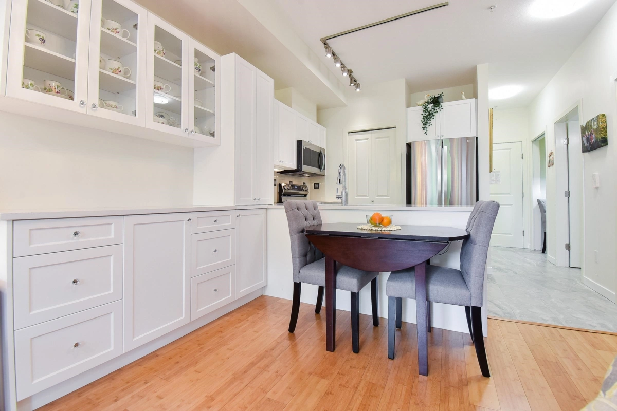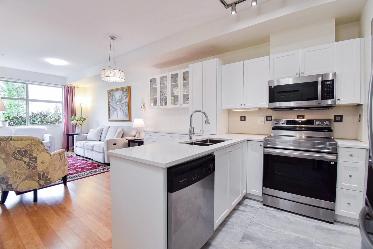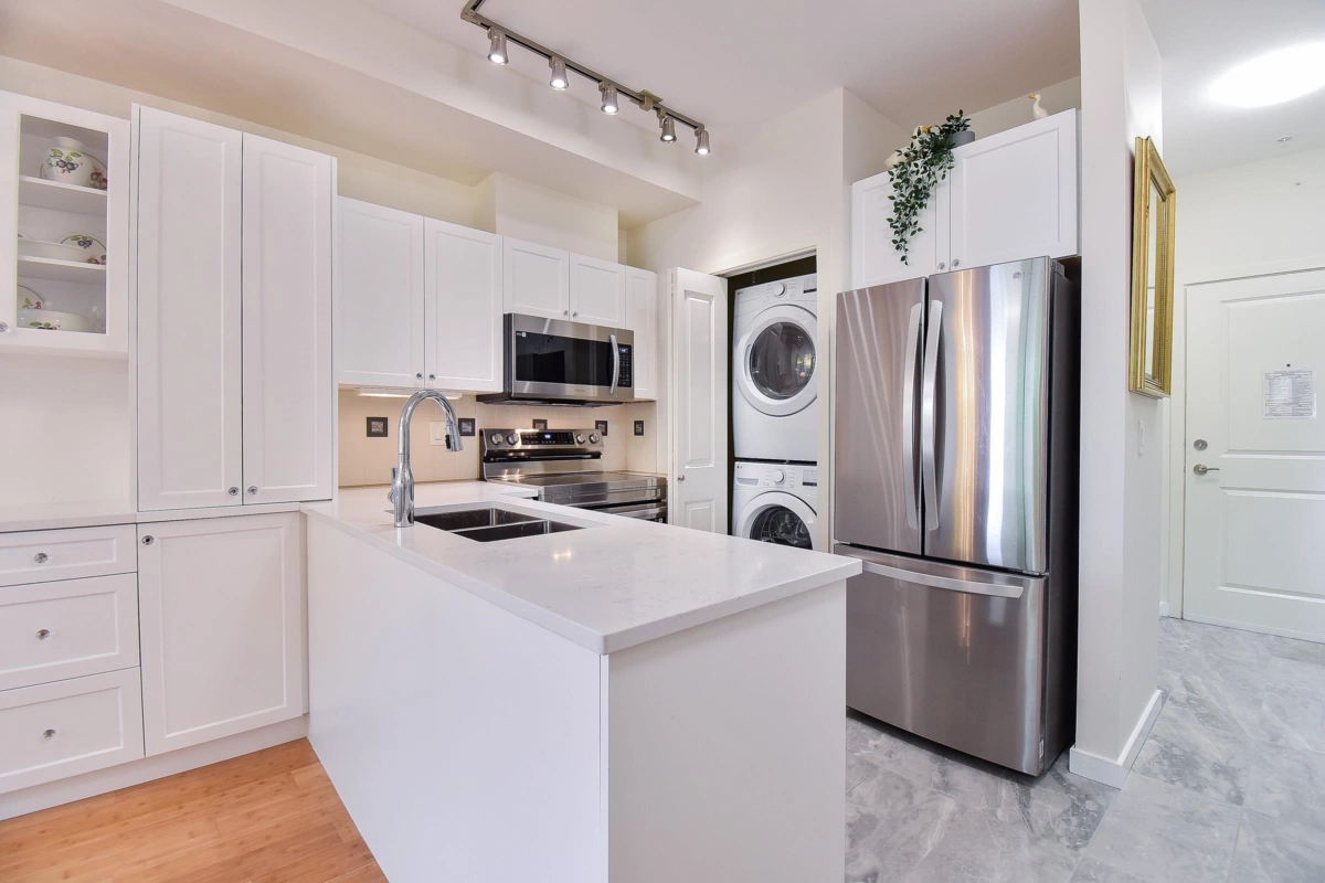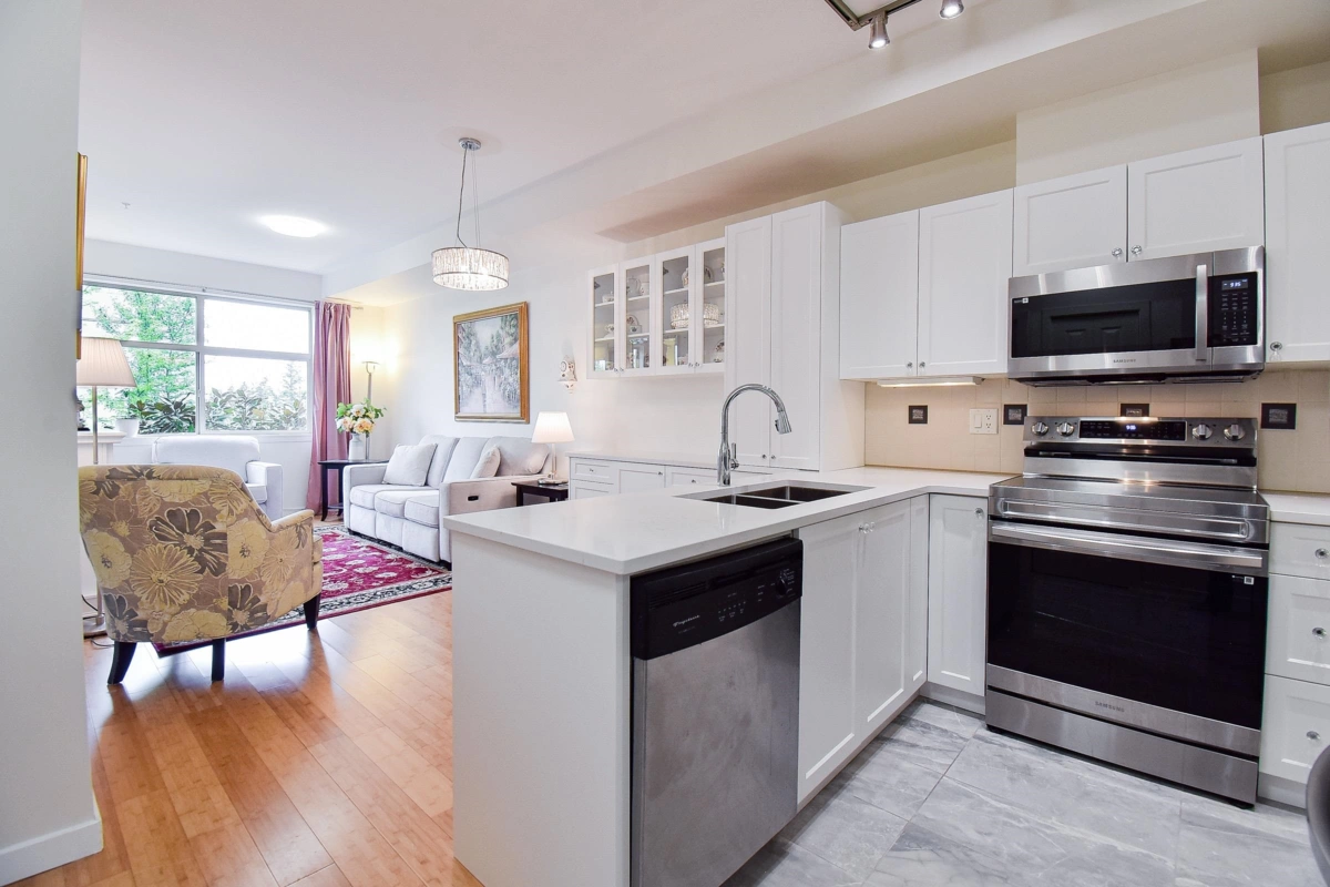 Luxury renovated suite with amazing amenities. PACIFICA 65+ retirement living! Immaculate, bright 1-bed, 1-bath end unit with 9ft ceilings, hardwood floors, and $70K in quality renovations. Features custom kitchen, quartz counters, new appliances, lighting, and bath upgrades. Enjoy NW-facing balcony and sunsets. Includes in-suite laundry, heat, hot water, electricity & secure parking with elevator access. Pet-friendly (1 under 20lbs). Resort amenities: pool, gym, dining, theatre, sports bar, library, planned outings & more. Steps to Peninsula Village shops and services. Meals & assisted living available for a fee. This is as retirement living should be. Book a private tour of the suite and the amenities now and let us show you home.