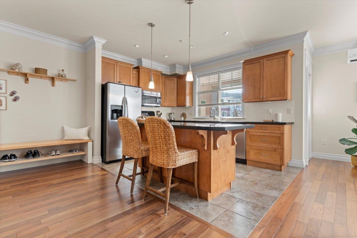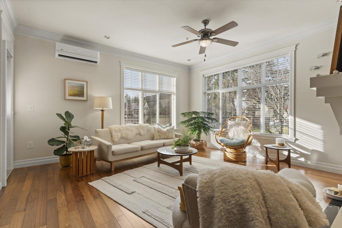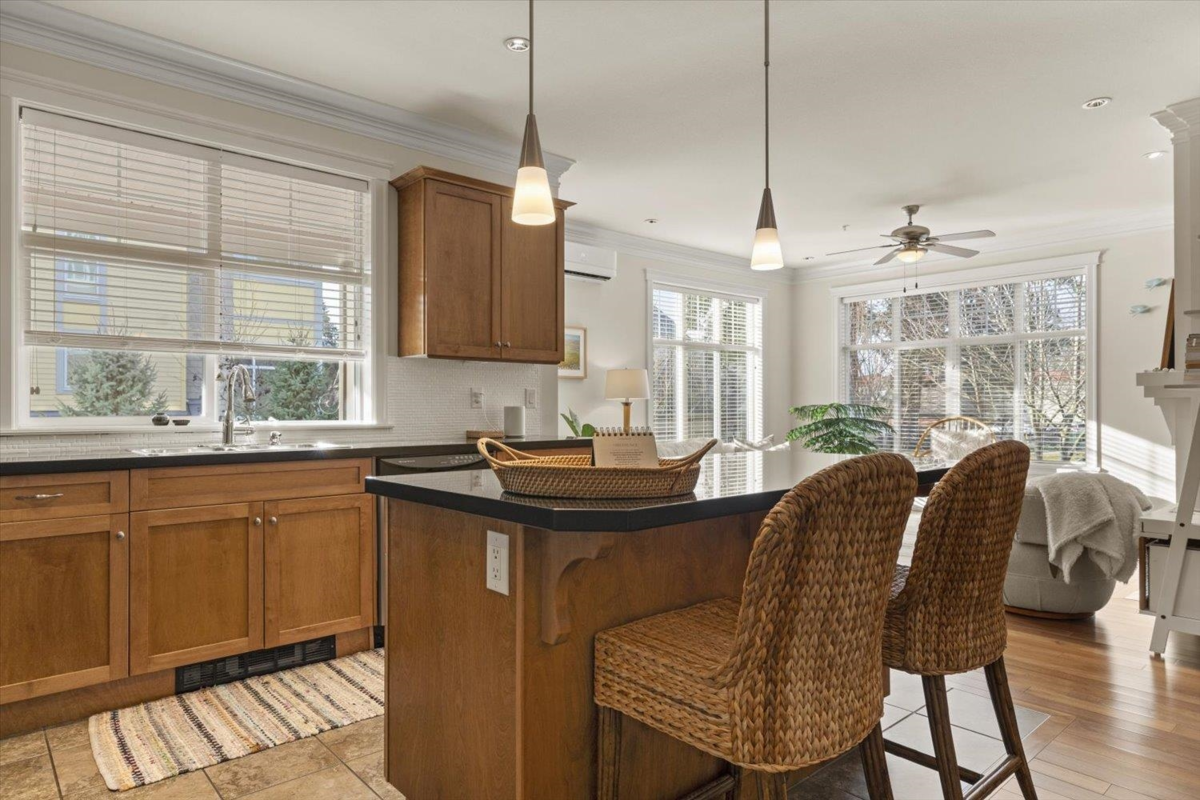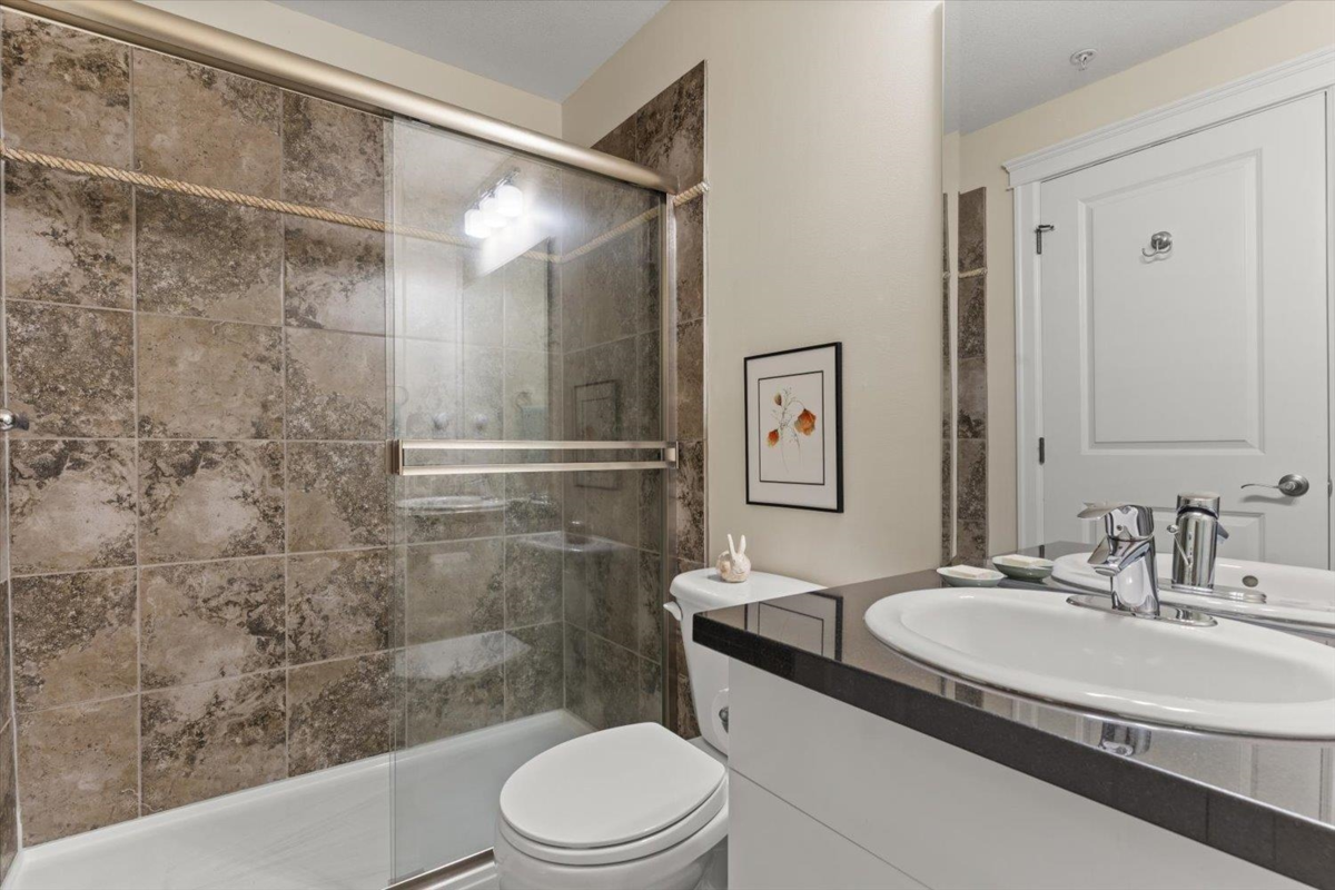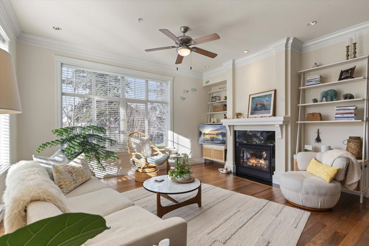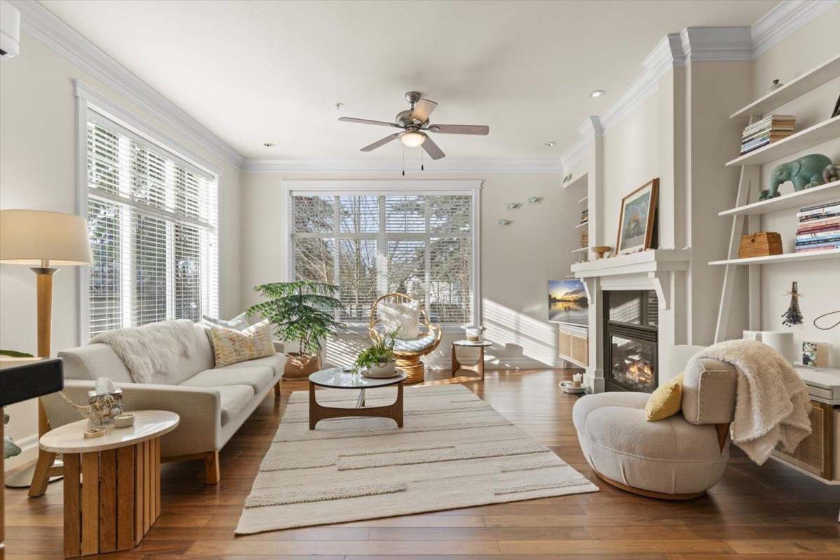 Welcome to The Hartford at Garrison Crossing! Bright and open CORNER 2 bedroom + den unit with a thoughtful layout and 9’ ceilings throughout. The SOUTHWEST-facing exposure fills the home with natural LIGHT. Beautiful Large patio ,Cozy gas fireplace, updated flooring, and a heat pump for efficient year-round comfort. Includes two parking stalls, a storage locker, plus in-suite storage room. Meticulously maintained and truly move-in ready.