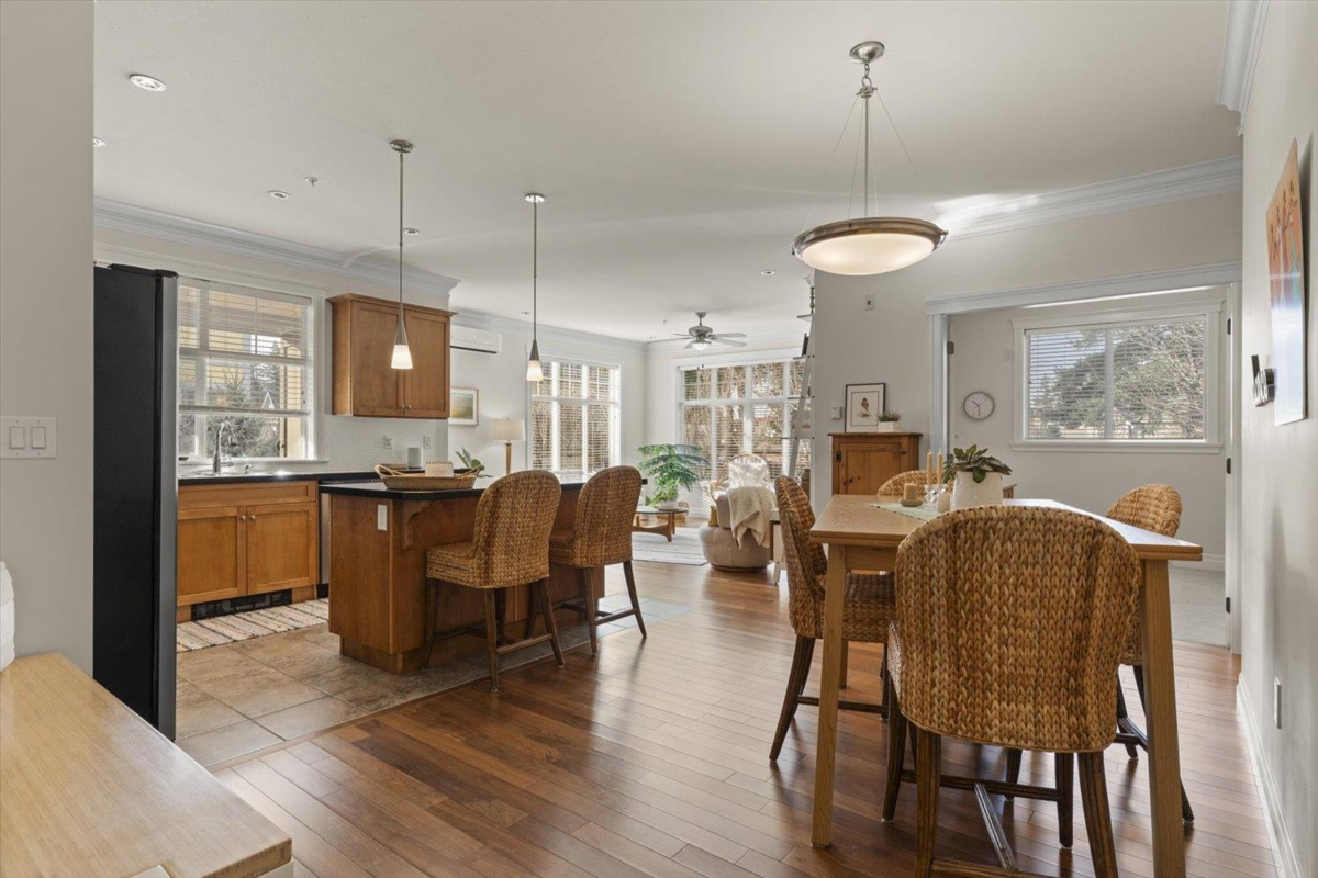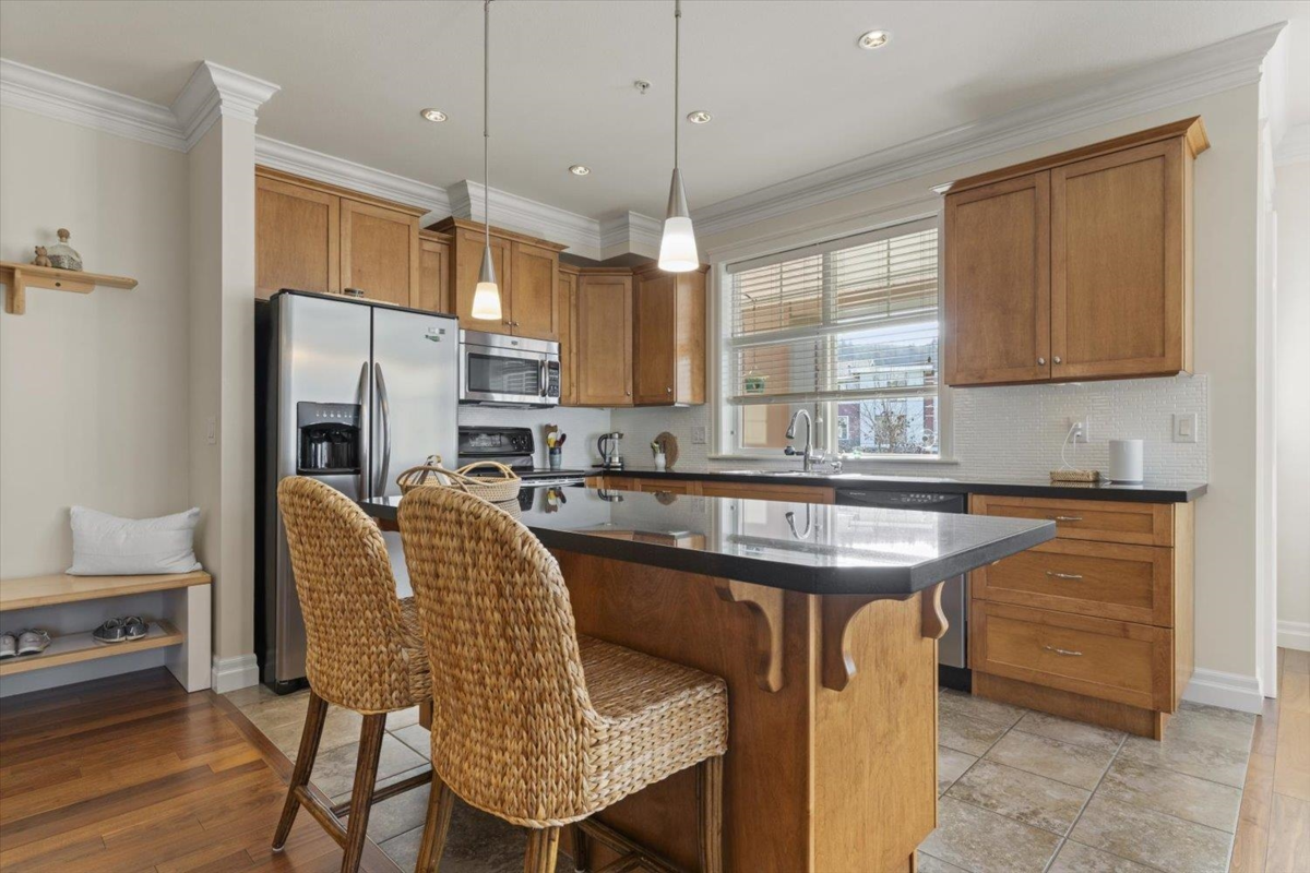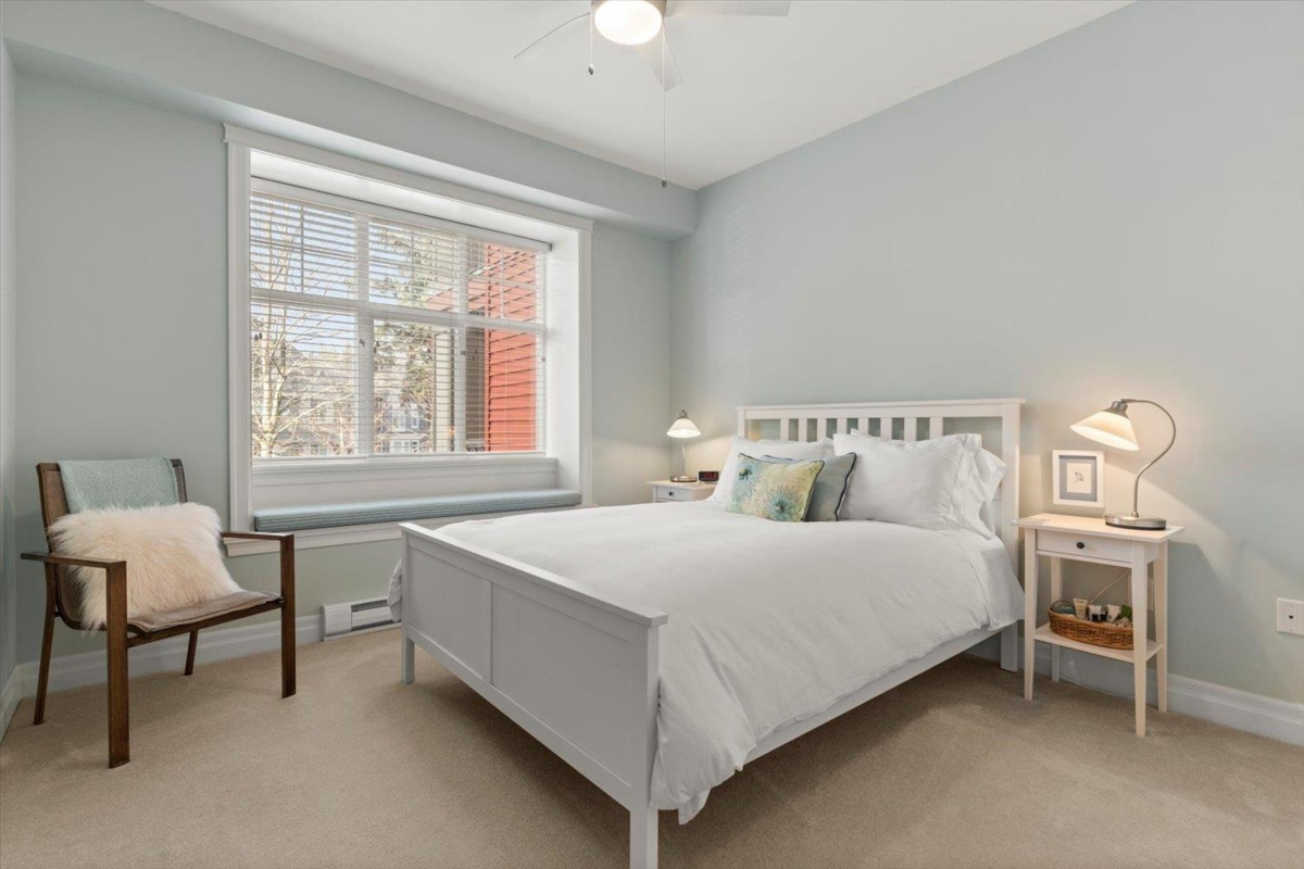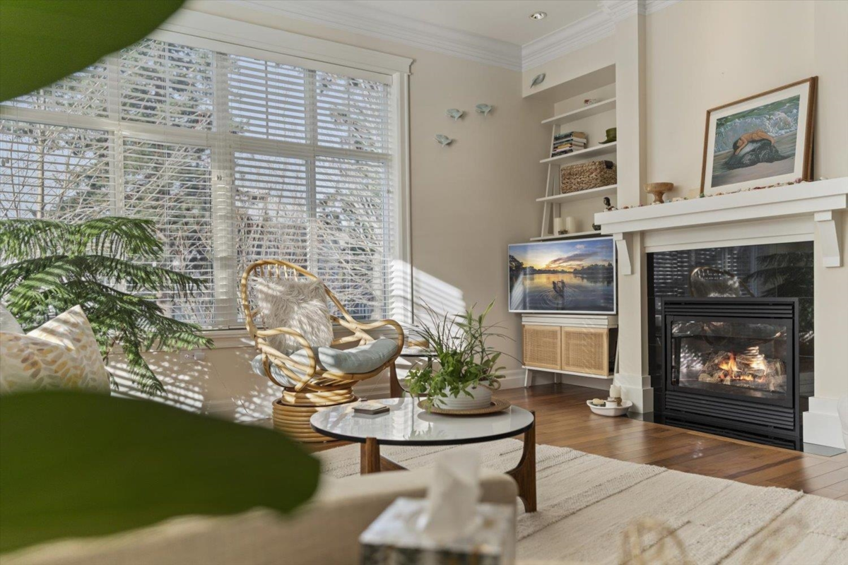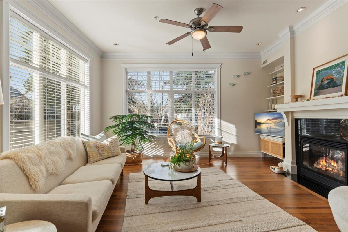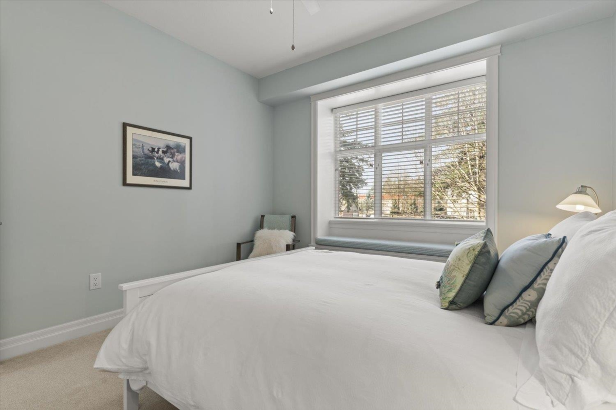 Welcome to The Hartford at Garrison Crossing! Bright and open CORNER 2 bedroom + den unit with a thoughtful layout and 9’ ceilings throughout. The SOUTHWEST-facing exposure fills the home with natural LIGHT. Beautiful Large patio ,Cozy gas fireplace, updated flooring, and a heat pump for efficient year-round comfort. Includes two parking stalls, a storage locker, plus in-suite storage room. Meticulously maintained and truly move-in ready.