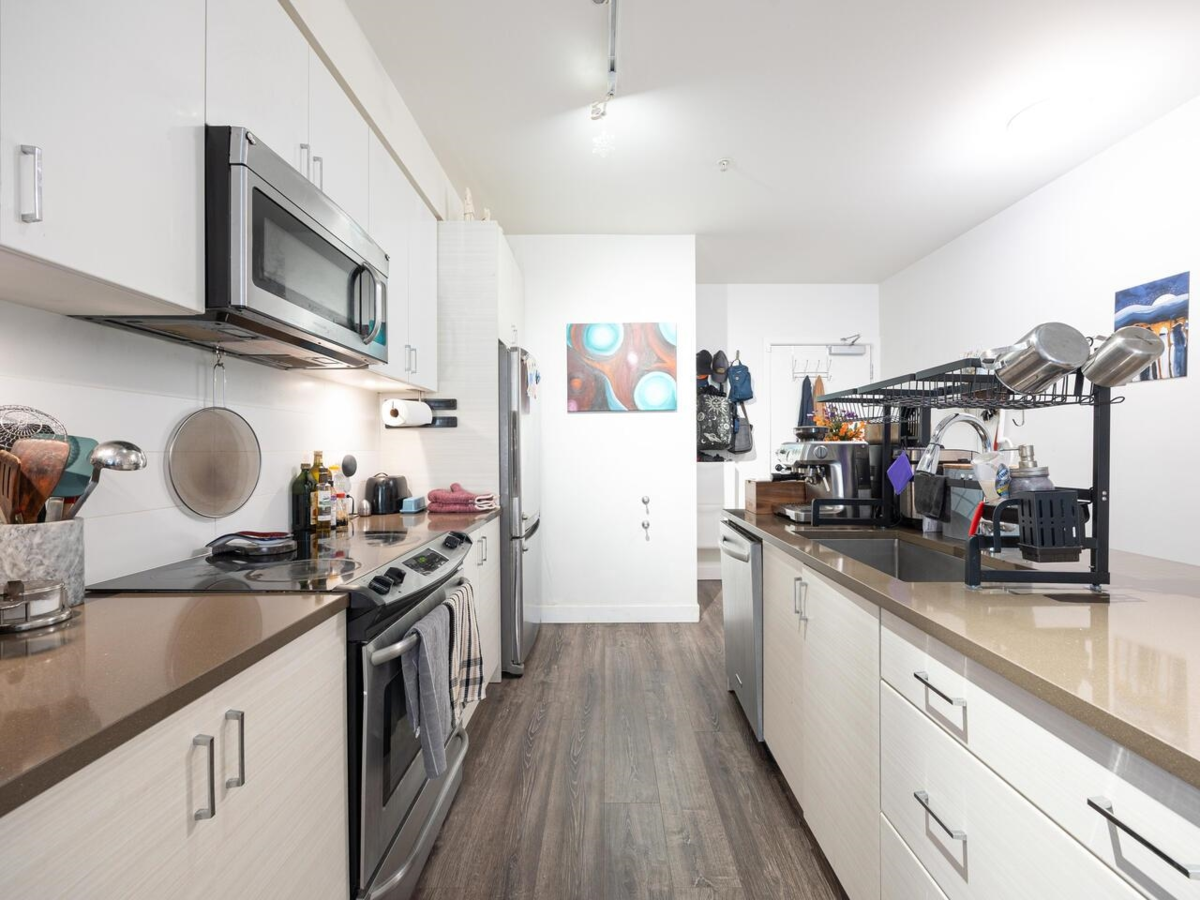 Welcome to Verve – a perfect blend of location and lifestyle! Just steps to King George SkyTrain, SFU Campus, Surrey Memorial Hospital, and Central City shopping, this 2 bed, 2 bath corner condo offers both convenience and comfort. Inside, enjoy a bright and spacious layout with upgraded vinyl flooring, a chef’s kitchen with quartz countertops, stainless steel appliances, and a large breakfast bar. The primary bedroom features double sinks and an oversized shower, while second full bath and in-suite laundry add everyday ease. Relax on your quiet patio overlooking a treed setting, away from Fraser Hwy traffic. Building perks include a full gym, yoga room, social lounge, billiards, guest suite, storage, and tandem parking.